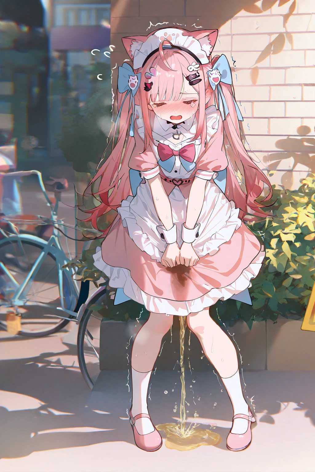 yuuki sakuna, animal ears, pink hair, cat ears, maid headdress, long hair, hair ornament, bow, animal ear fluff, ahoge, bangs, two side up, cat hair ornament, hair bow, hairclip, blue bow, pink eyes,