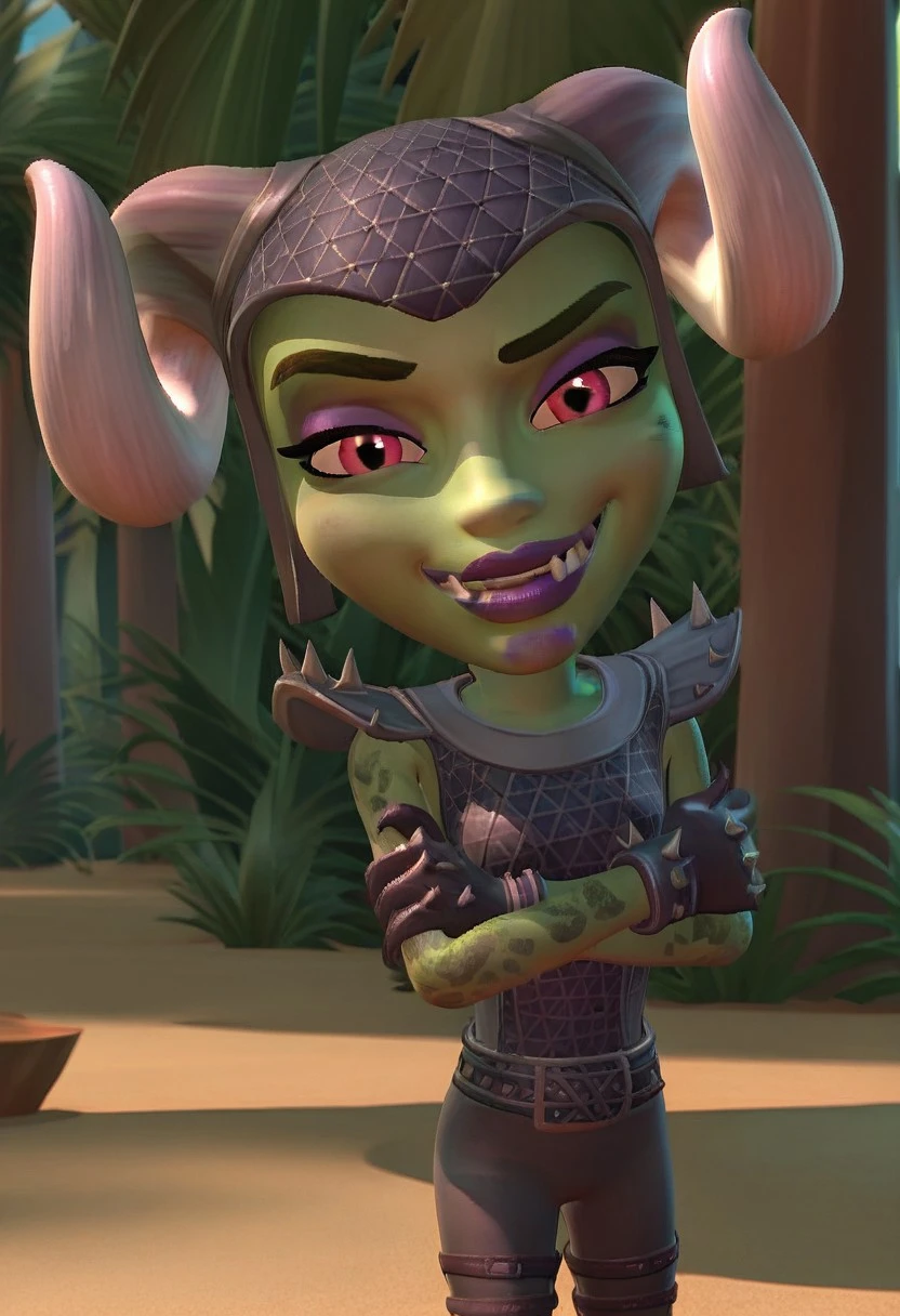 Tags: A_G_J_N, horned helmet, curled horns, green skin, alien, brown hair, fangs, purple lips, spiked pauldrons, sleeveless shirt, pants, spiked gloves, fold-over boots, spiked boots,