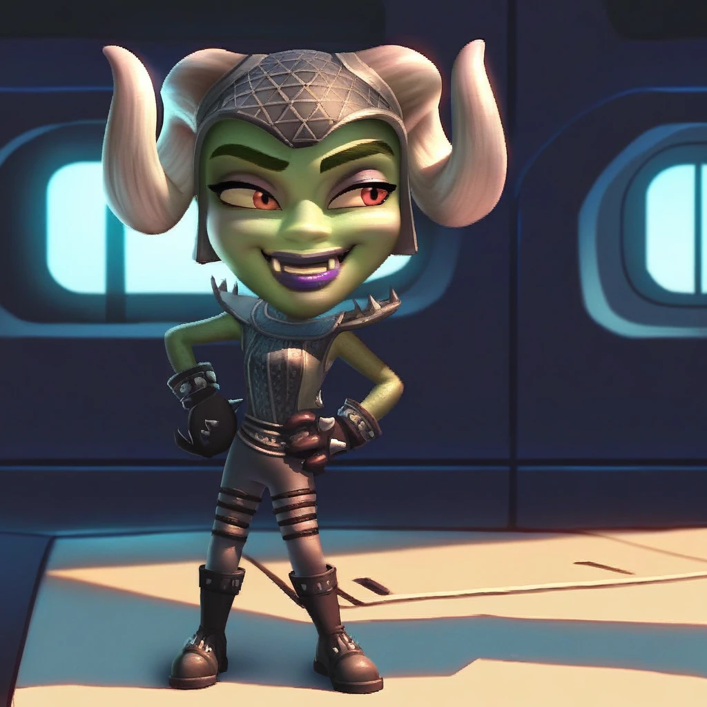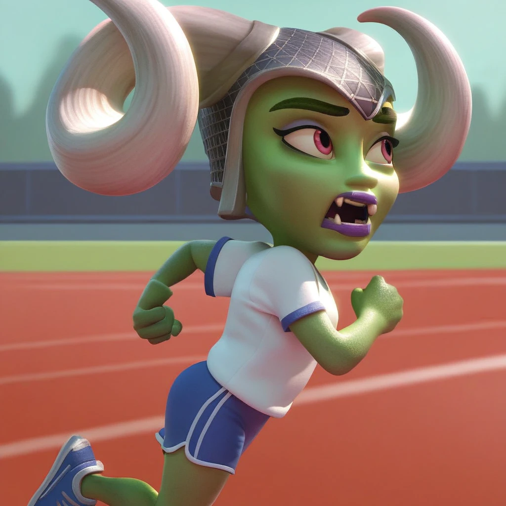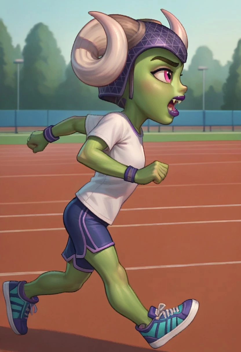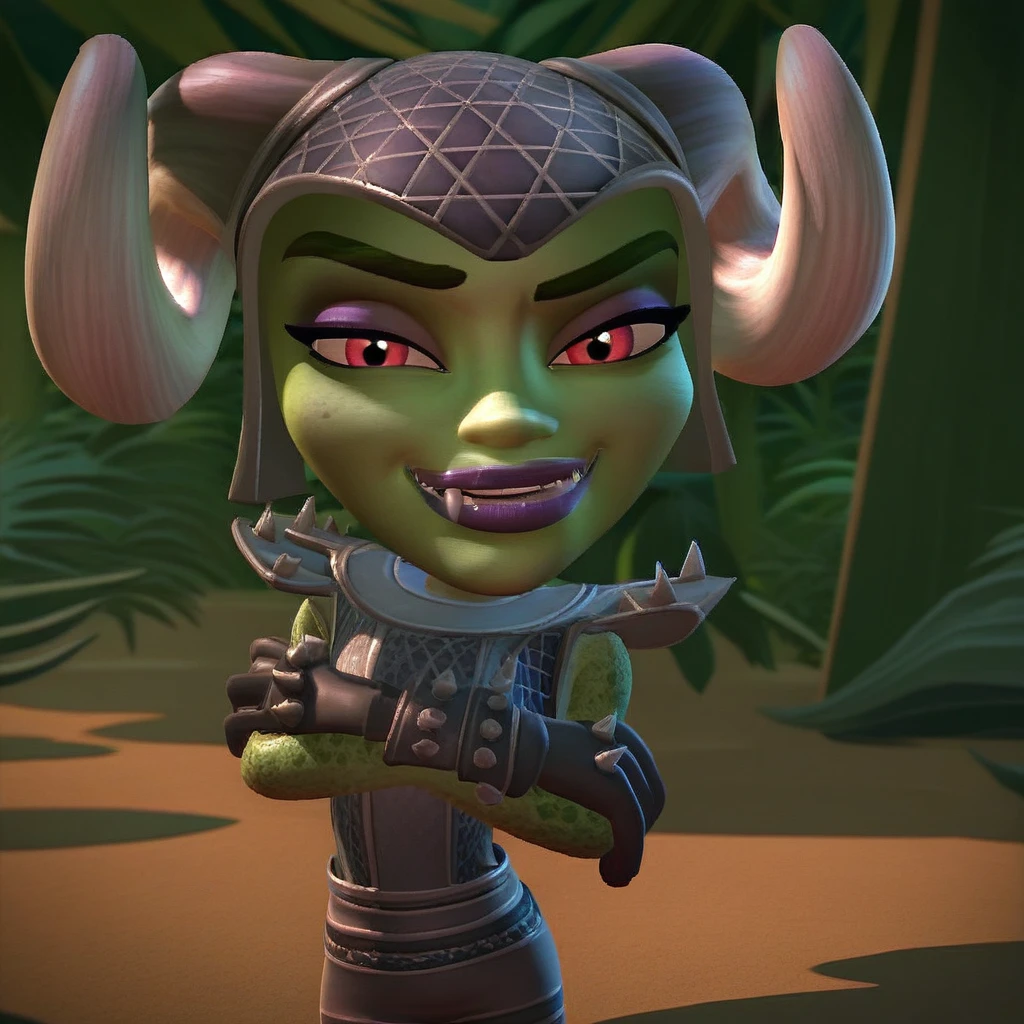 A_G_J_N, horned helmet, curled horns, green skin, alien, brown hair, fangs, purple lips,