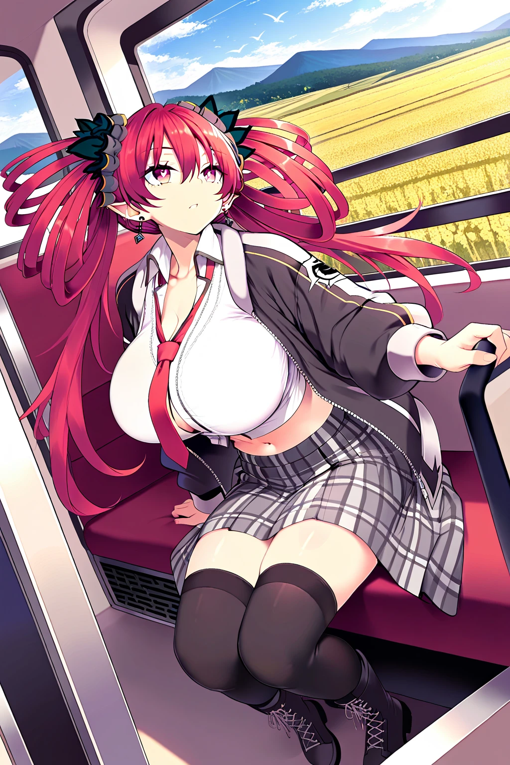 rstacd, jewelry, earrings, black hair ribbon, white cropped shirt, red necktie, black jacket, open jacket, long plaid skirt, side vent, black thighhighs, belt, thigh holster, boots,