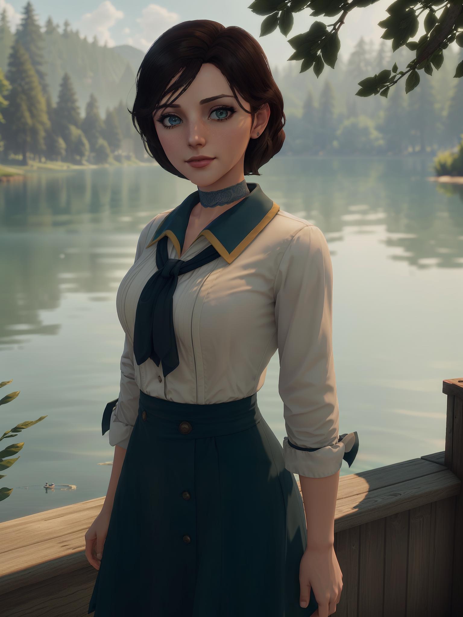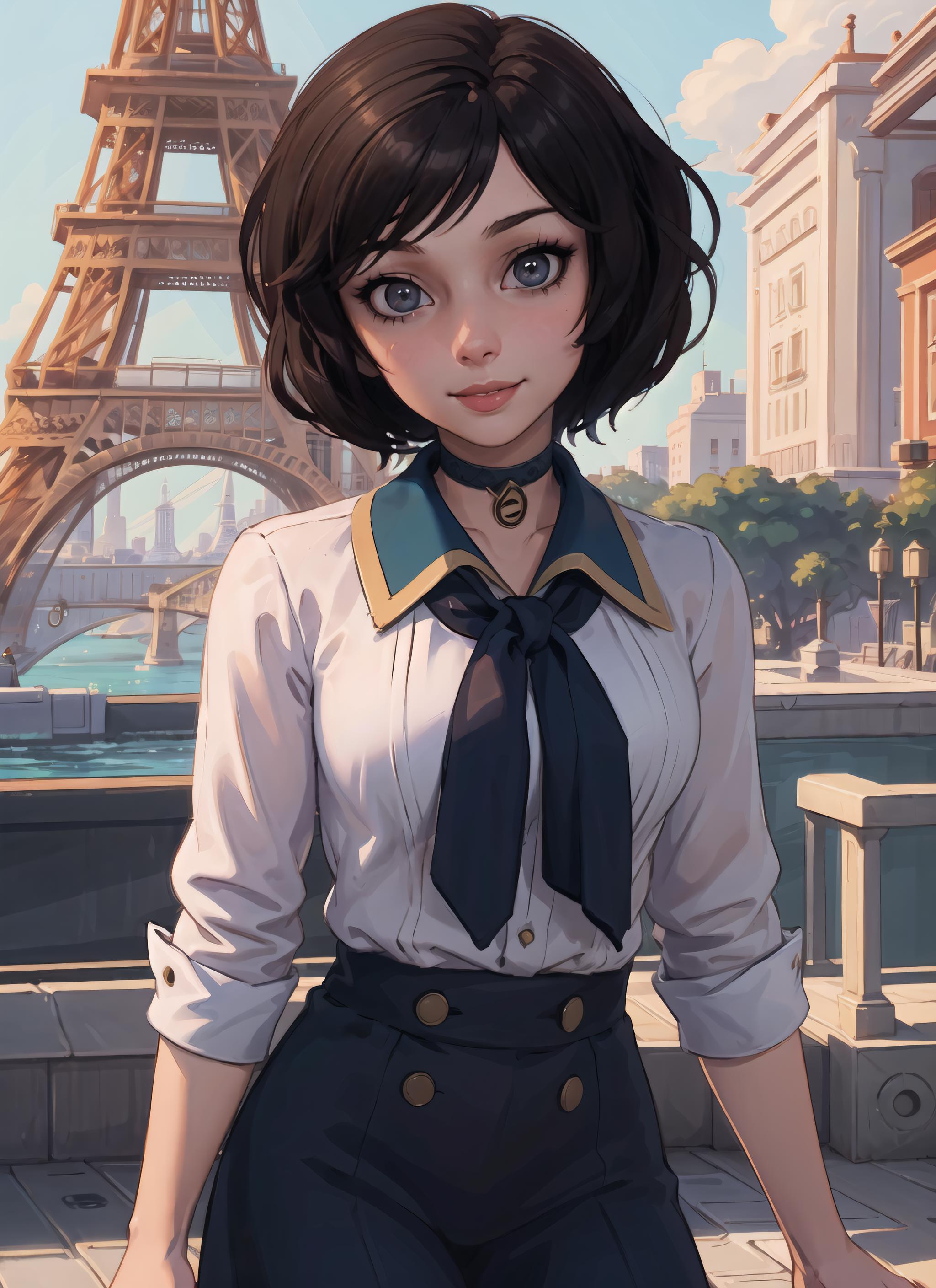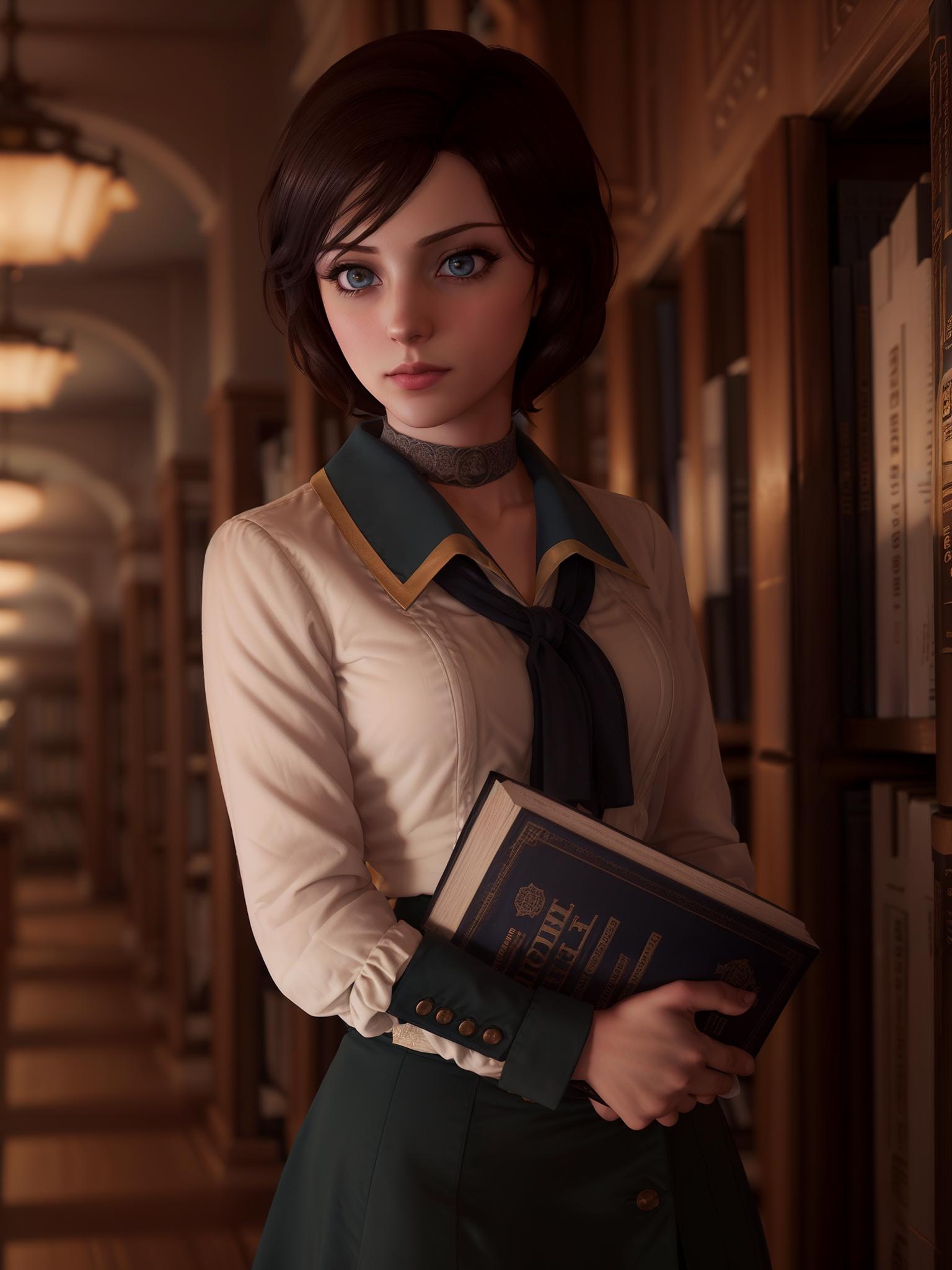 Example promts; bioshockelizabeth standing in front of a city / bioshockelizabeth holding a book in a library / bioshockelizabeth standing next to a lake.