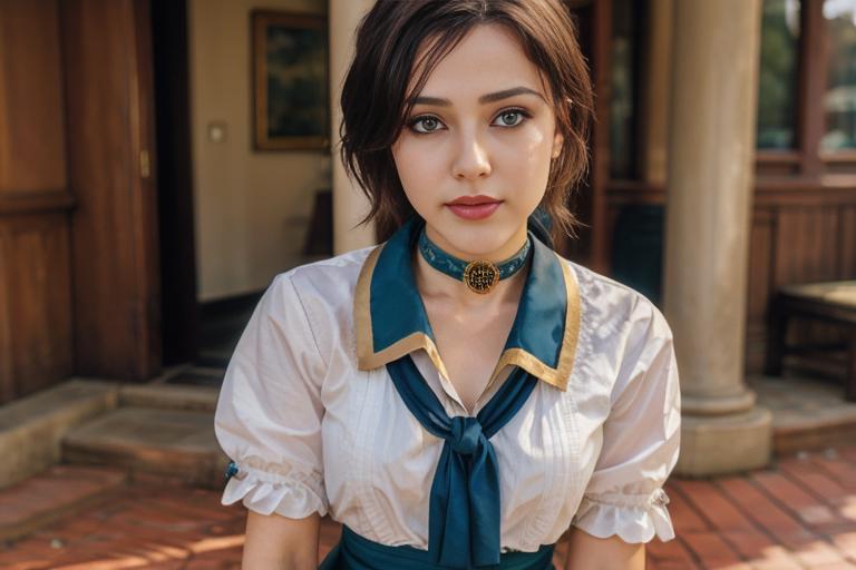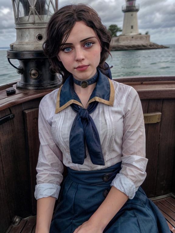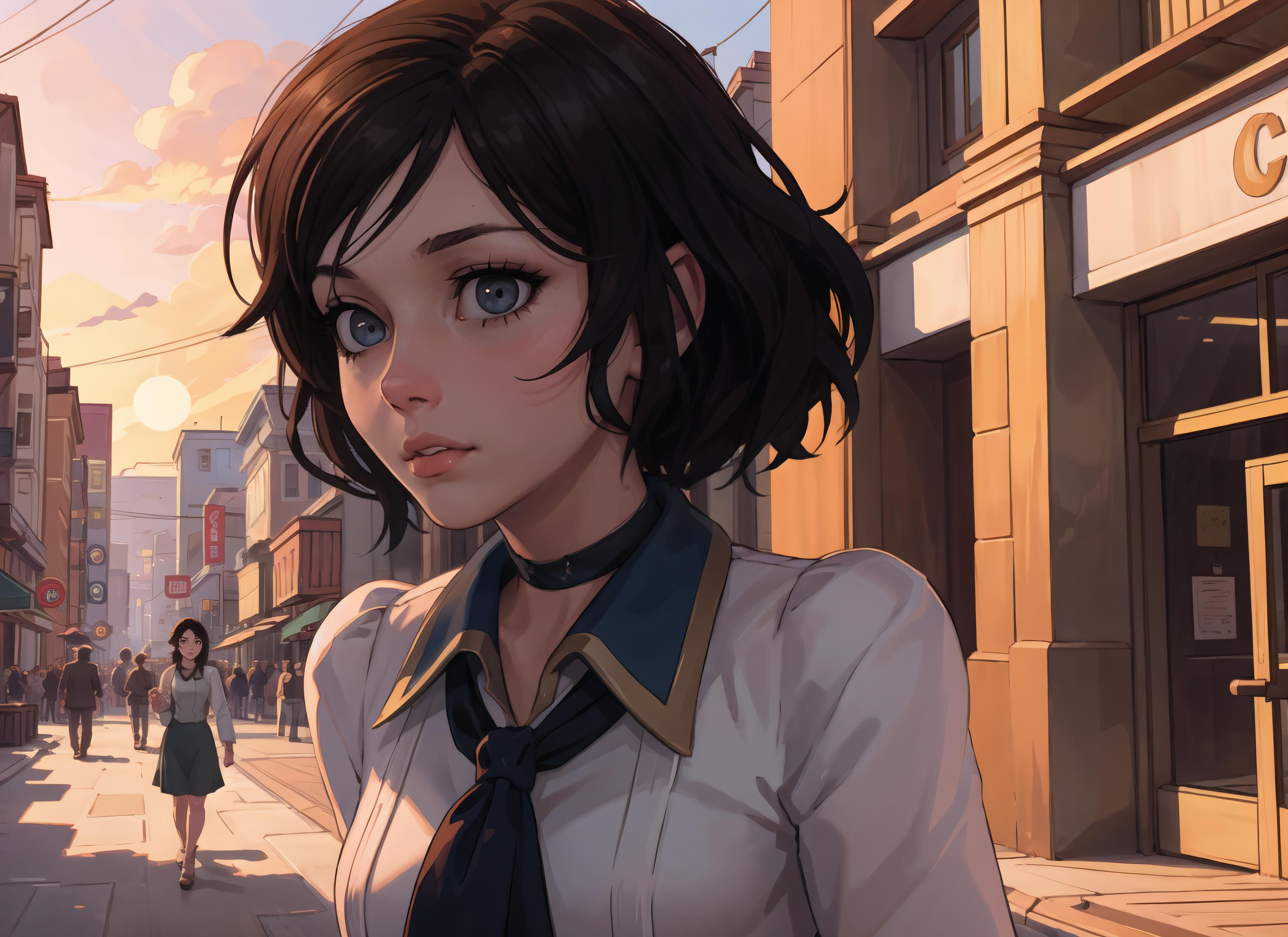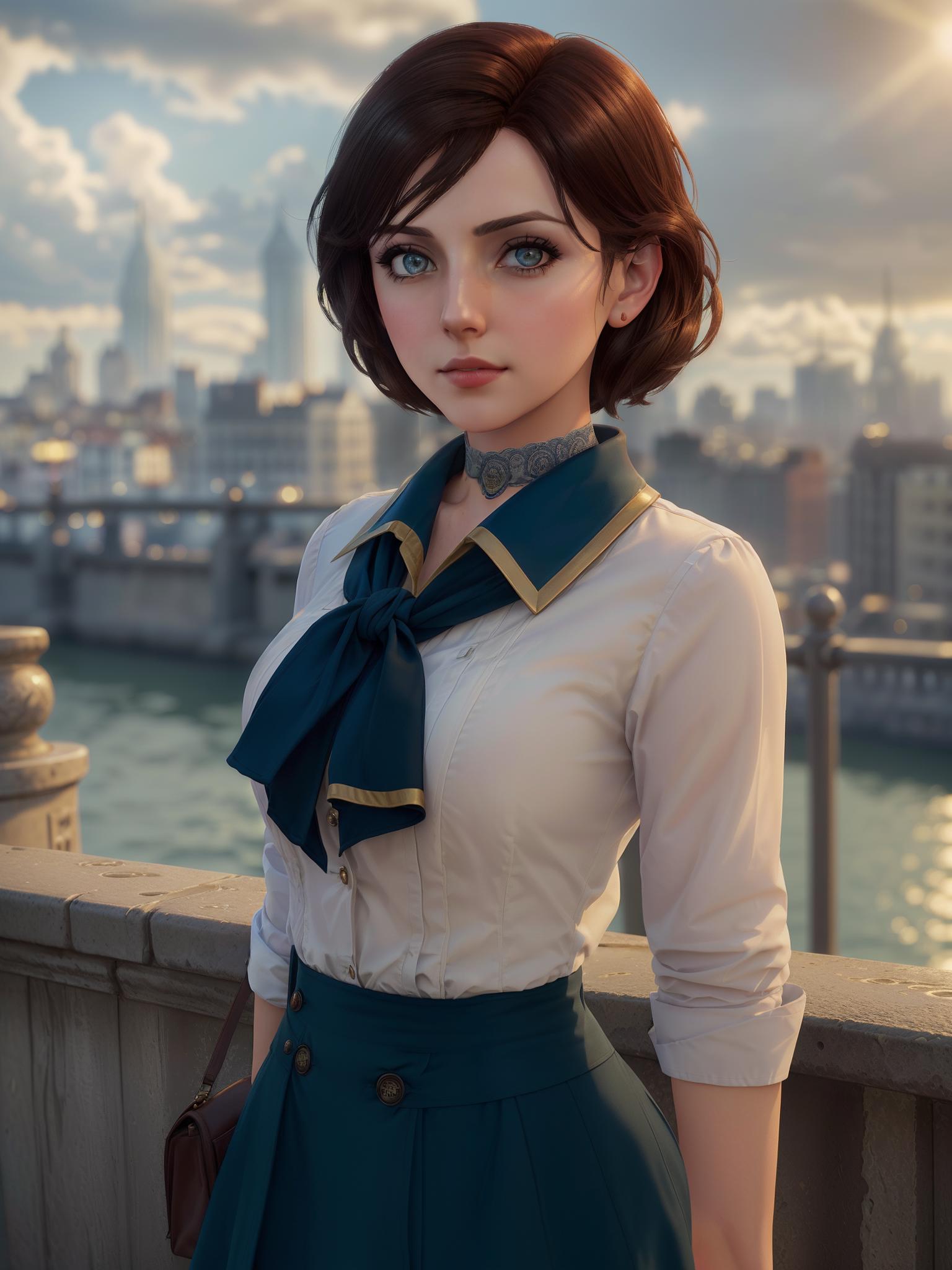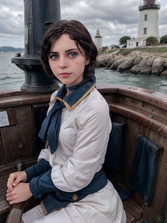 Example promts; bioshockelizabeth standing in front of a city / bioshockelizabeth holding a book in a library / bioshockelizabeth standing next to a lake.