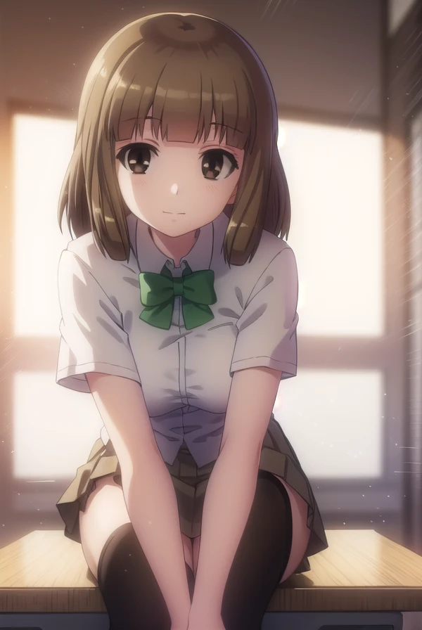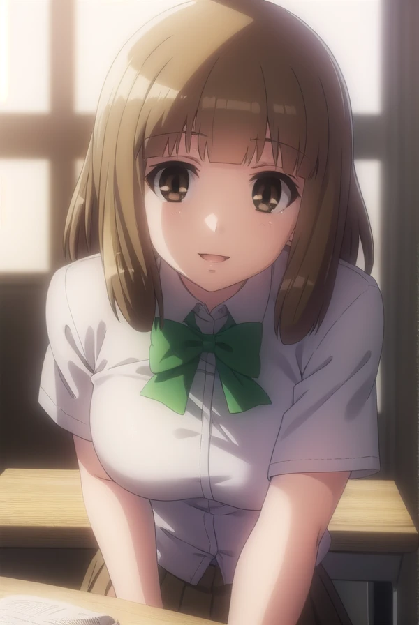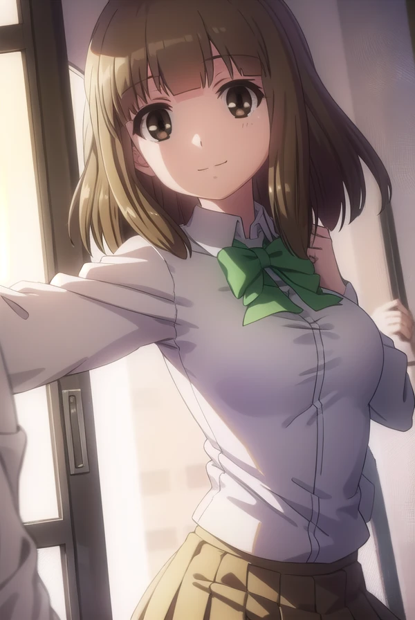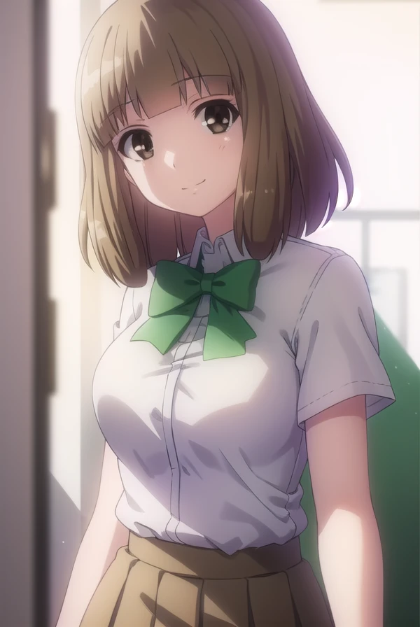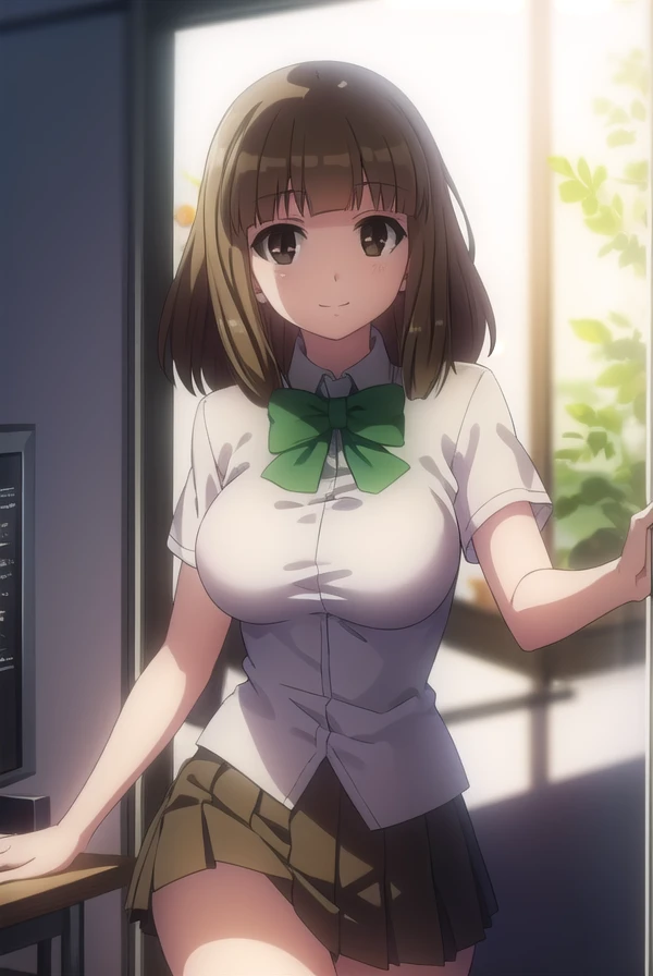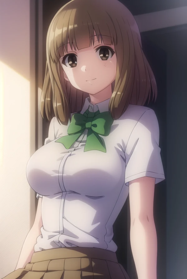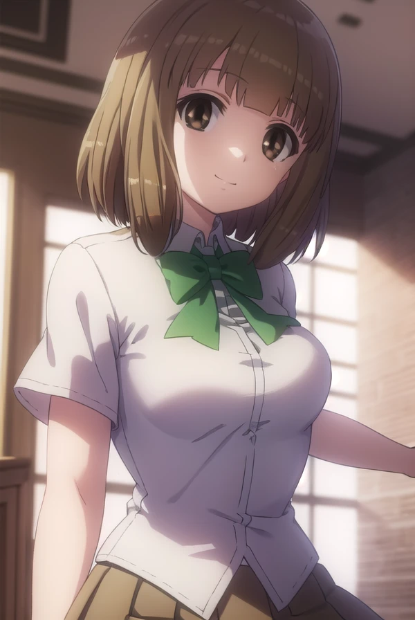 skirt, school uniform, bow, bowtie, green bowtie, shirt, white shirt, collared shirt, short sleeves, pleated skirt, brown skirt,