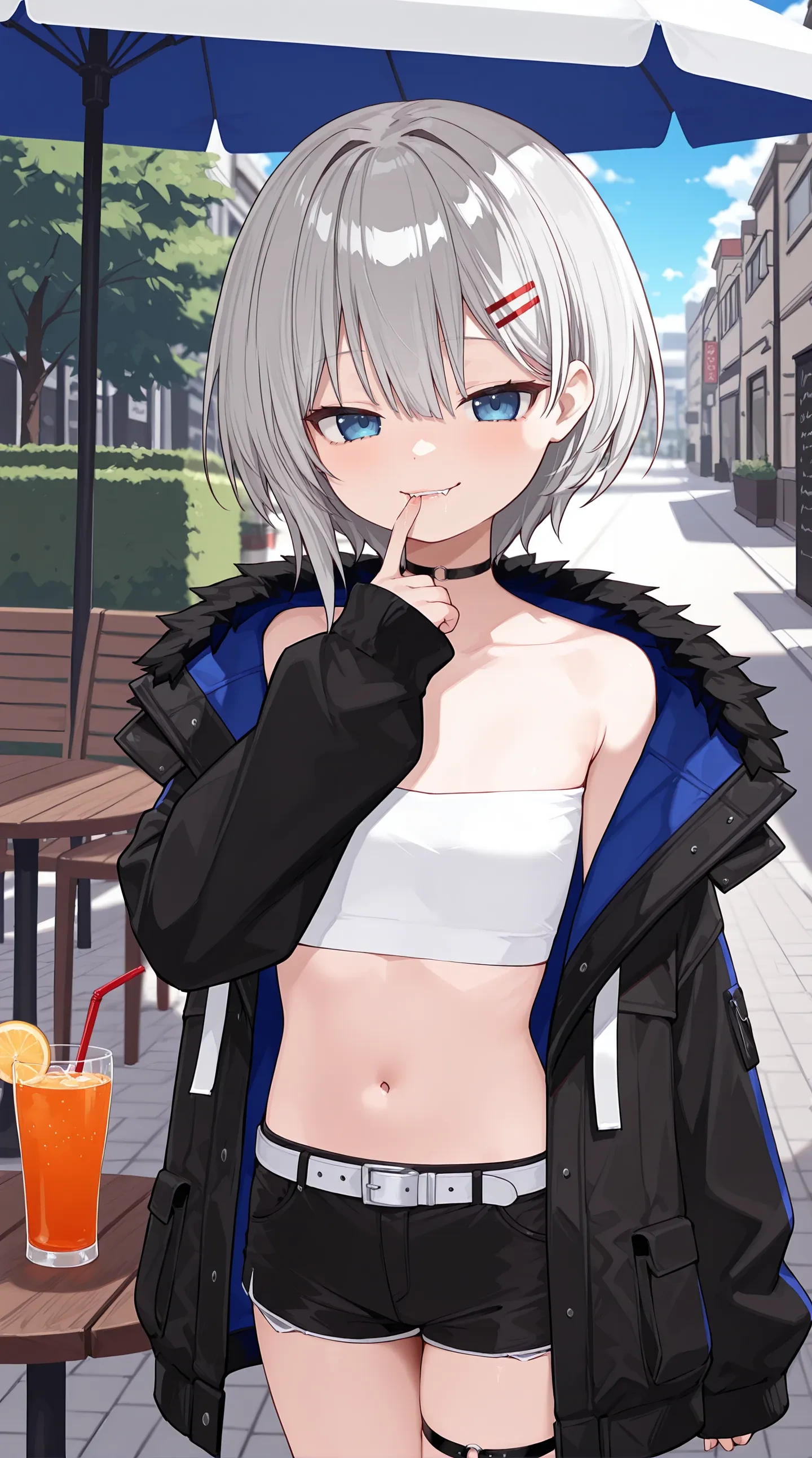 FIRST STYLE: LunaRurine, 1girl, shorts, black_shorts, hairclip, hood, belt, black_choker, blue_eyes, hair_ornament, choker, fur_trim, fur-trimmed_hood, thigh_strap, animal_hood, virtual_youtuber, midriff, jacket, white_belt, navel, collarbone, short_hair, hooded_jacket, tube_top, o-ring_choker, short_shorts, shirt, black_jacket, buckle, animal_ears, crop_top, open_clothes, sleeves_past_wrists, bandeau, hood_up, white_shirt, belt_buckle, two-sided_fabric, long_sleeves, bangs, fake_animal_ears, multicolored_clothes, grey_hair, o-ring, stomach, open_jacket, strapless, hair_between_eyes