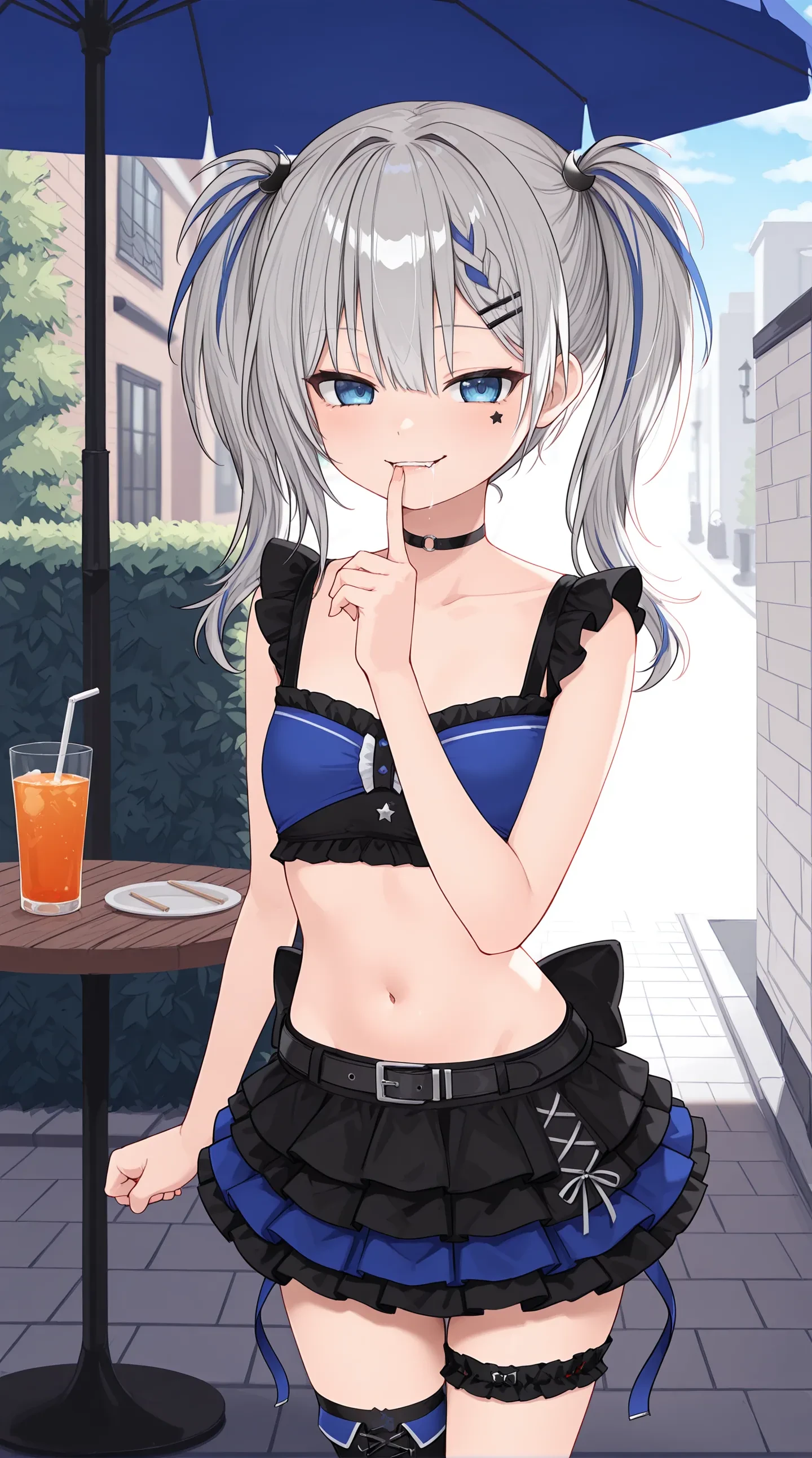 SECOND STYLE: LunaRurine2nd, 1girl, crescent, crescent_hair_ornament, skirt, multicolored_hair, paw_gloves, gloves, thighhighs, cross-laced_footwear, black_choker, heart, frills, animal_hands, blue_hair, single_thighhigh, choker, o-ring_choker, grey_hair, collarbone, multicolored_skirt, black_footwear, frilled_skirt, belt, virtual_youtuber, lace-up_boots, streaked_hair, boots, navel, layered_skirt, hair_ornament, blue_eyes, midriff, o-ring, looking_at_viewer, braid, facial_mark, miniskirt, bridal_garter, open_mouth, shirt, twintails, bow, black_skirt, bangs, croptop, star(symbol), long_hair, official_alternate_costume, multicolored_clothes, black_bow, black_belt, heart_choker, fang, asymmetrical_legwear, bare_shoulders, black_thighhighs, sidelocks, hair_between_eyes, pleated_skirt, hairclip, two-tone_hair, thigh_strap, star_print, buckle, tachi-e, breasts, stomach, back_bow, star_hair_ornament, belt_buckle