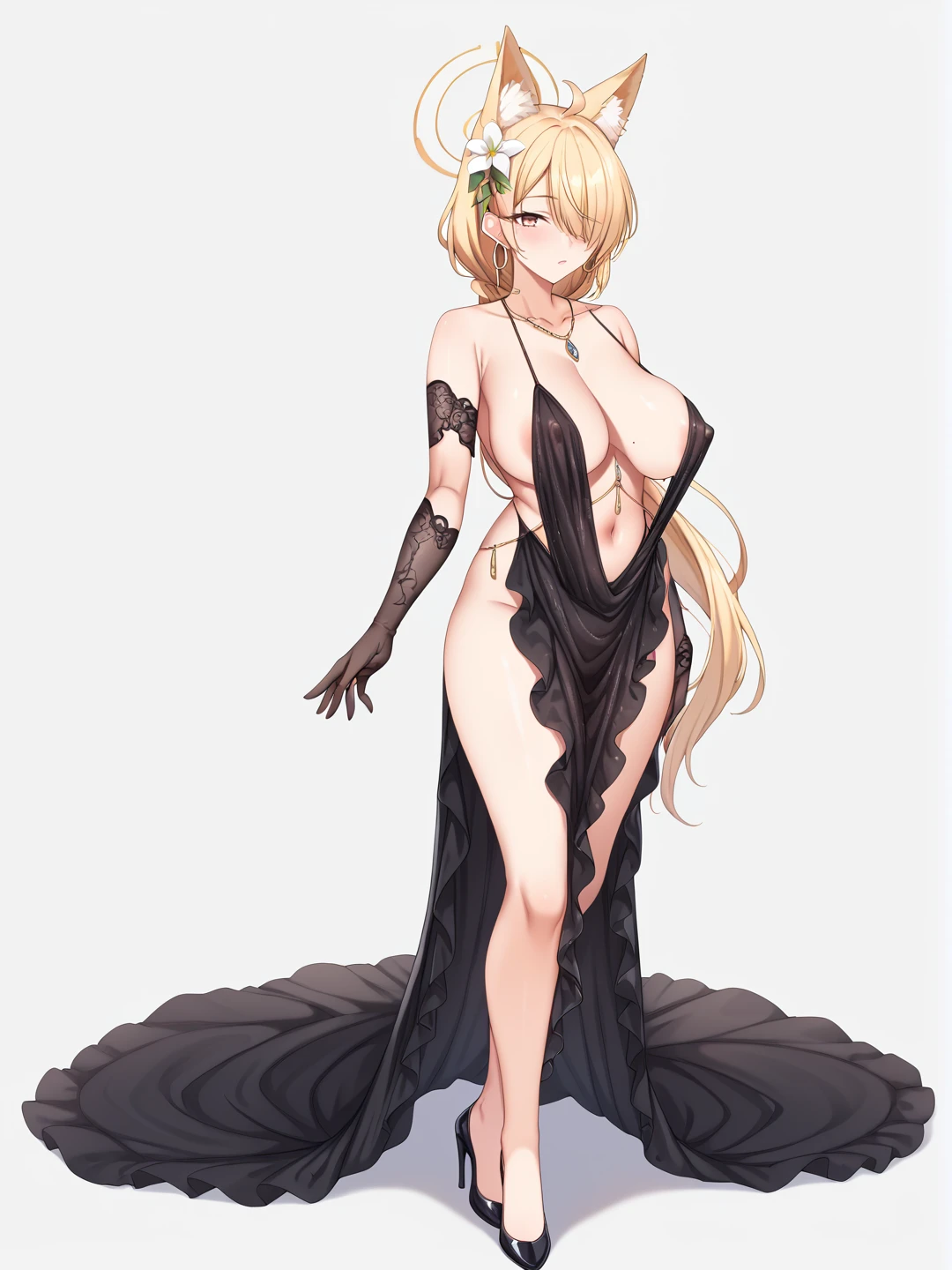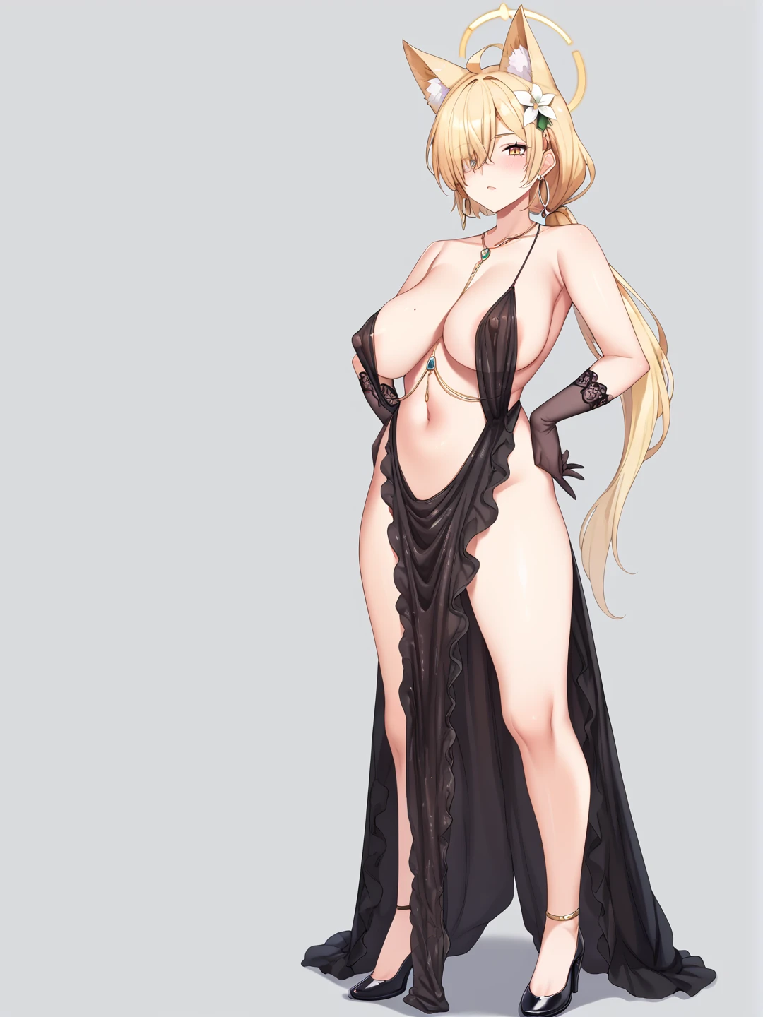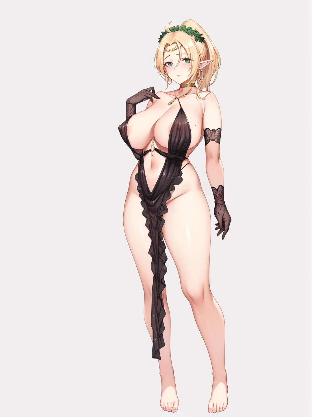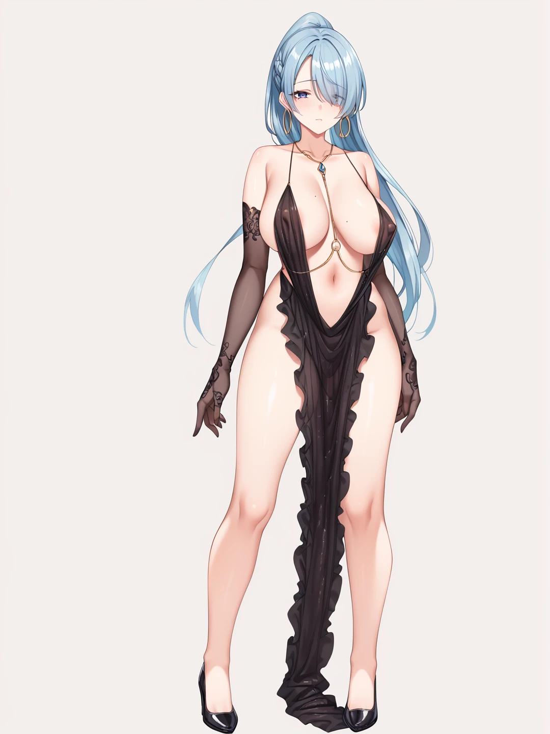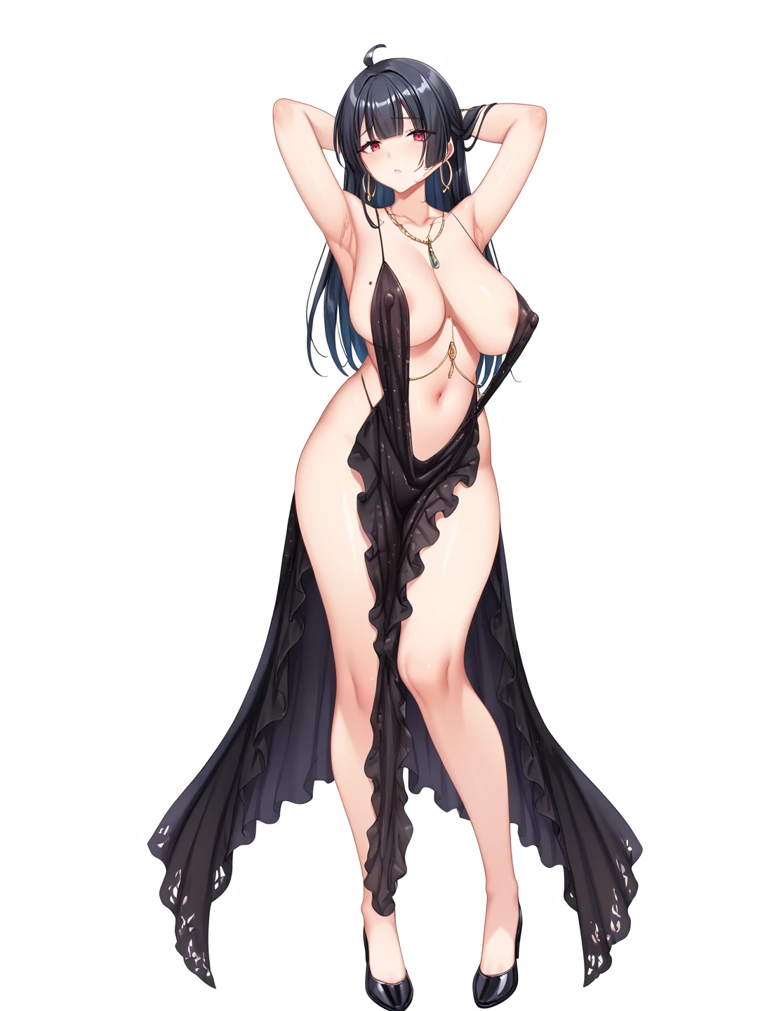 1girl, large breasts, dress, navel, cleavage, bare shoulders, jewelry, thighs, earrings, necklace, black dress, covered nipples, high, revealing clothes, areola slip, mole on breast, hoop earrings,lace trim, lace, areola slip,gloves