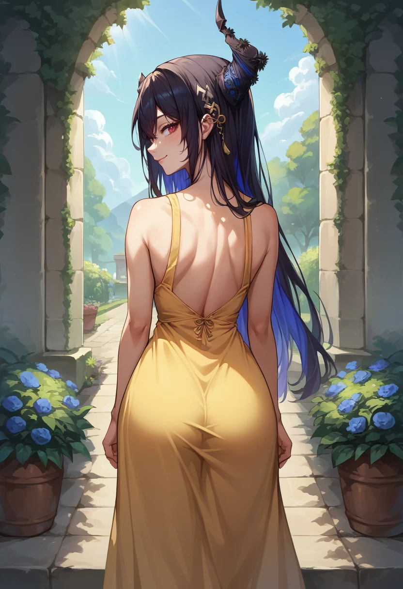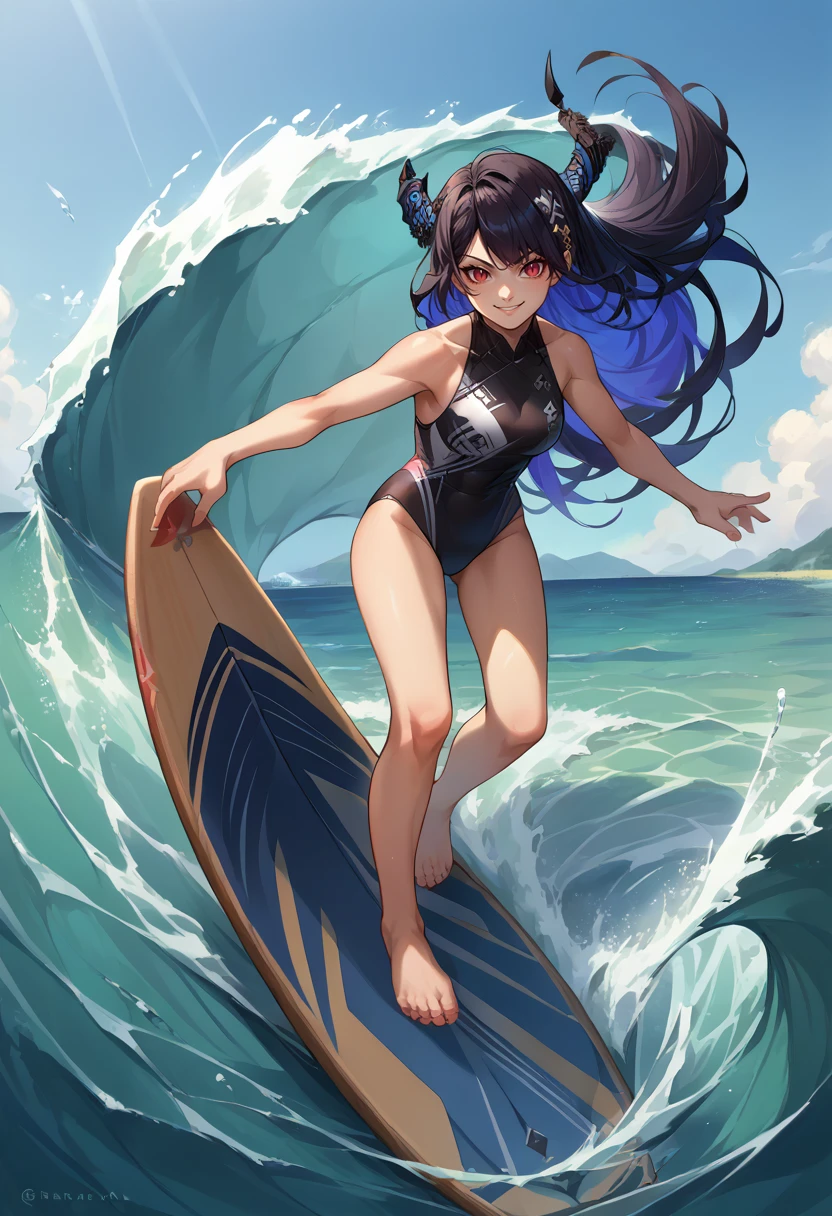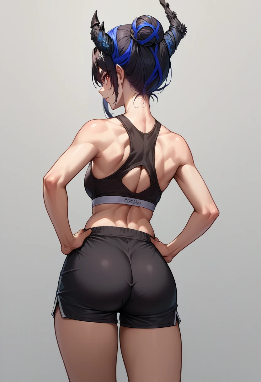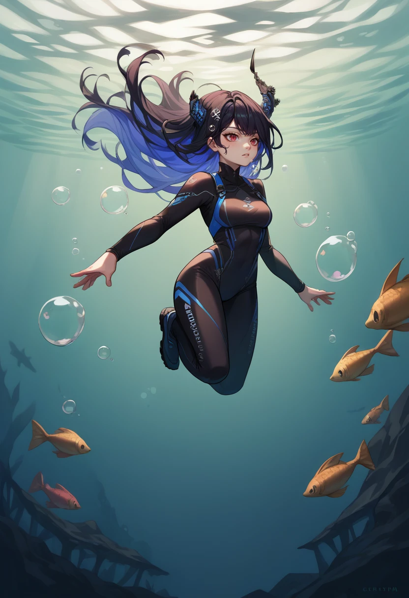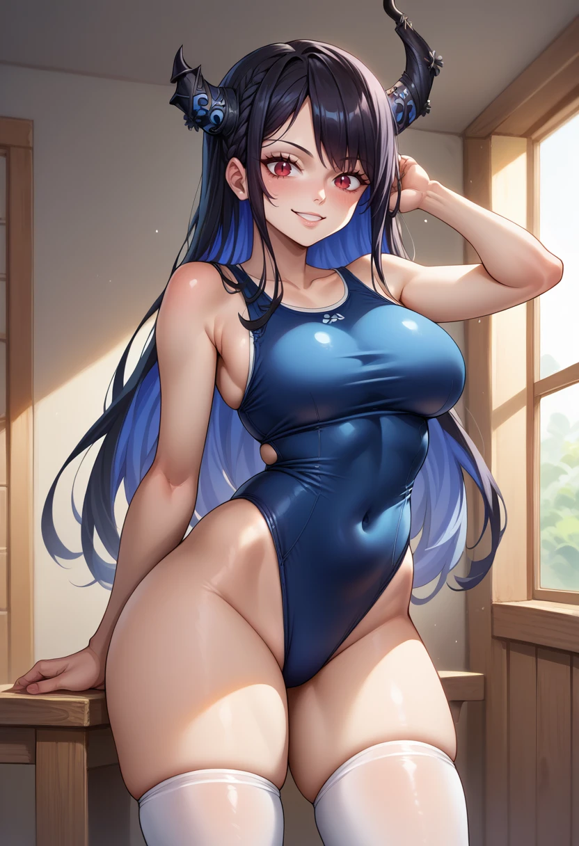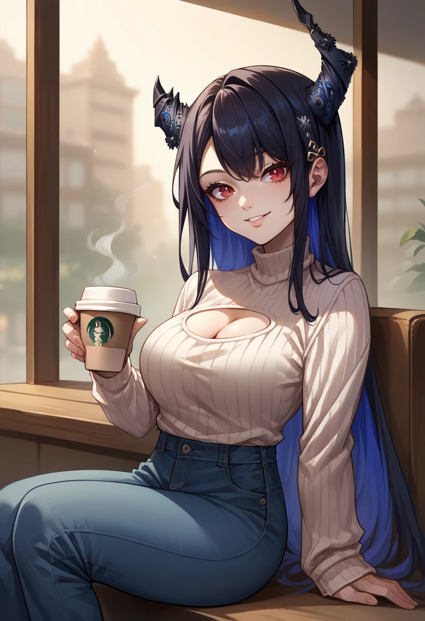 NerissaRavencroft, colored inner hair, black hair, blue hair, red eyes, slit pupils, uneven horns, long hairBase outfit: