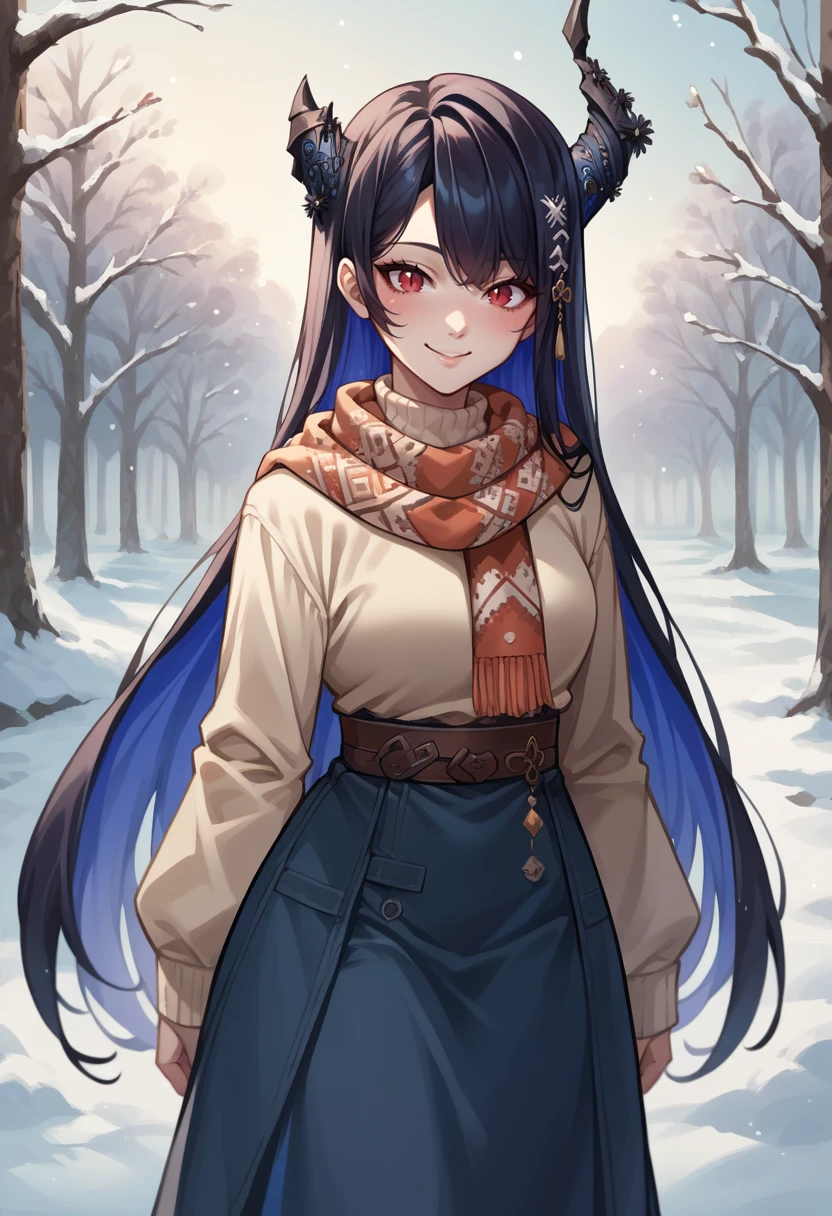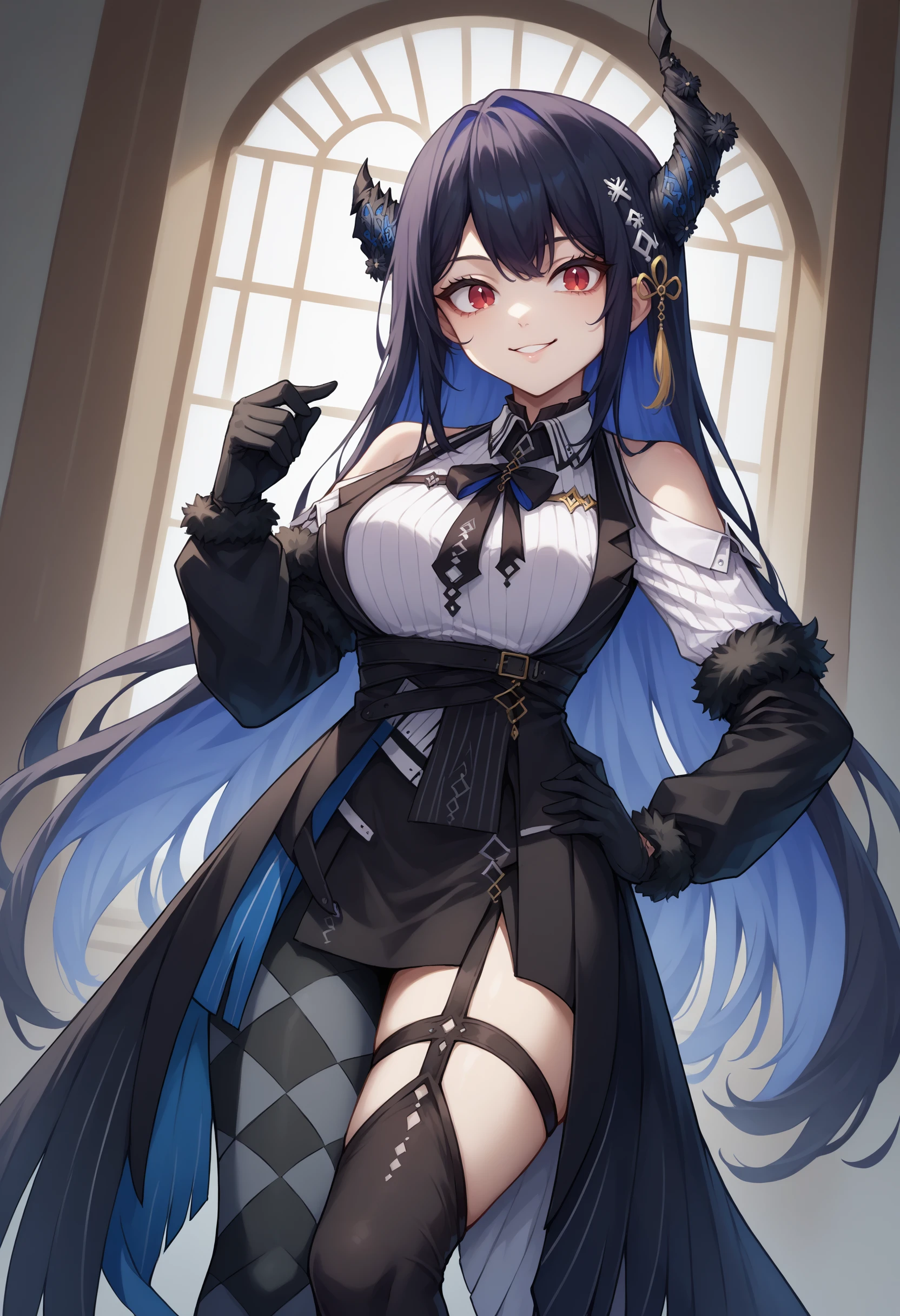 NerissaBase, colored inner hair, black hair, blue hair, red eyes, slit pupils, uneven horns, long hair, hair ornament, black ribbon, fur-trimmed sleeves, black sleeves, collared shirt, white shirt, ribbed shirt, shoulder cutout, black gloves, black skirt, miniskirt, side slit, singe leg pantyhose, checkered pantyhose, black thighhighs, asymmetrical legwearNew Year's outfit: