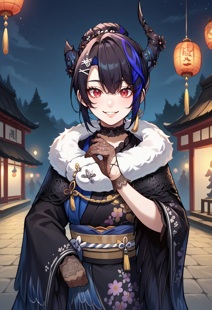 NerissaNewYears, streaked hair, black hair, blue hair, red eyes, slit pupils, uneven horns, hair bun, hair flowers, hairclip, tassel earrings, frilled choker, black kimono, feather-trimmed kimono, floral print, white fur scarf, black lace gloves