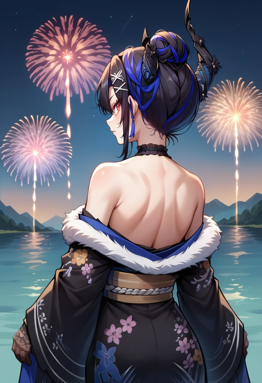 NerissaNewYears, streaked hair, black hair, blue hair, red eyes, slit pupils, uneven horns, hair bun, hair flowers, hairclip, tassel earrings, frilled choker, black kimono, feather-trimmed kimono, floral print, white fur scarf, black lace glovesLet me know if you have any issues.