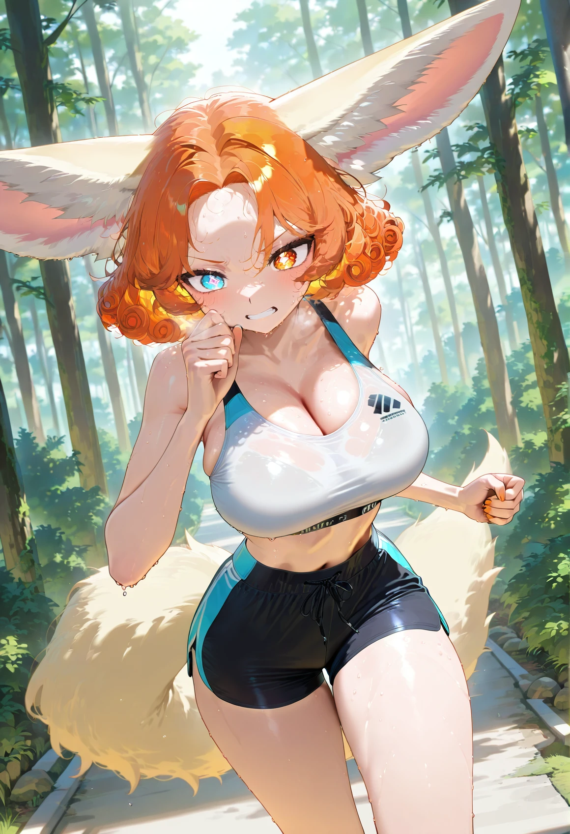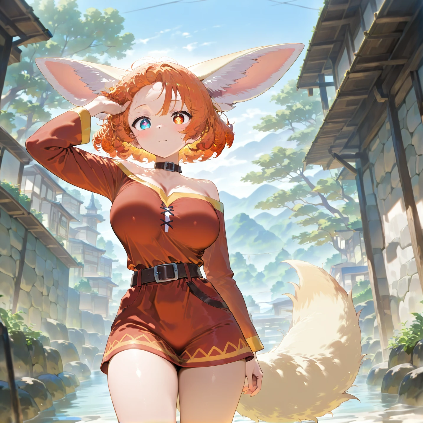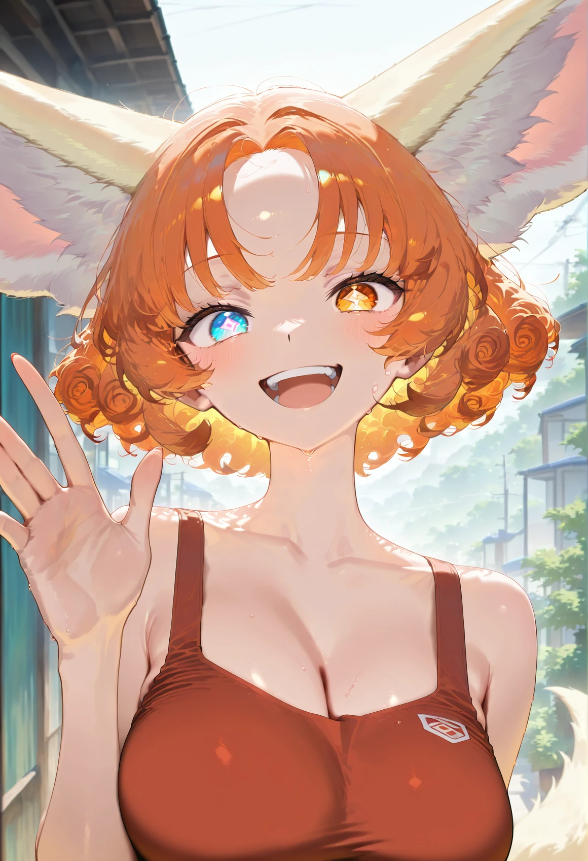 Zara Orange, fennec girl, fennec tail, heterochromia eyes, rhombus shaped pupils,(((adult))), short curly hair, bangs, short hair