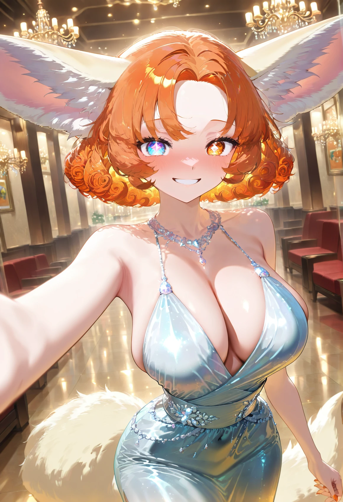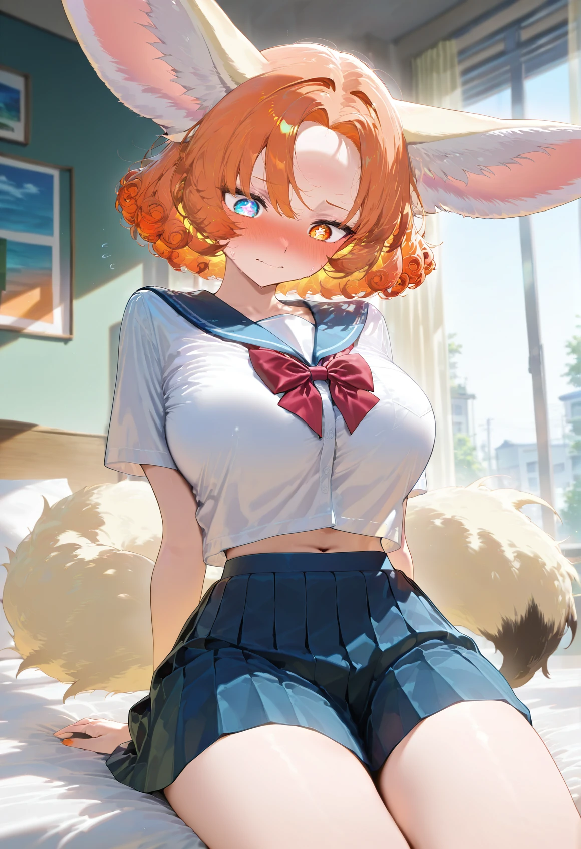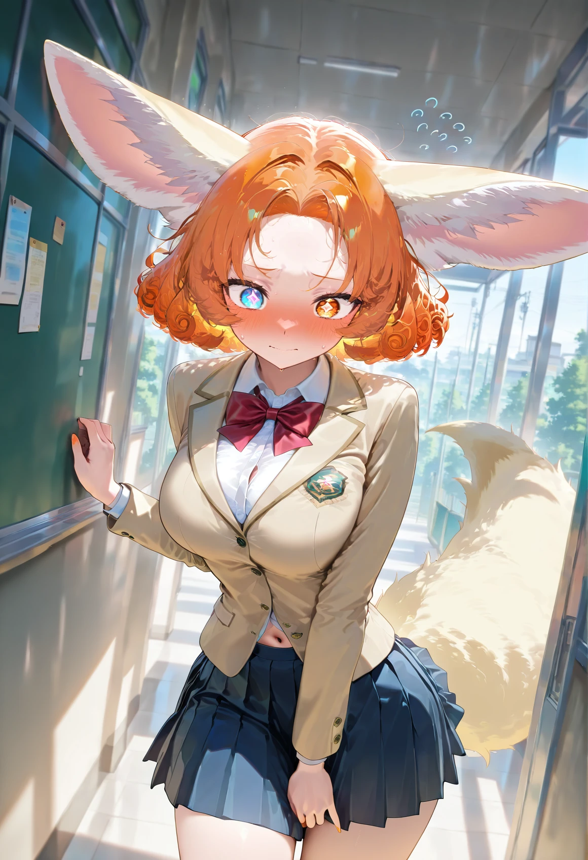 Zara Orange, fennec girl, fennec tail, heterochromia eyes, rhombus shaped pupils,(((adult))), short curly hair, bangs, short hair