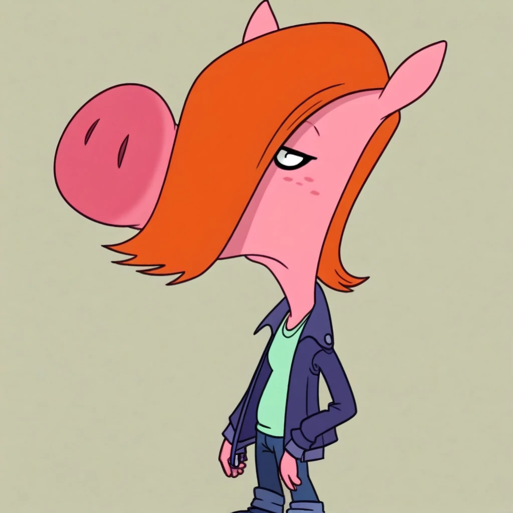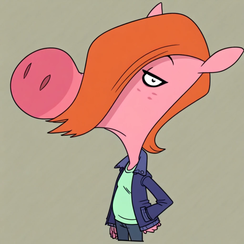 pig girl, pink skin, hair over one eye, orange hair, jacket, shirt