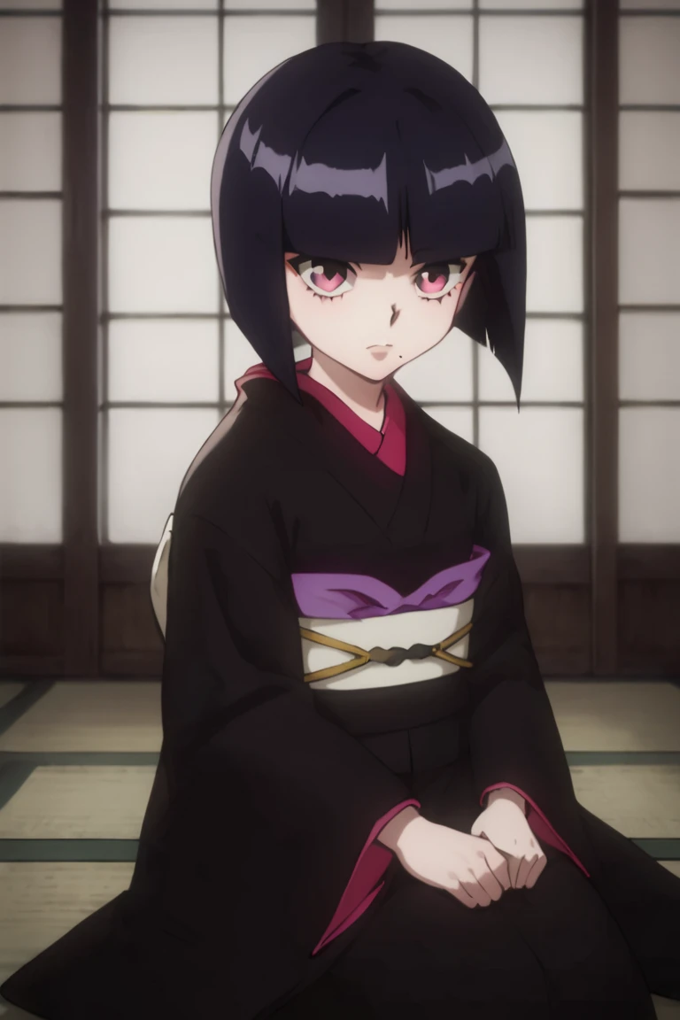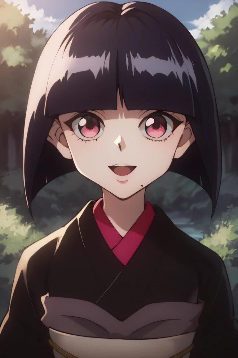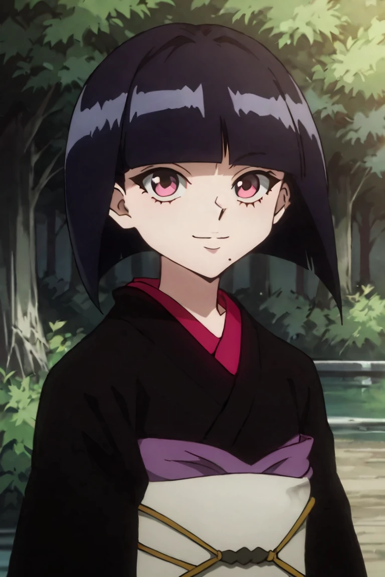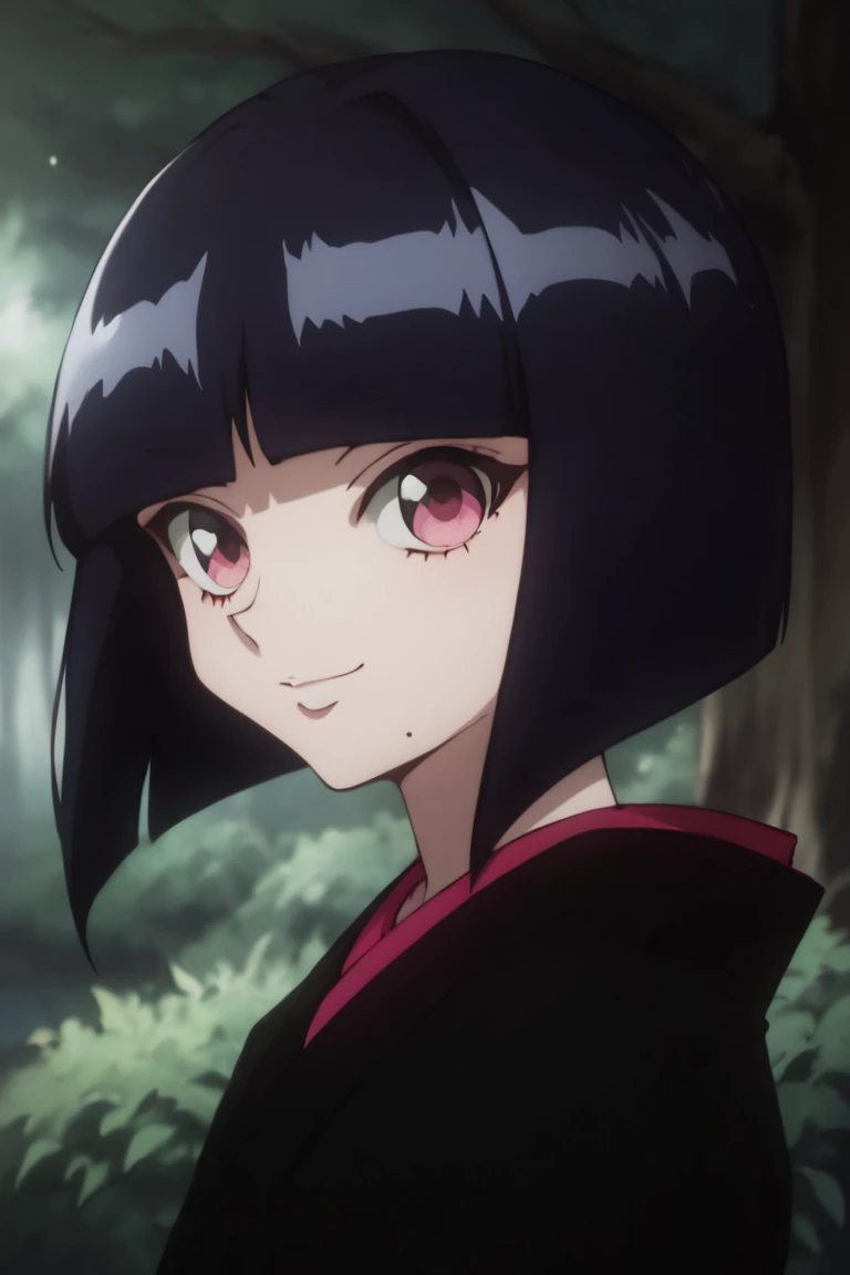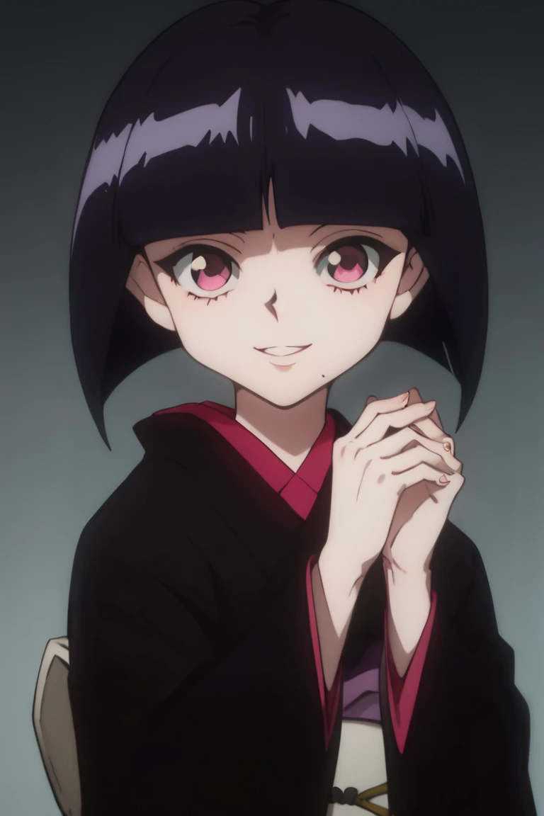 Kalluto Zoldyck,blunt bangs,bob cut,black hair,pink eyes,mole under mouth,