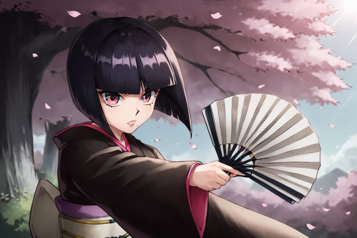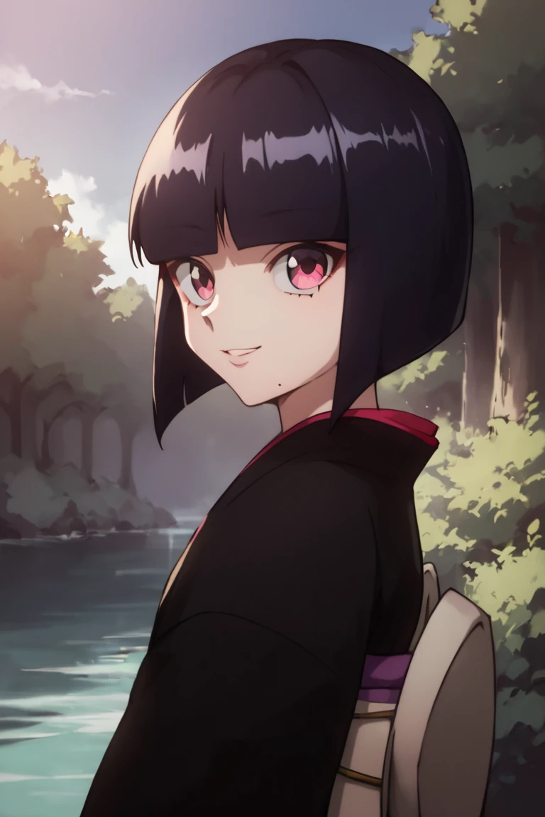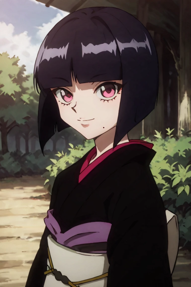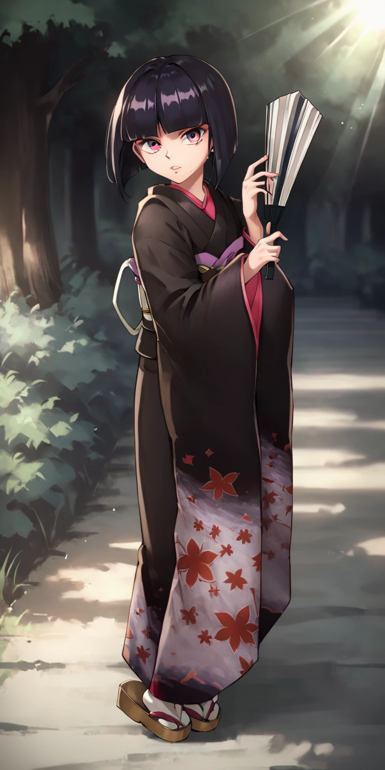 Kalluto Zoldyck,blunt bangs,bob cut,black hair,pink eyes,mole under mouth,
