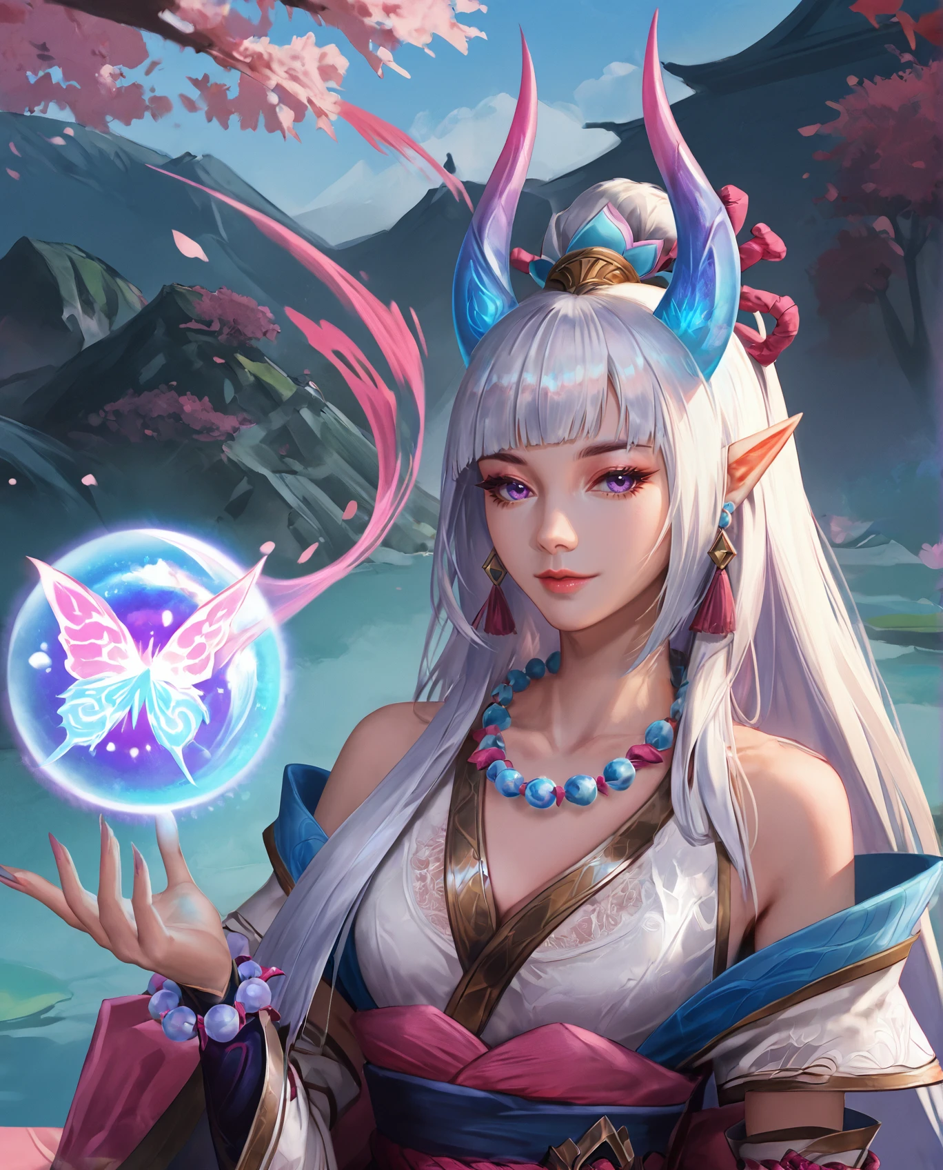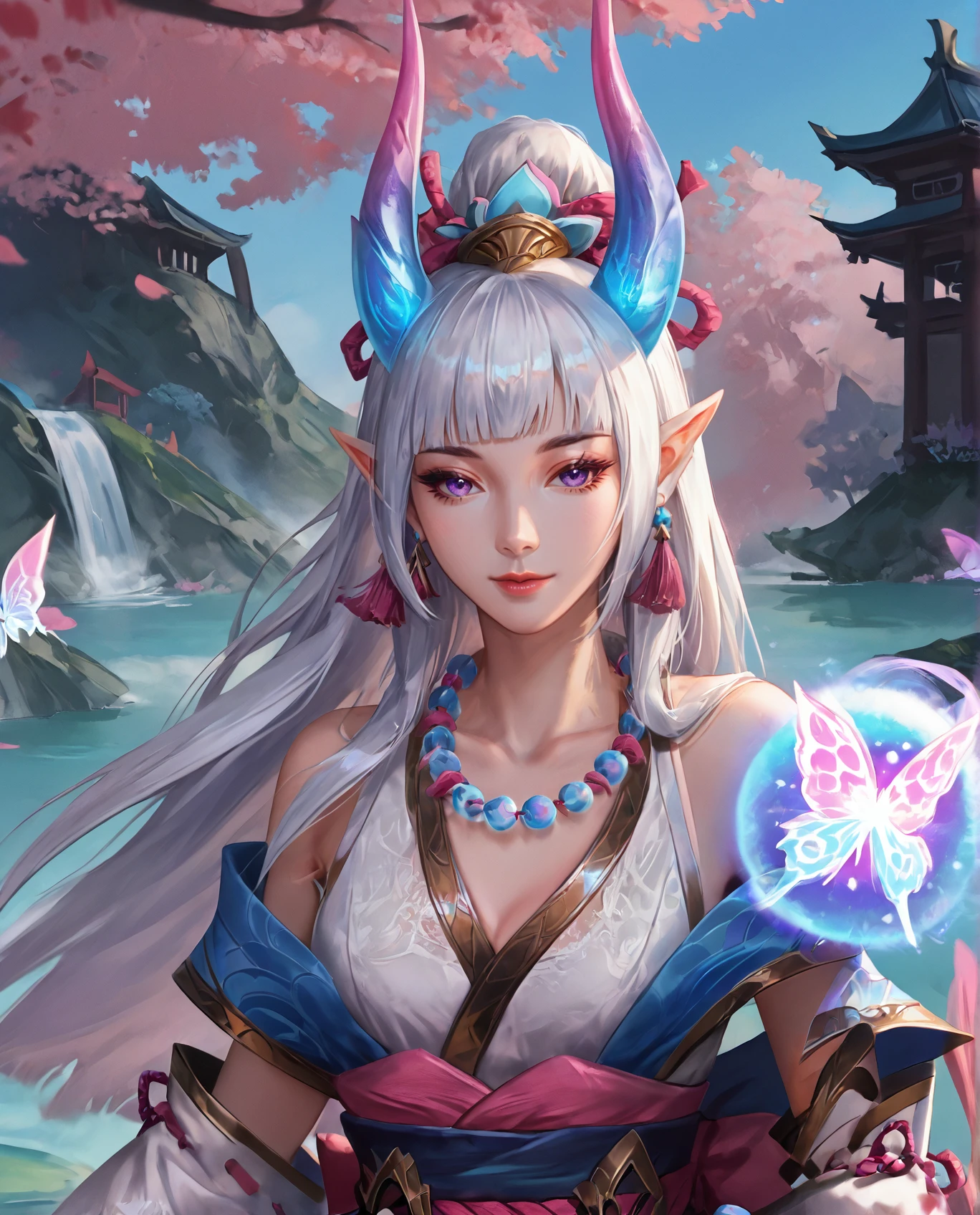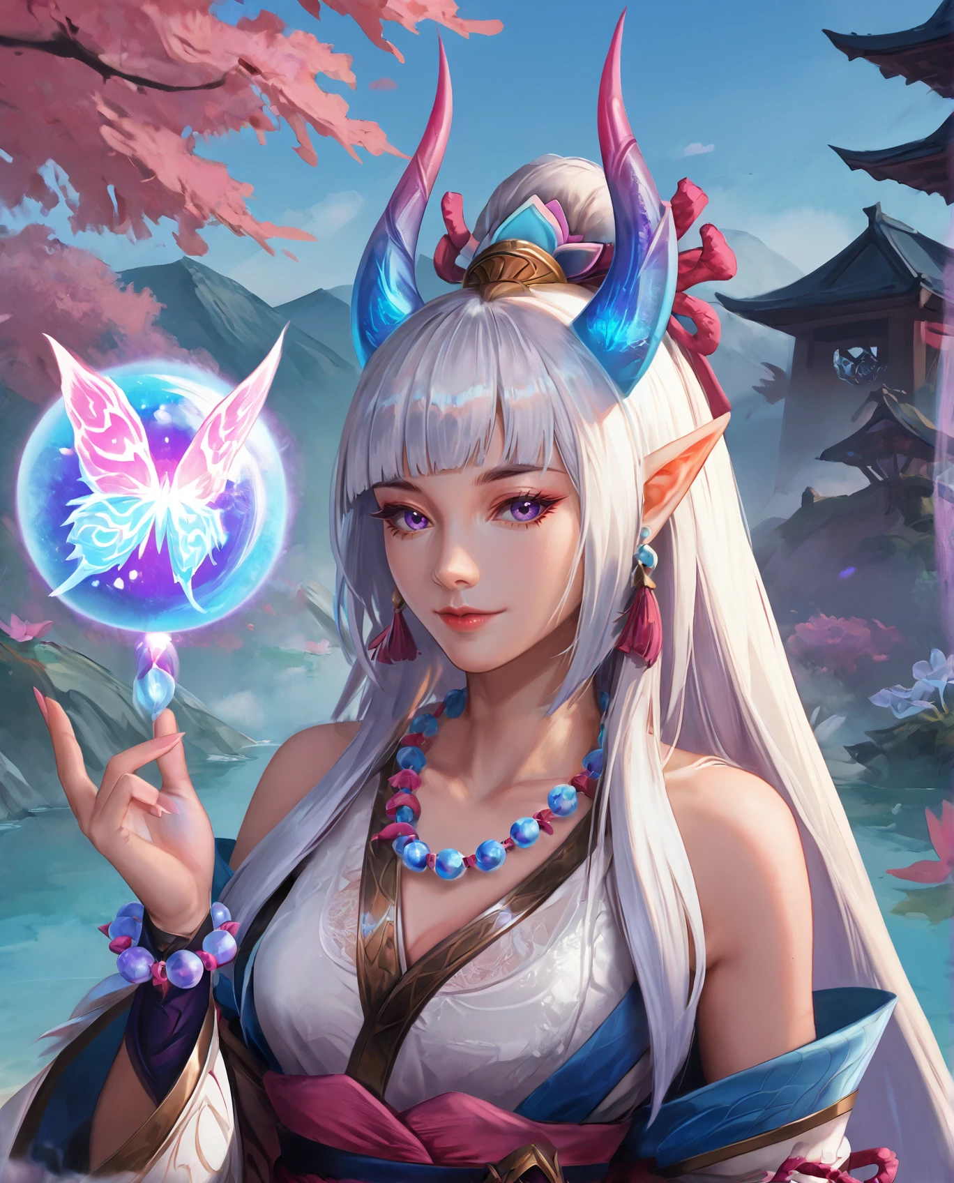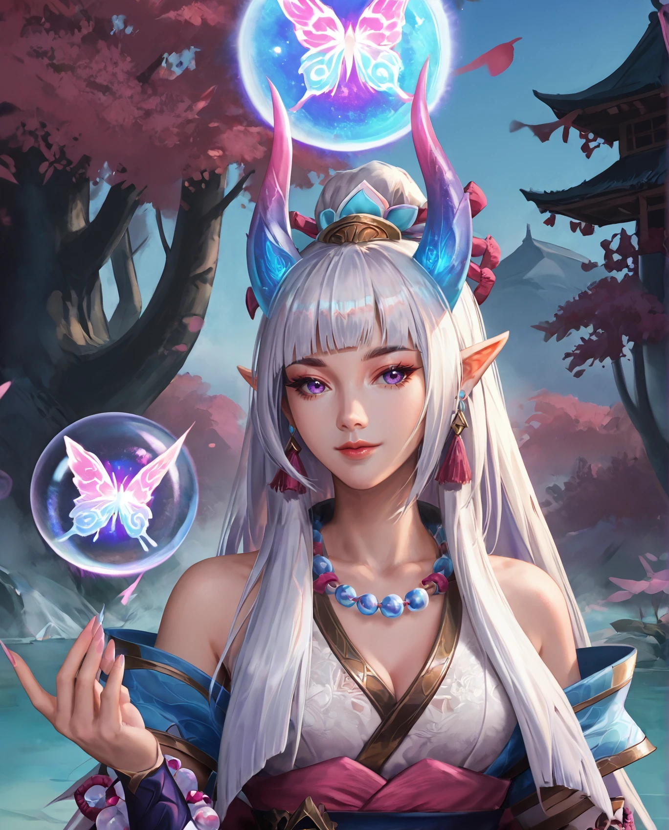 spirit blossom, white hair, long hair, purple eyes, blunt bangs, horns, earrings, pointed ears, hair ornament,