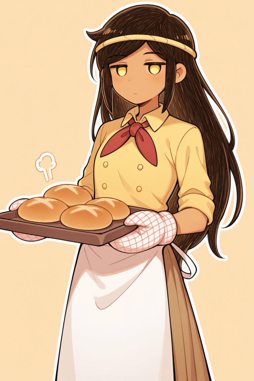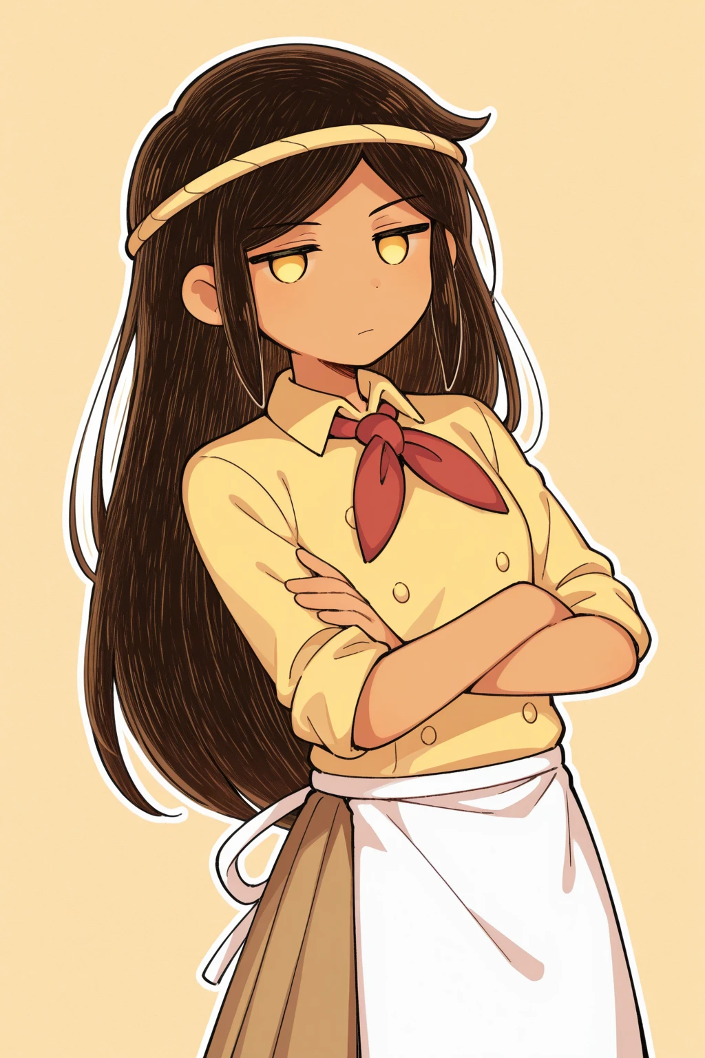 doughieomori, omori, 1girl, yellow eyes, jitome, no pupils, long hair, brown hair, swept bangs, sidelocks, dark skin, dark-skinned female, headband, chef, red neckerchief, yellow shirt, collared shirt, sleeves rolled up, buttons, white apron, waist apron, brown skirt, long skirt