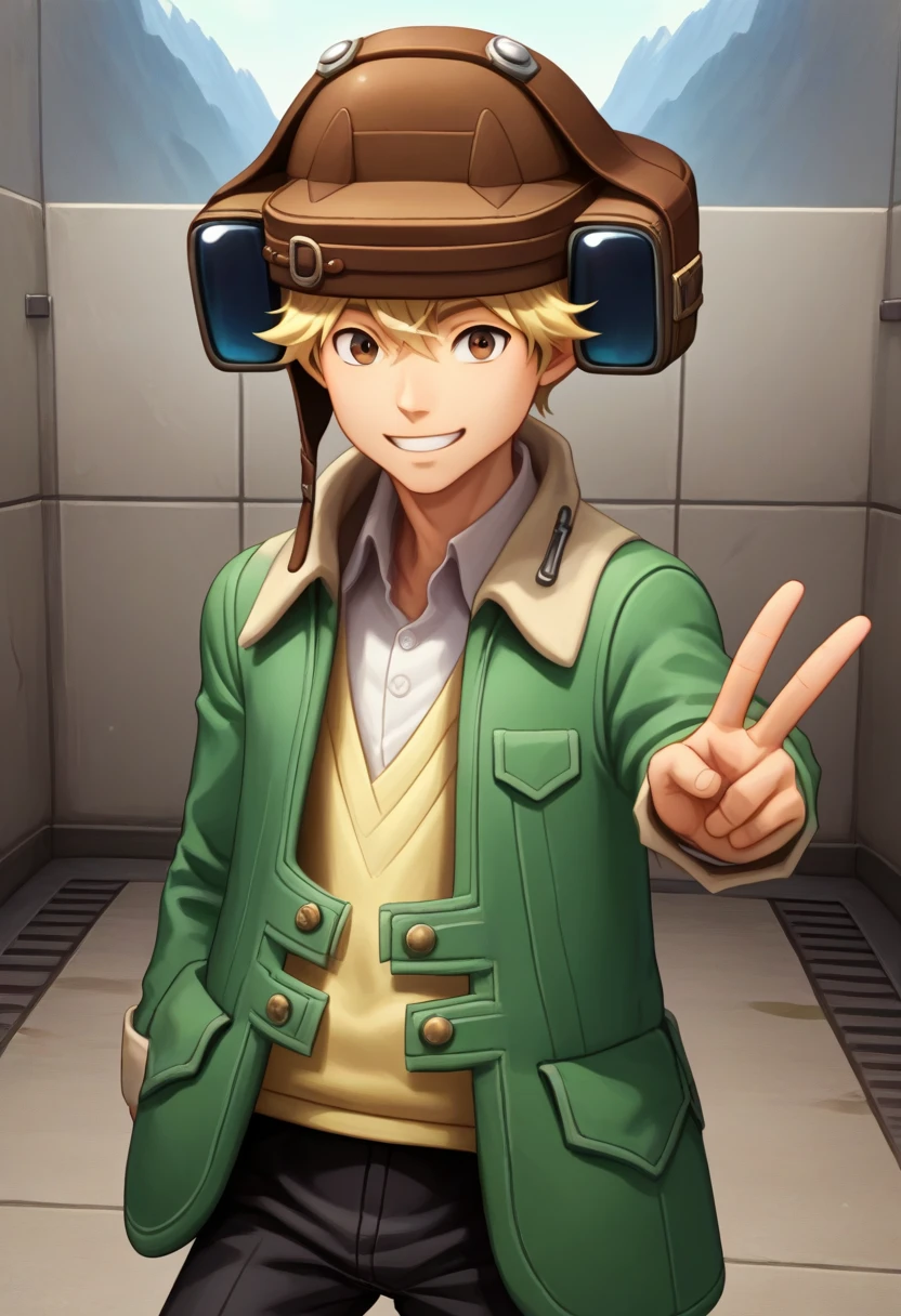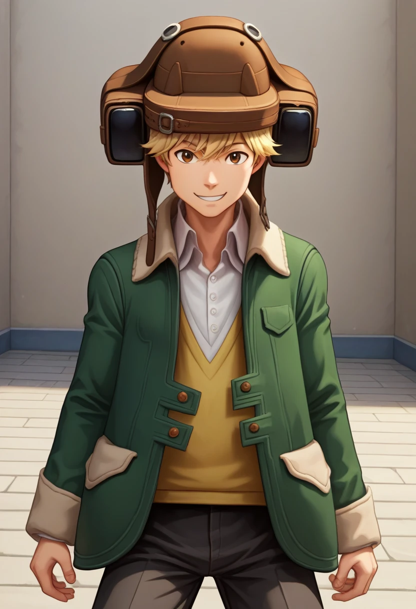 quark,aviator cap,blonde hair, brown eyes,green jacket,pale yellow sweater vest, open jacket,white shirt