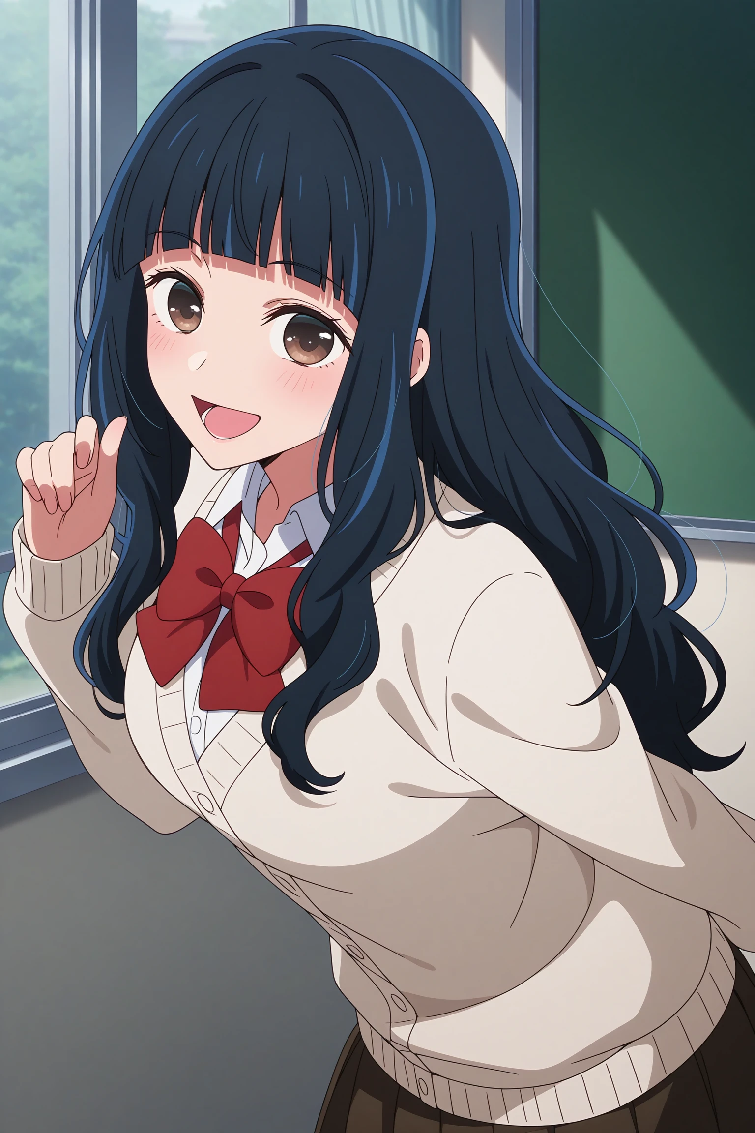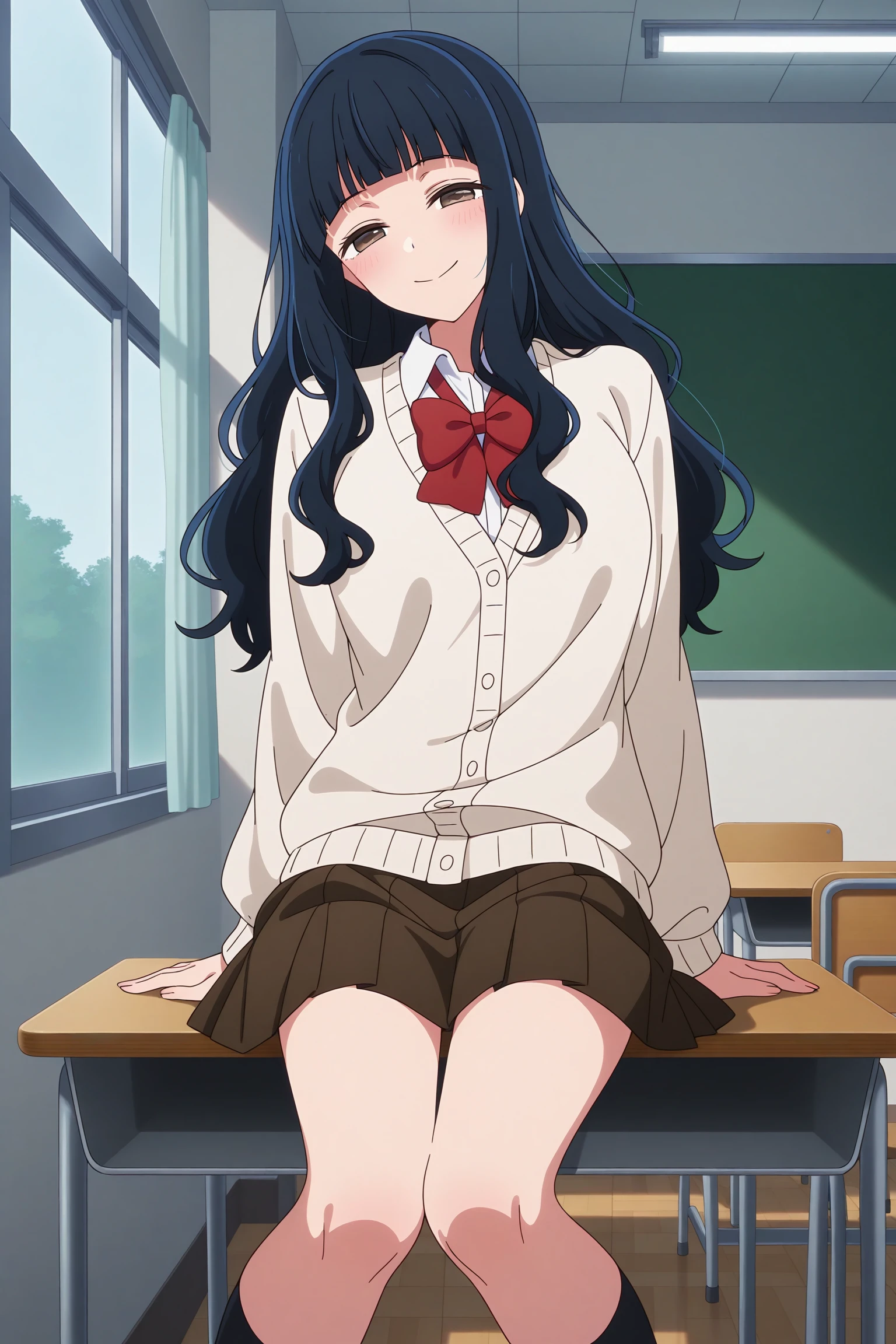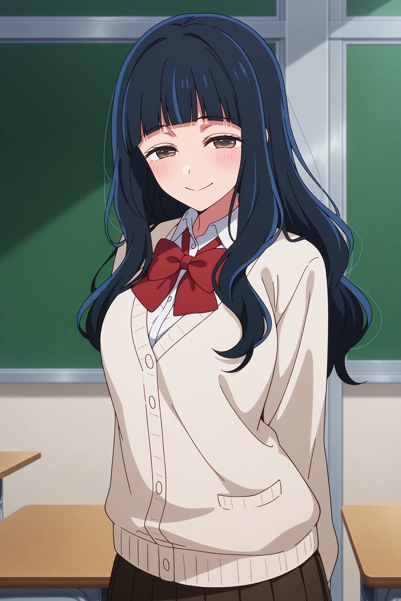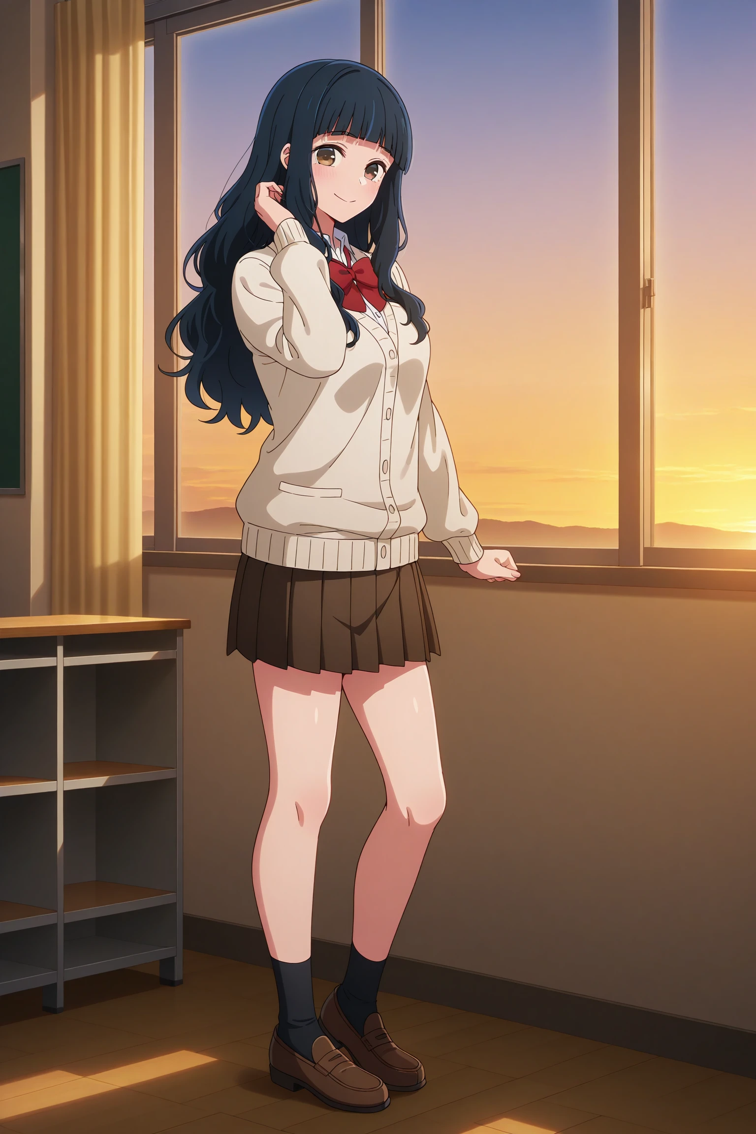 sumi yuki, long hair, blue hair, wavy hair, sidelocks, blunt bangs, brown eyes, long sleeves, brown cardigan, white shirt, collared shirt, red bow, brown skirt, pleated skirt, black socks, ankle socks, loafers