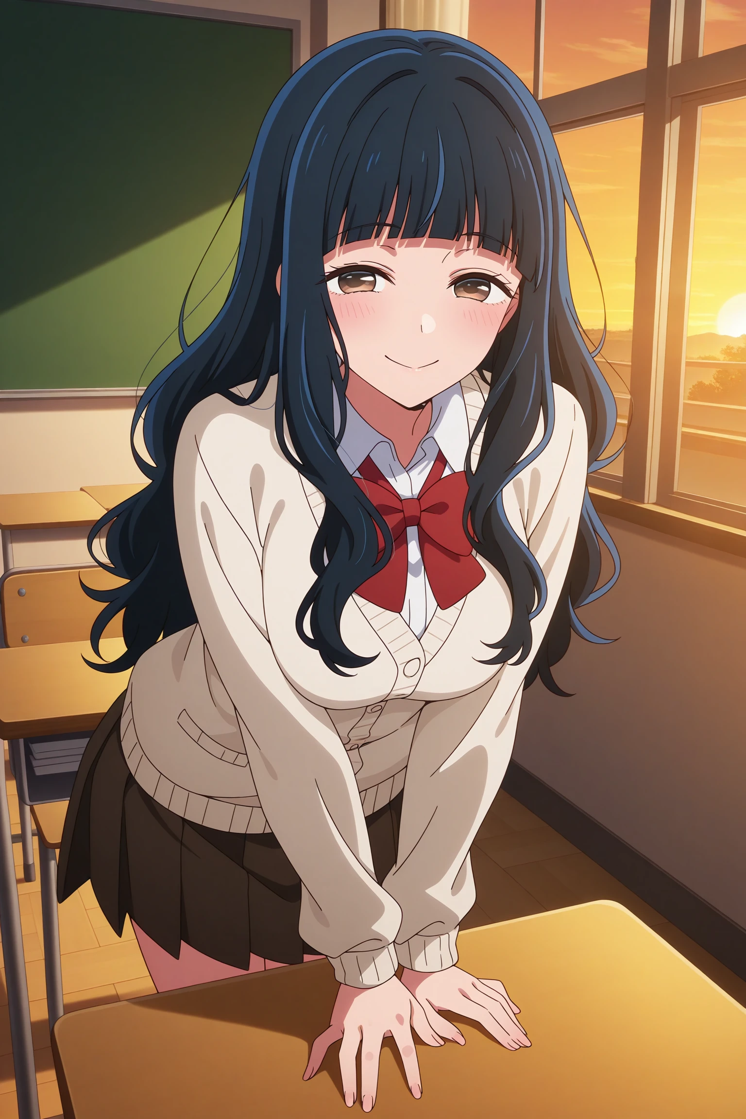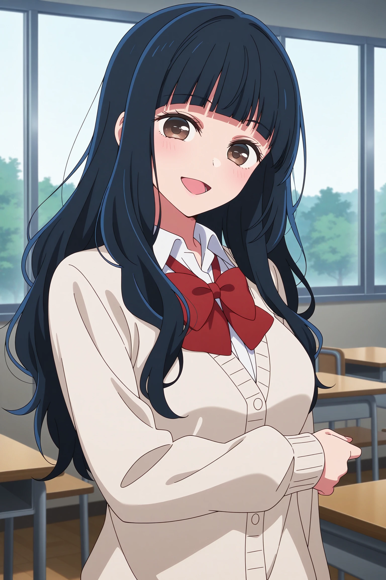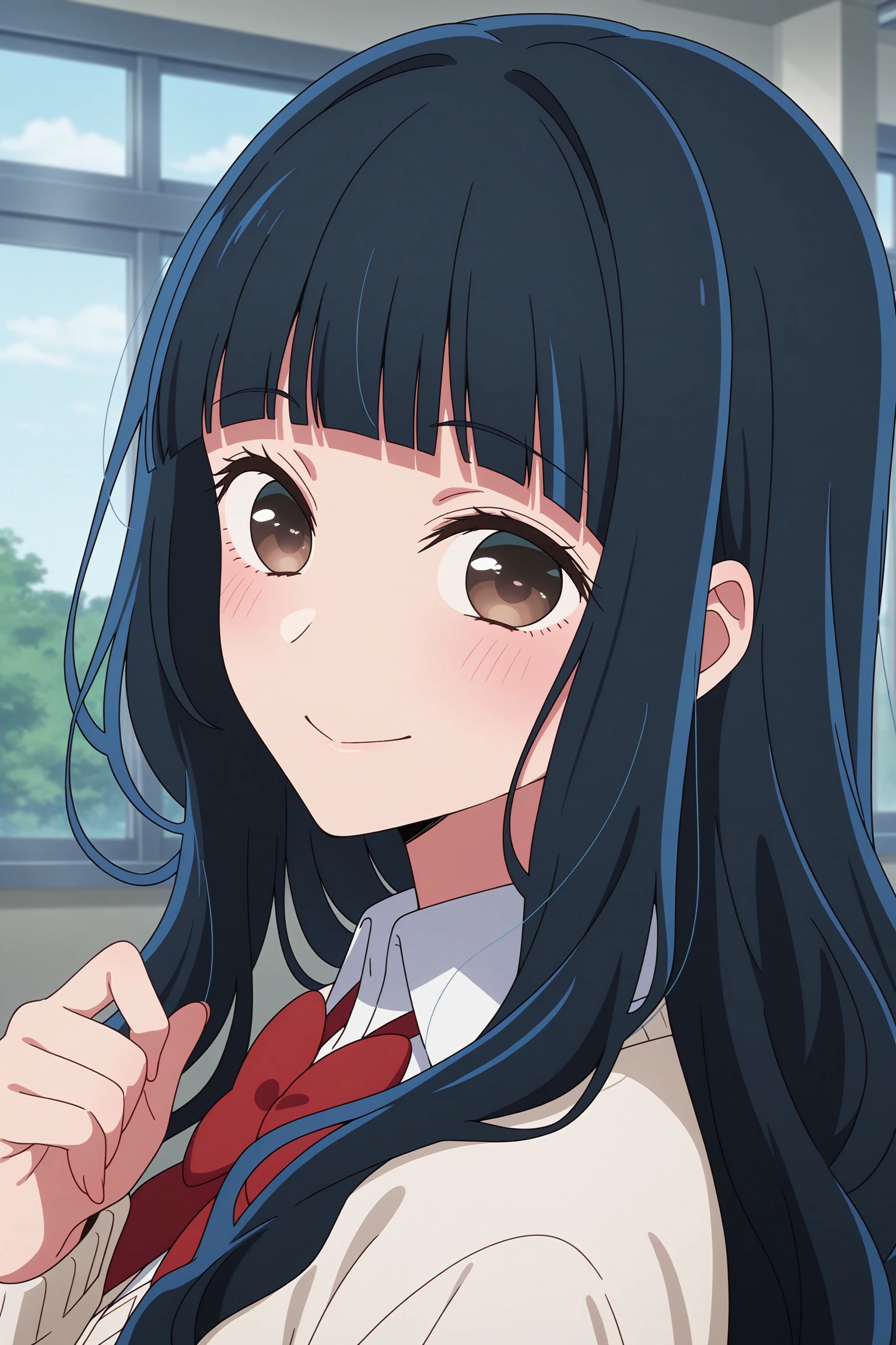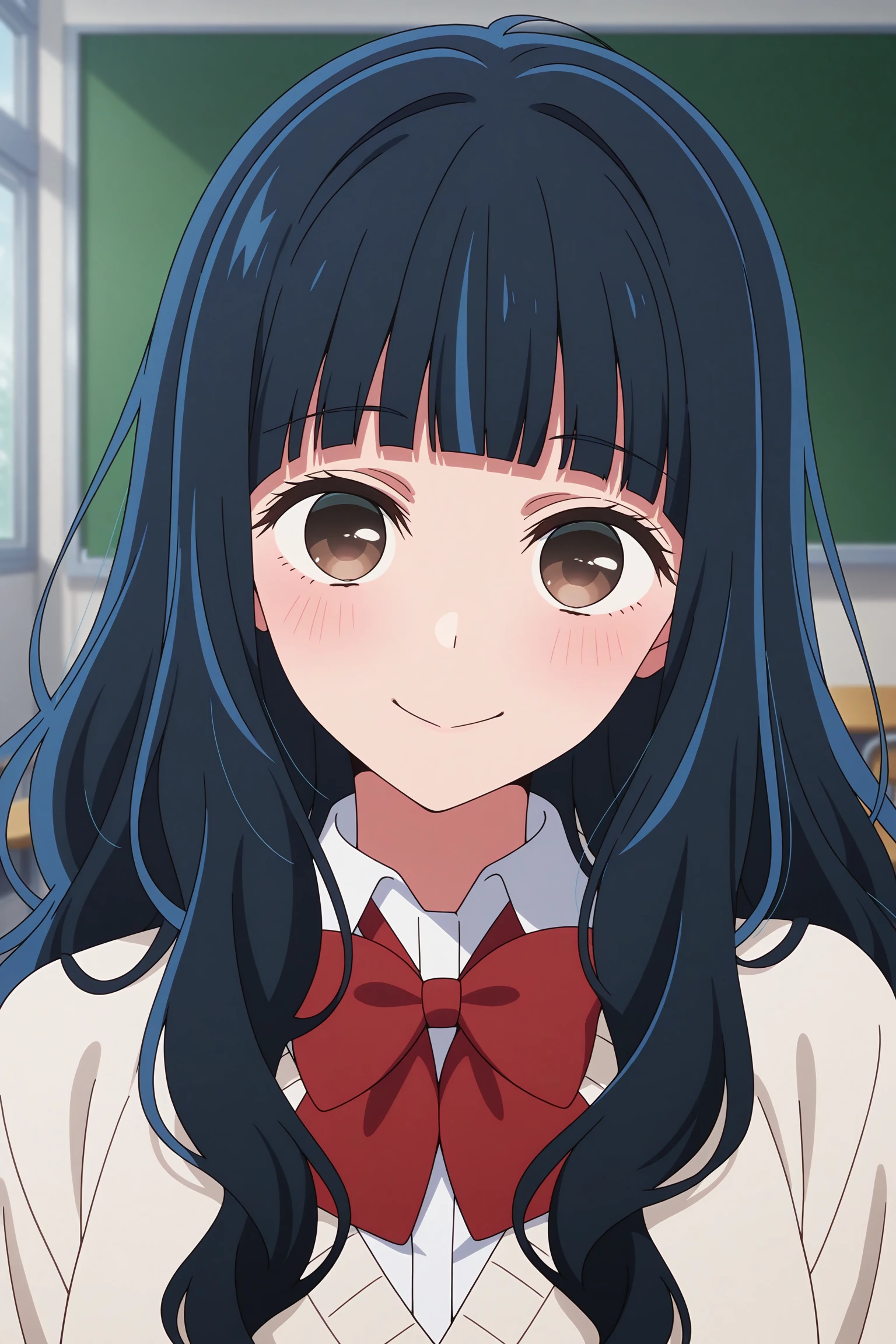 sumi yuki, long hair, blue hair, wavy hair, sidelocks, blunt bangs, brown eyes, long sleeves, brown cardigan, white shirt, collared shirt, red bow, brown skirt, pleated skirt, black socks, ankle socks, loafers