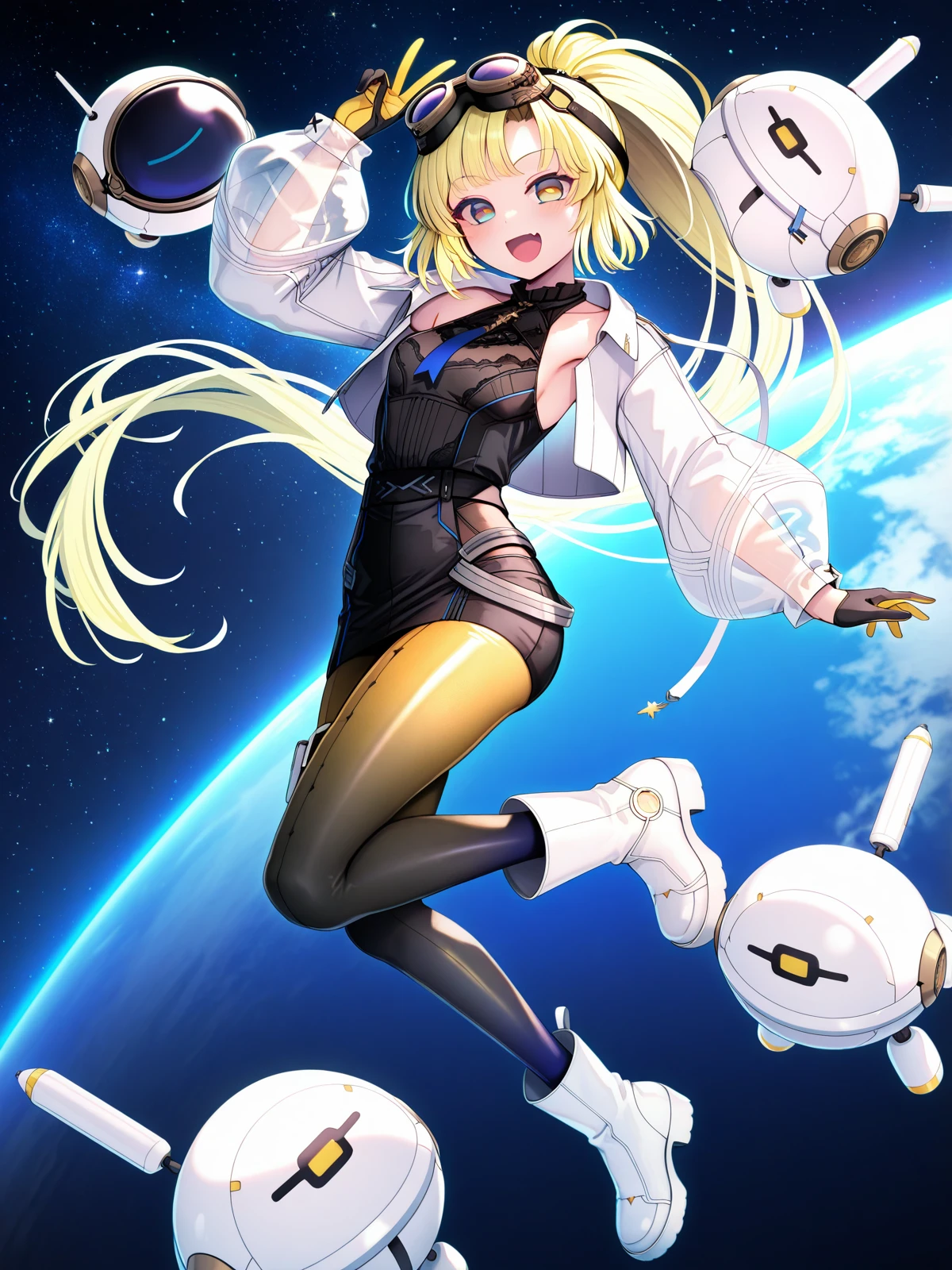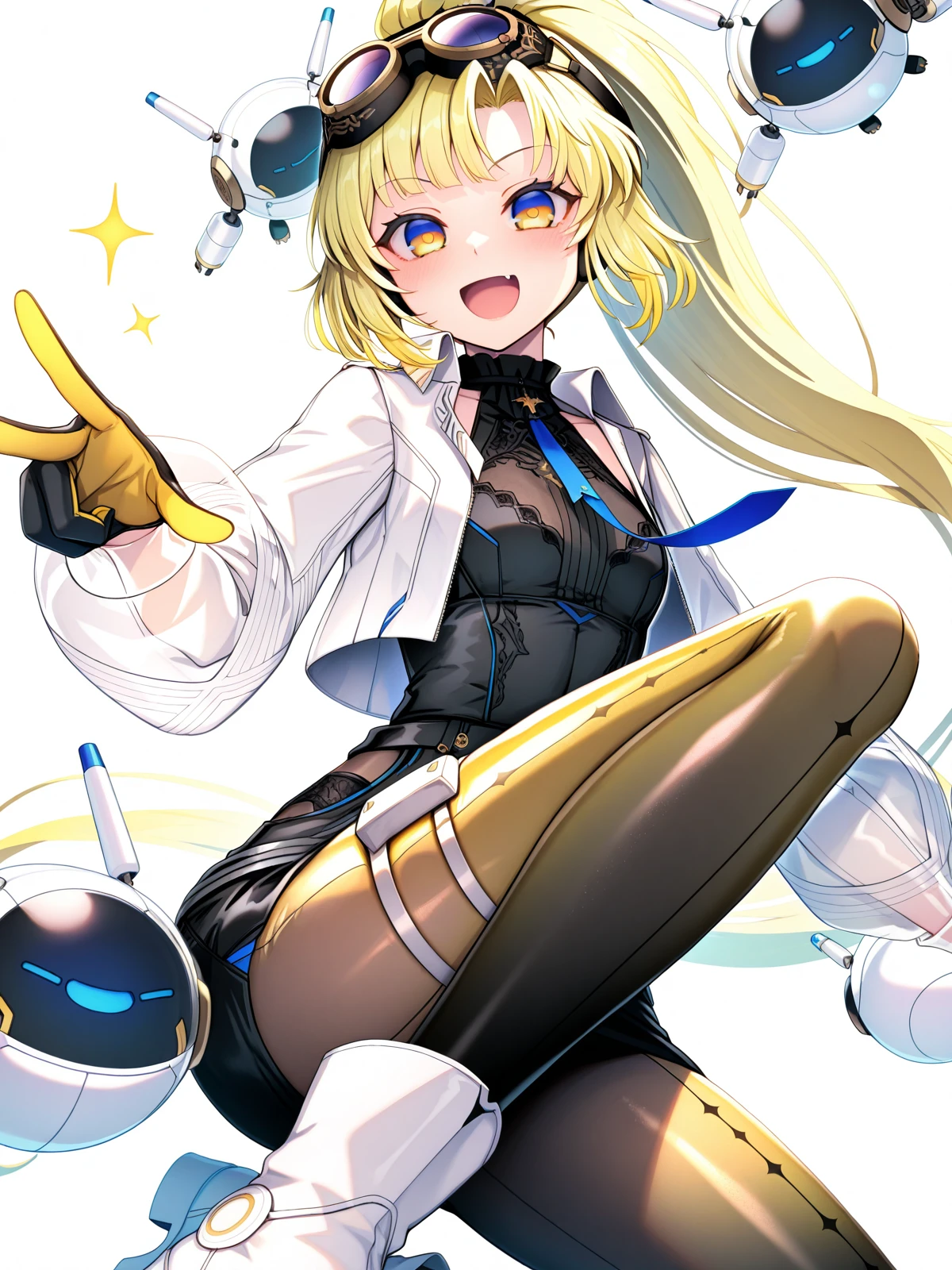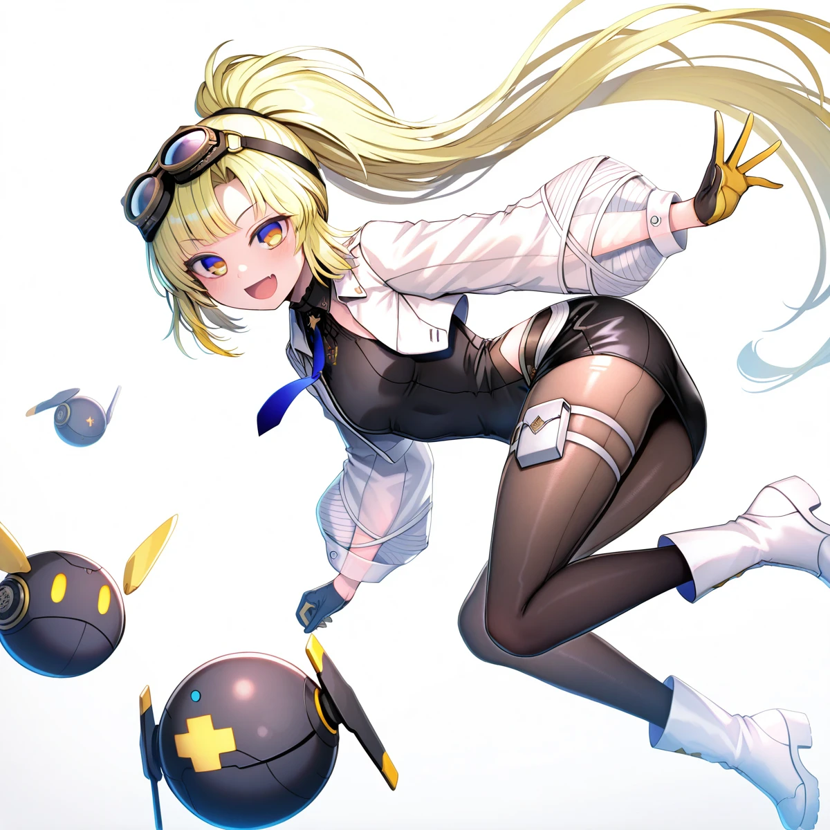 nonoka arcaea,goggles,goggles on head,long hair,yellow hair,blonde hair,bangs,ponytail,blue eyes,yellow eyes,two-tone eyes,fang,gloves,black gloves,yellow gloves,two-tone gloves,open clothes,small breasts,blue necktie,see-through sleeves,jacket,cropped jacket,open jacket,long sleeves,white jacket,pencil skirt,leather_pants,black pants,(yellow pants:0.7),gradient legwear,thigh strap,black shirt,sleeveless shirt,black legwear,boots,white footwear,