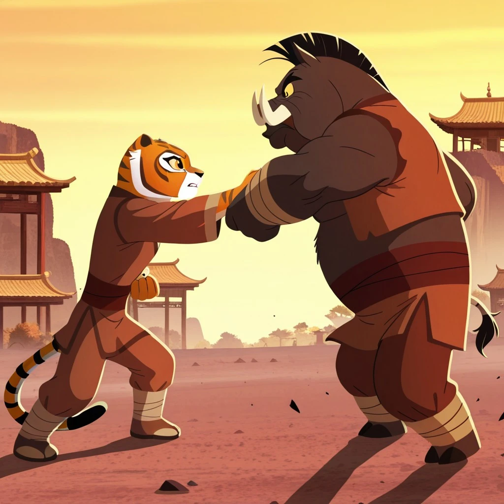 anthro, male Boar, brown fur, black hair, mohawk, yellow sclera, black eyes, tusks, brown vest, open clothes, brown pants, leg wraps, arm wraps, brown waist wrap