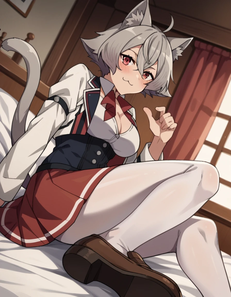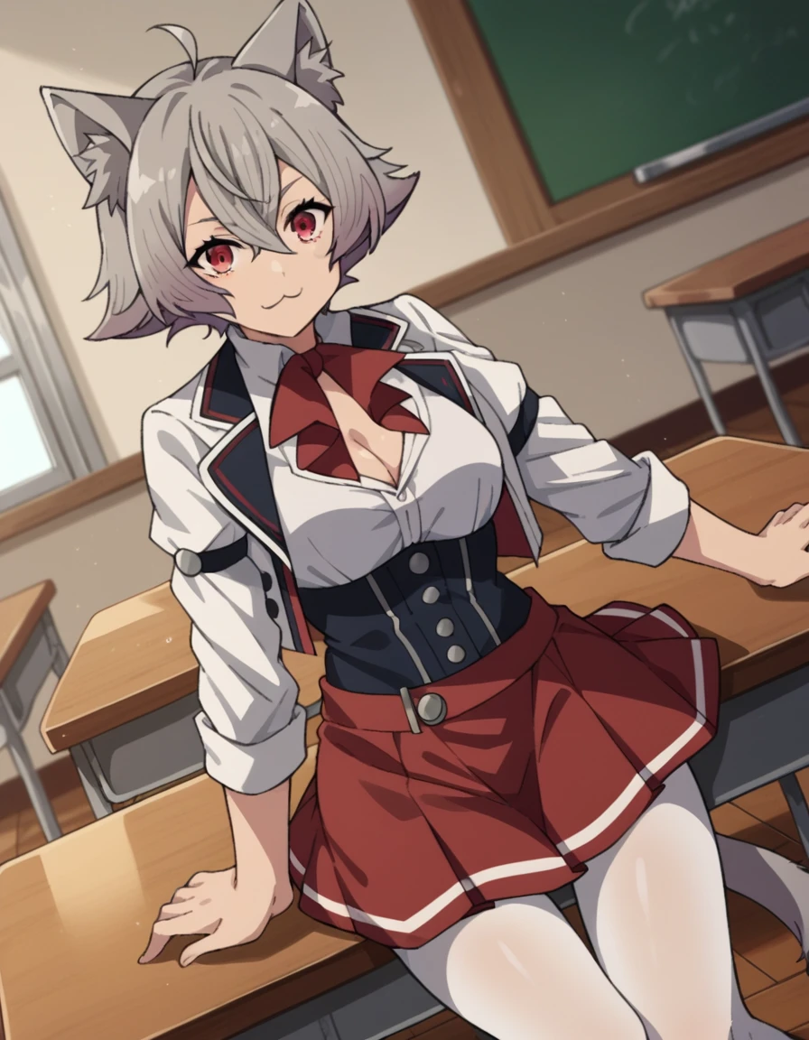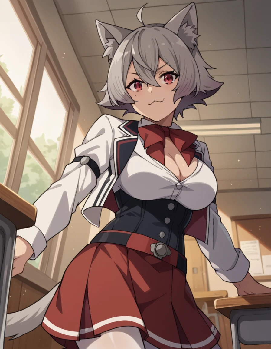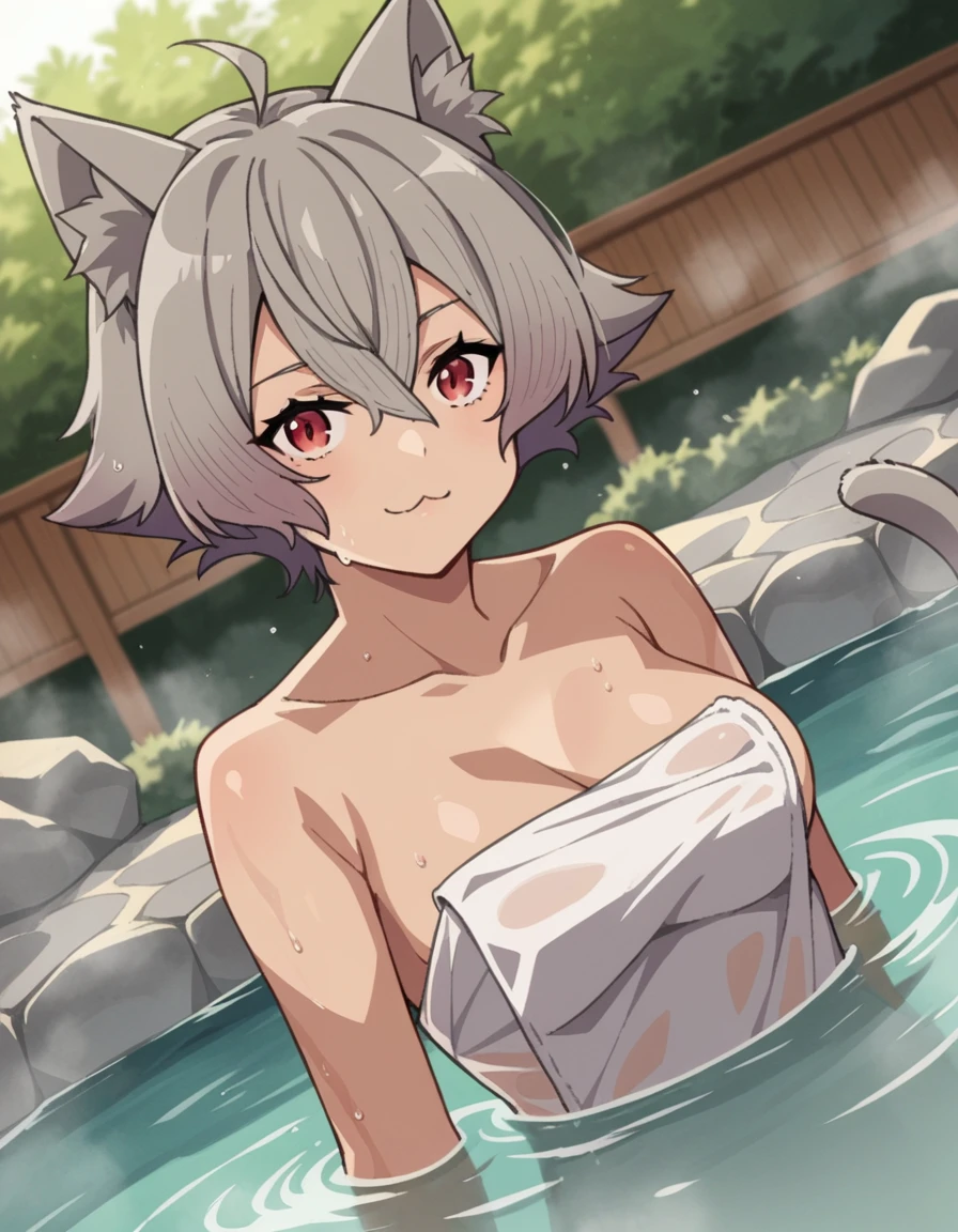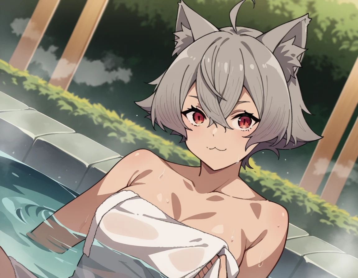 rinia dedoldia, short hair, red eyes, animal ears, hair between eyes, tail, ahoge, grey hair, cat ears, animal ear fluff, wolf ears,