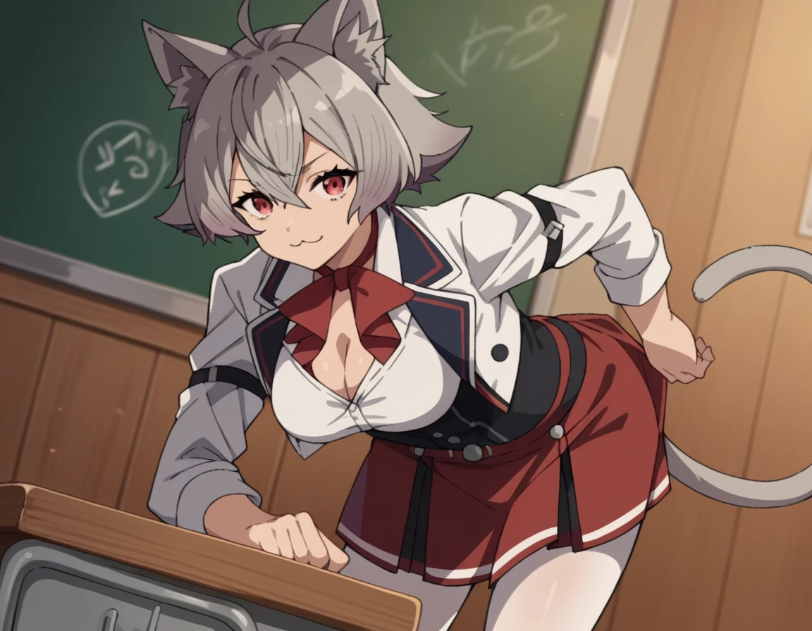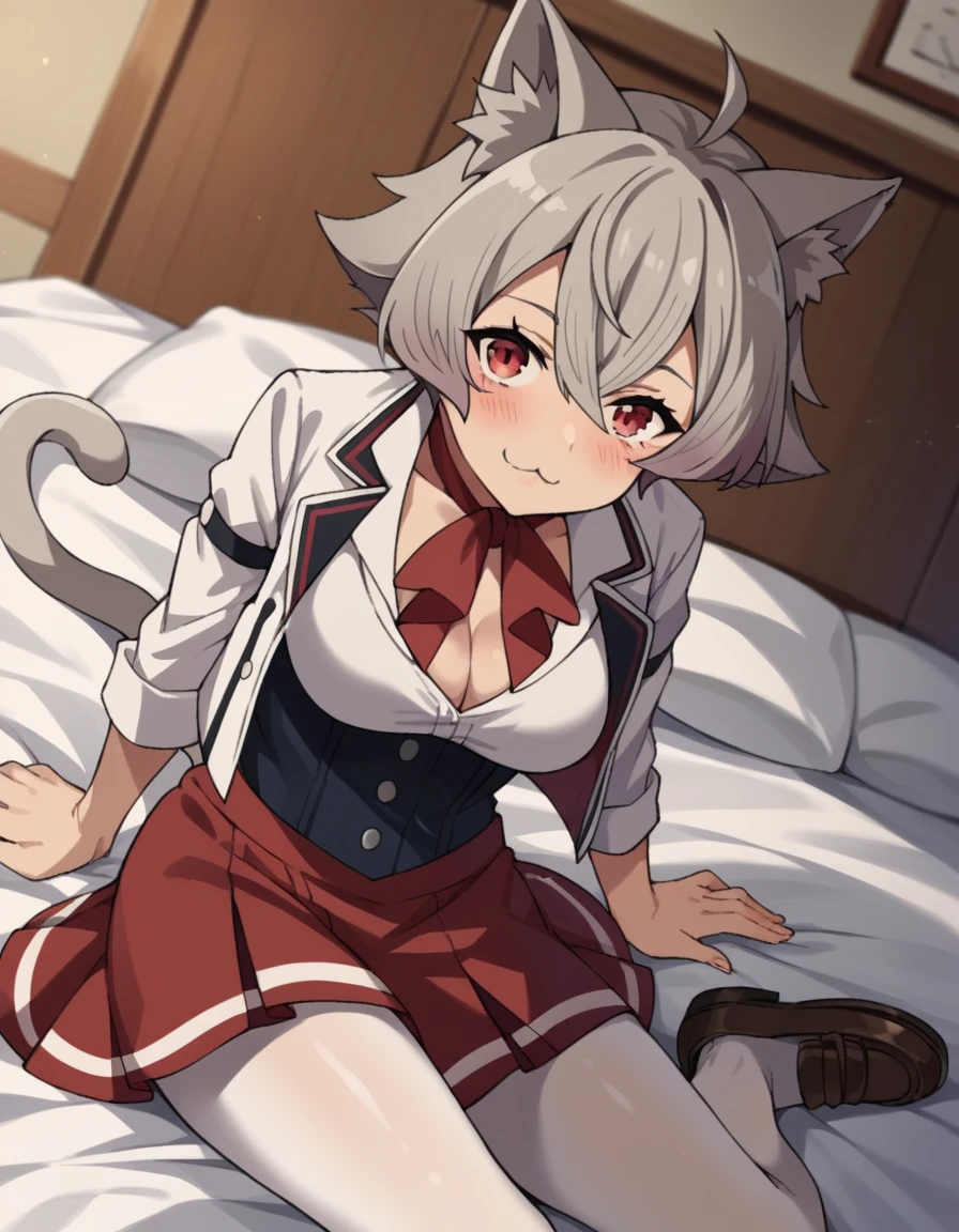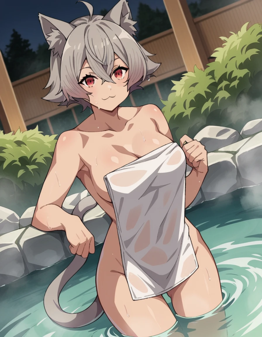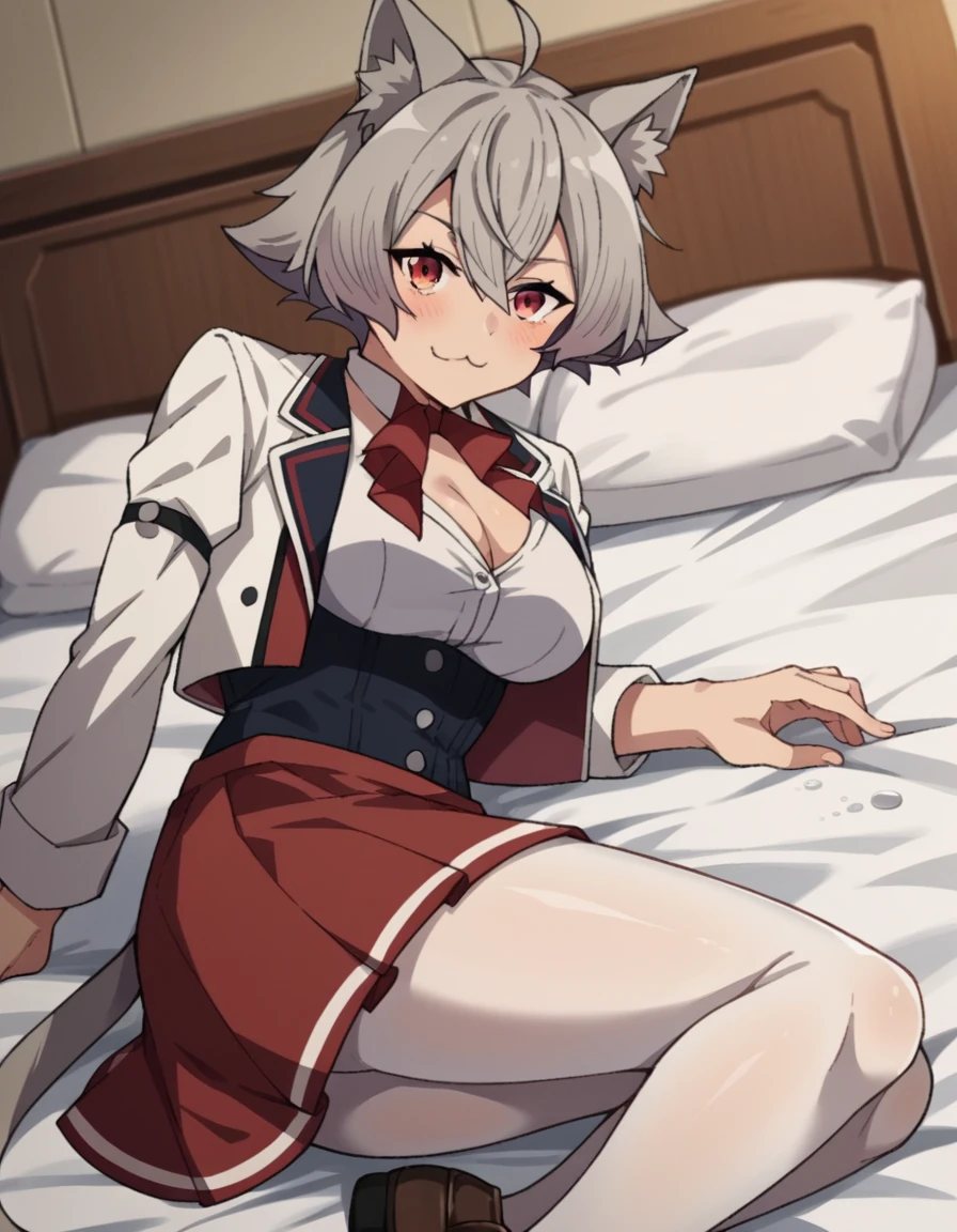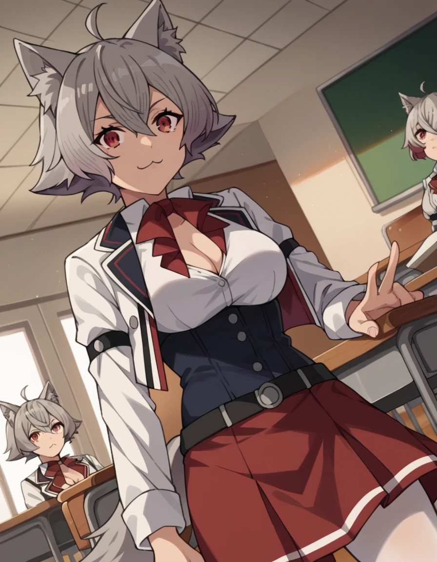 rinia dedoldia, short hair, red eyes, animal ears, hair between eyes, tail, ahoge, grey hair, cat ears, animal ear fluff, wolf ears,