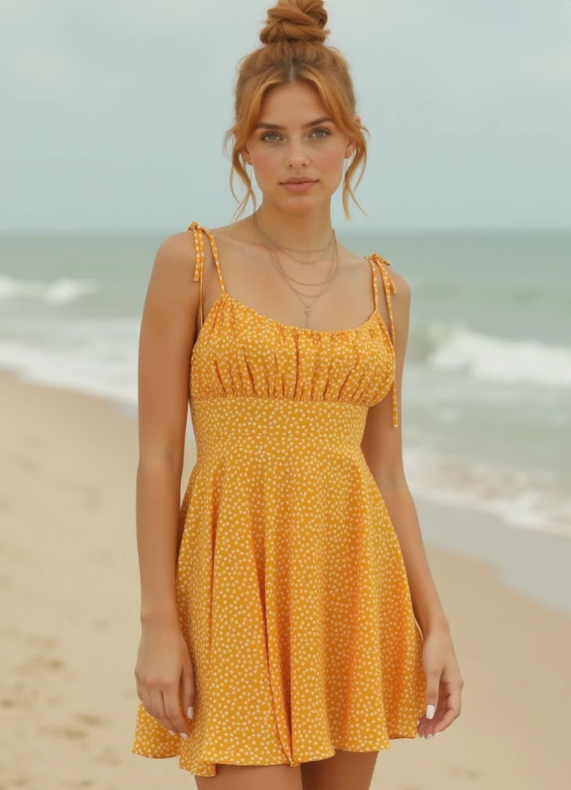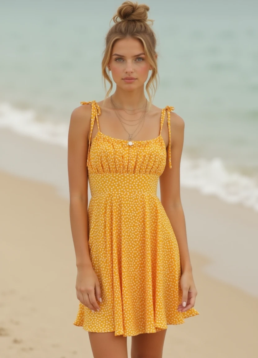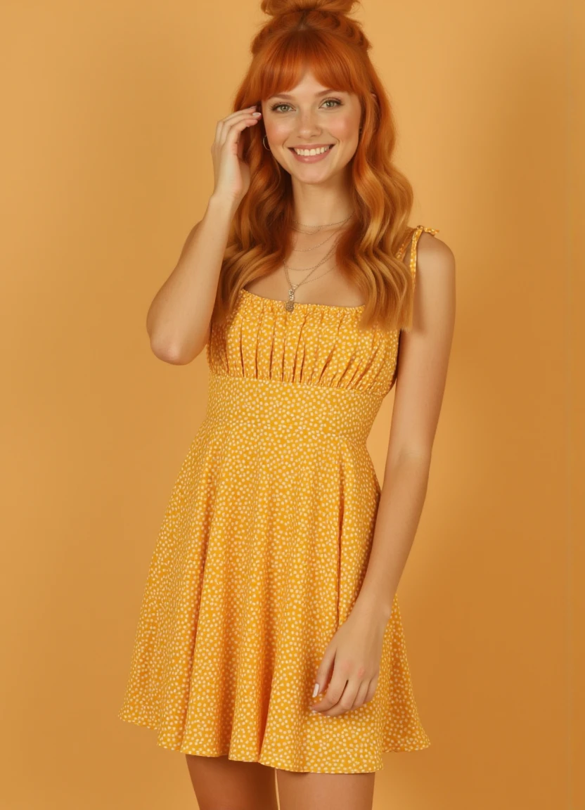 wearing a short yellow sundress with tiny white polka-dots, yellowsundress