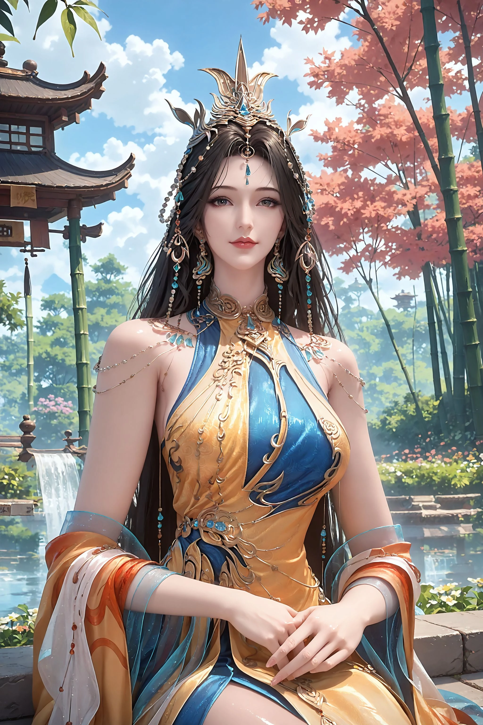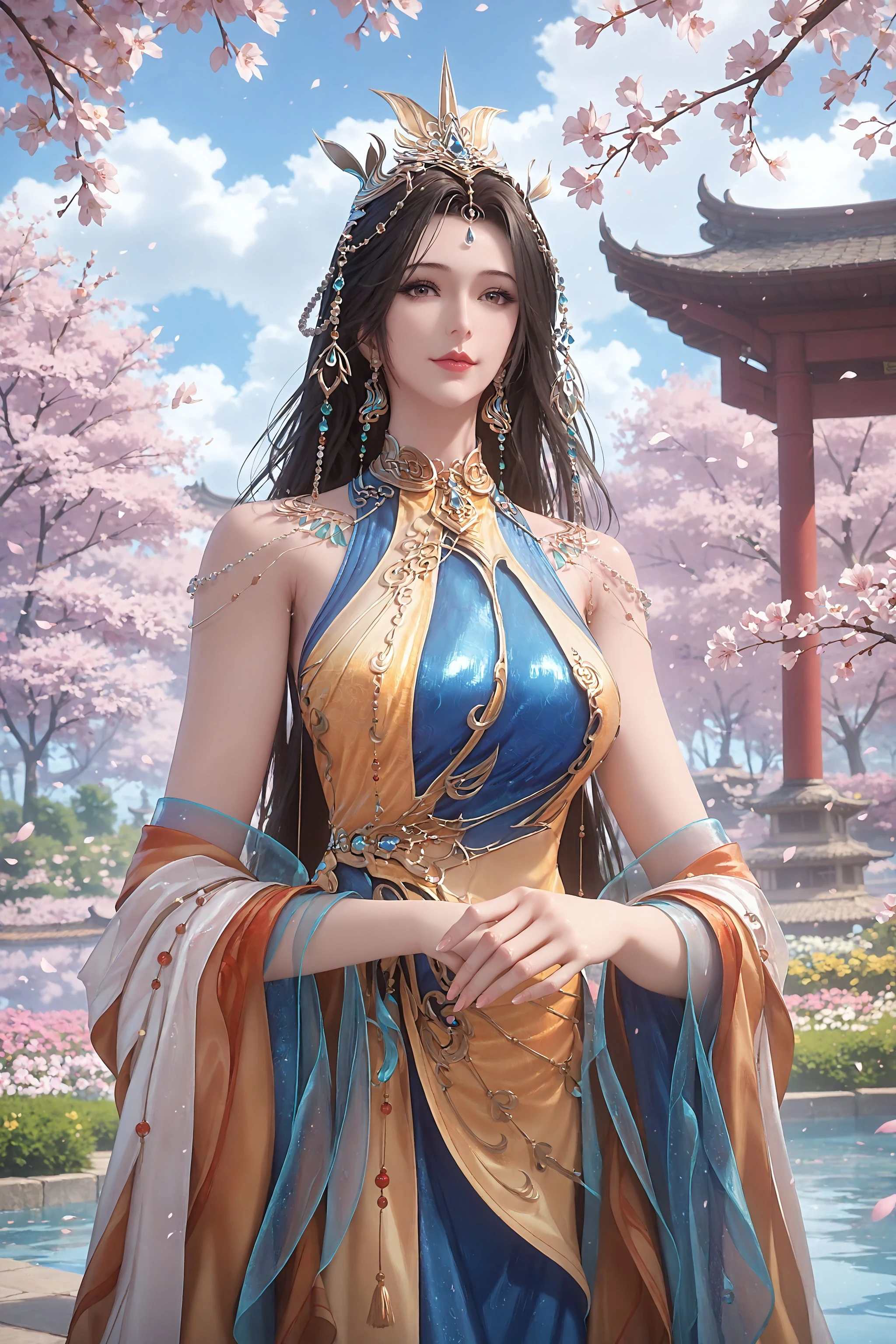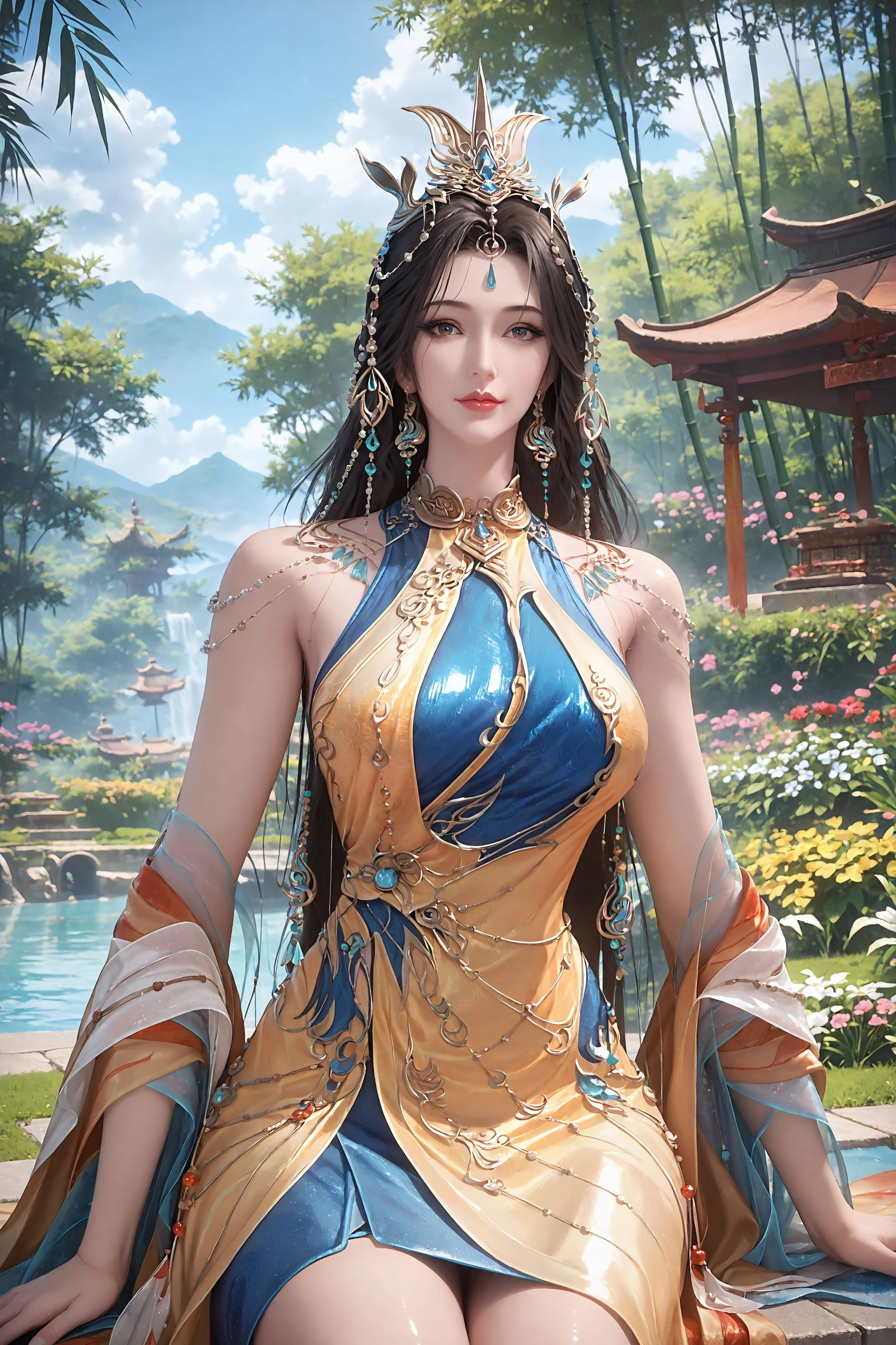 1girl, solo, dress, long hair, jewelry, black hair, forehead mark, hair ornament, earrings, blue dress