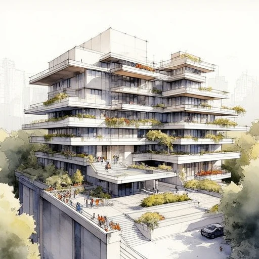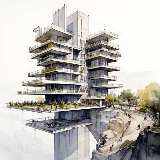 archwatercolor, a painting of Spectacular overlook of a modern building in urbun, modern_design, modern_building, modern_architecture, details, depth of field, long shot,