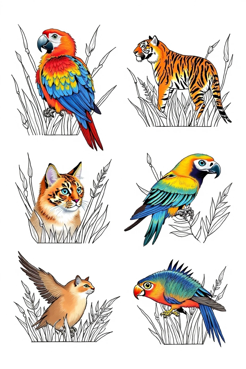 All have black outline. Design animal artworks: bright parrot, tiger hidden in grass, long - haired cat, detailed falcon, bold eagle, patterned fish.