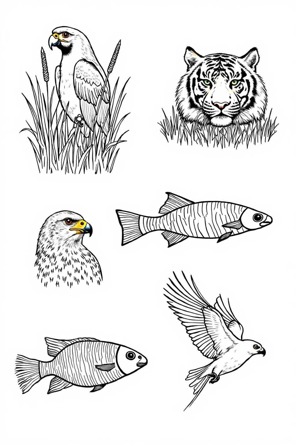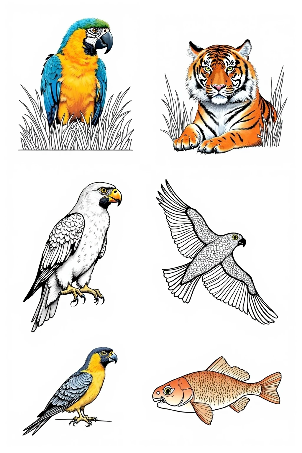 All have black outline. Do animal art: bright - colored parrot, tiger in tall grass, fluffy - furred cat, keen - eyed falcon, majestic eagle, striped fish.