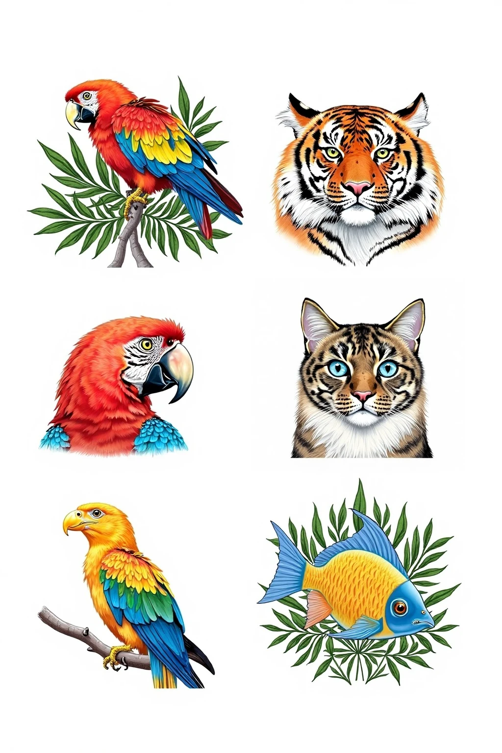 All have black outline. Illustrate animal heads: colorful parrot, tiger in foliage, blue - eyed cat, attentive falcon, regal eagle, tropical fish.