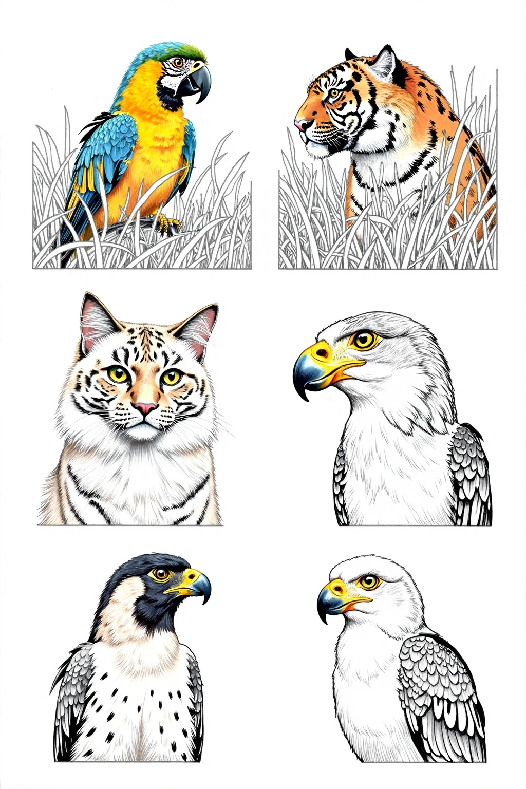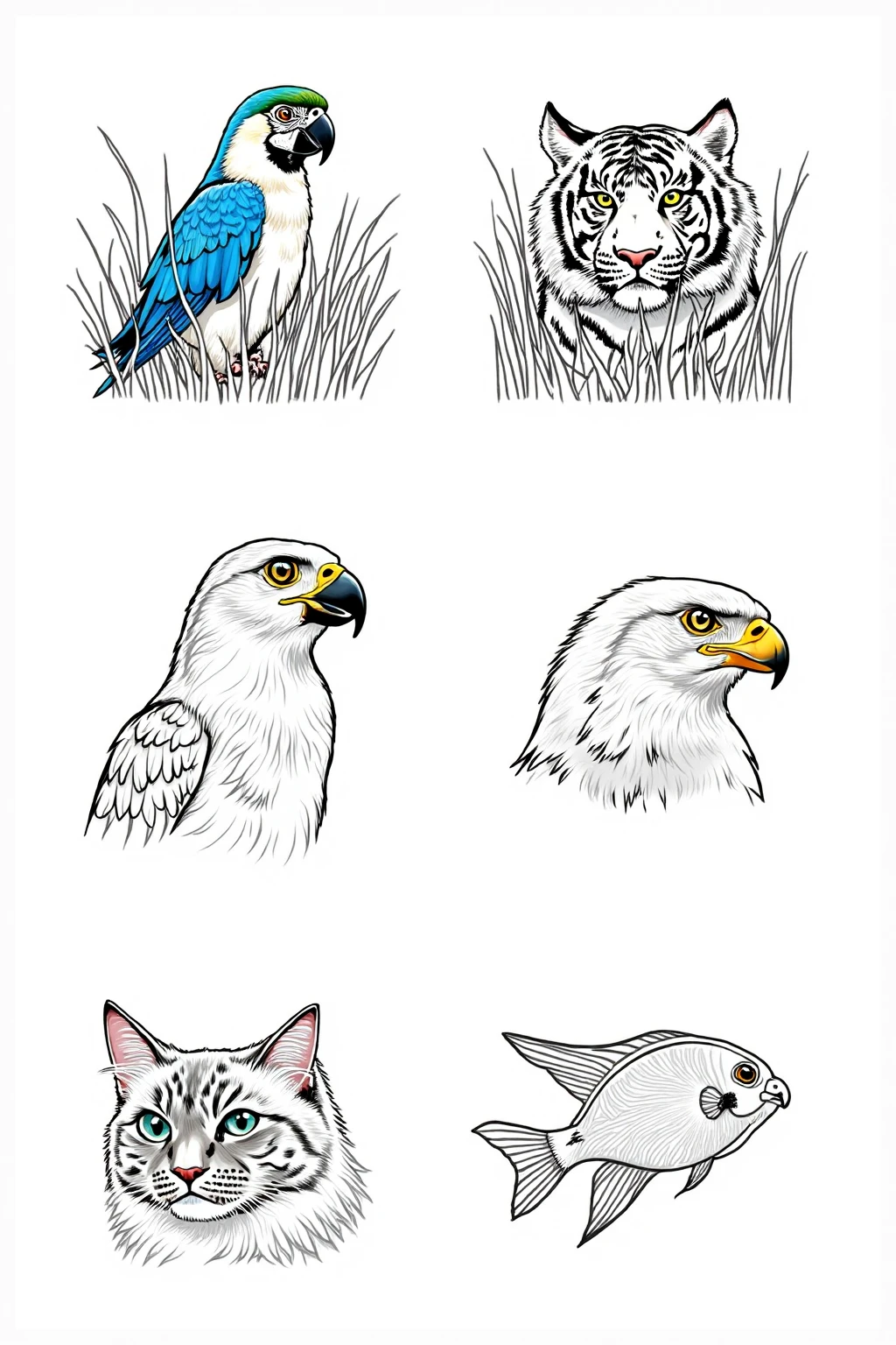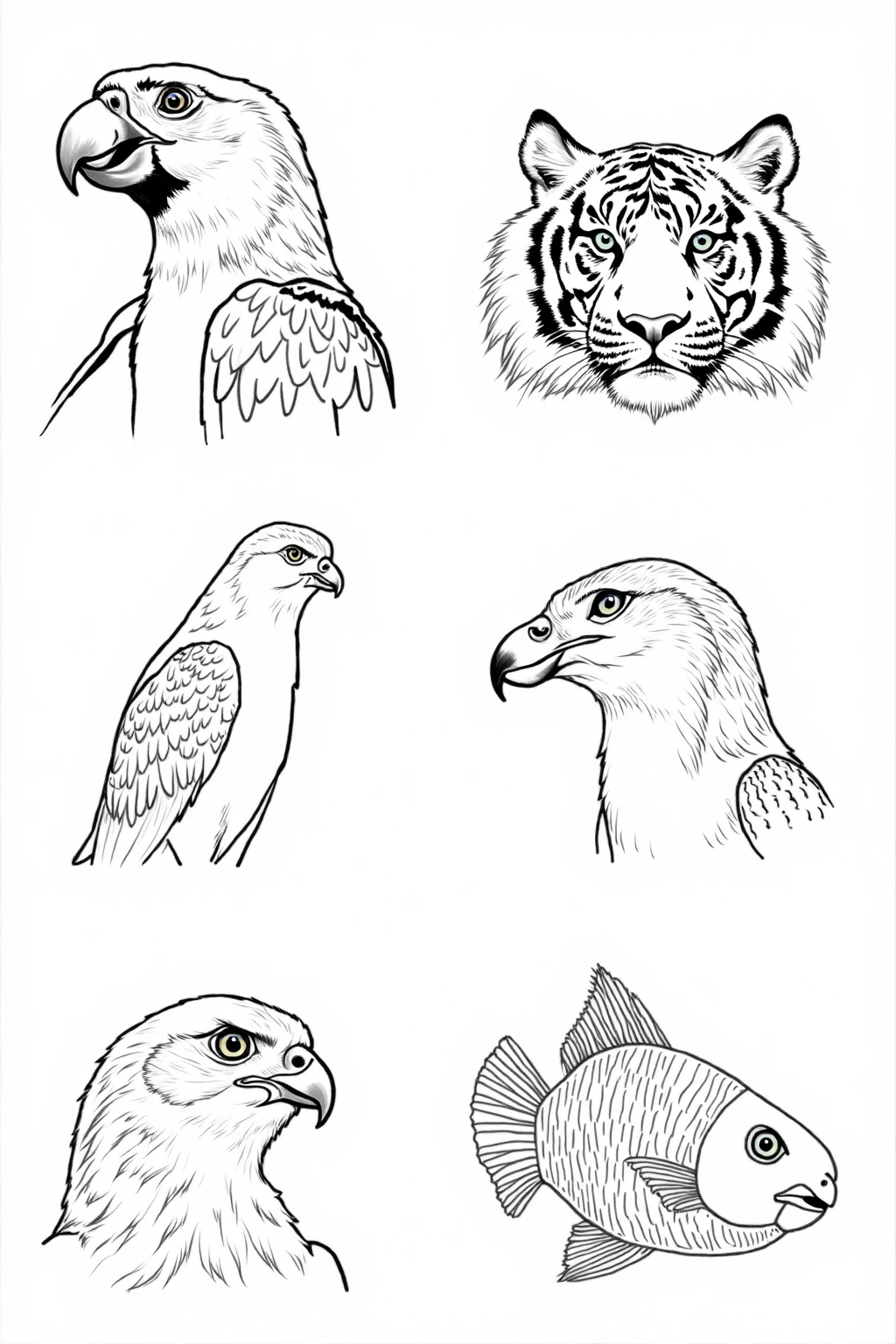All have black outline. Create realistic animal portraits: parrot with vibrant plumage, tiger in tall grass, fluffy cat, sharp - eyed falcon, majestic eagle, colorful fish.
