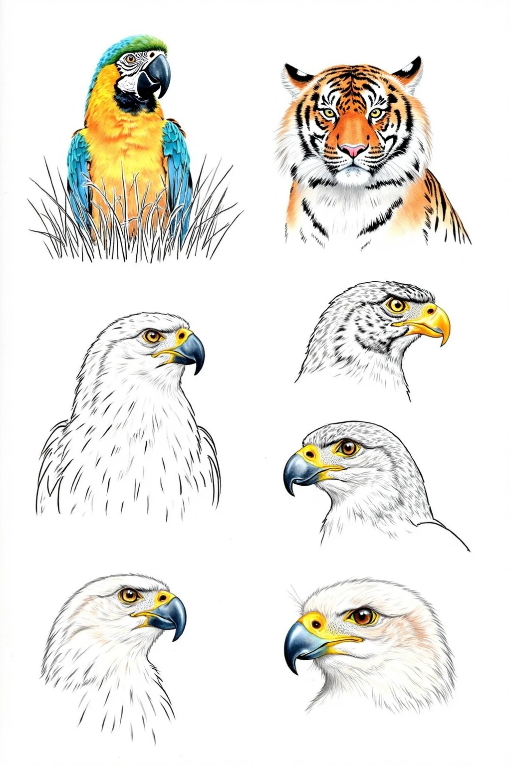 All have black outline. Sketch animal portraits: multicolored parrot, tiger with grass, fluffy gray cat, intense falcon, powerful eagle, striped fish.