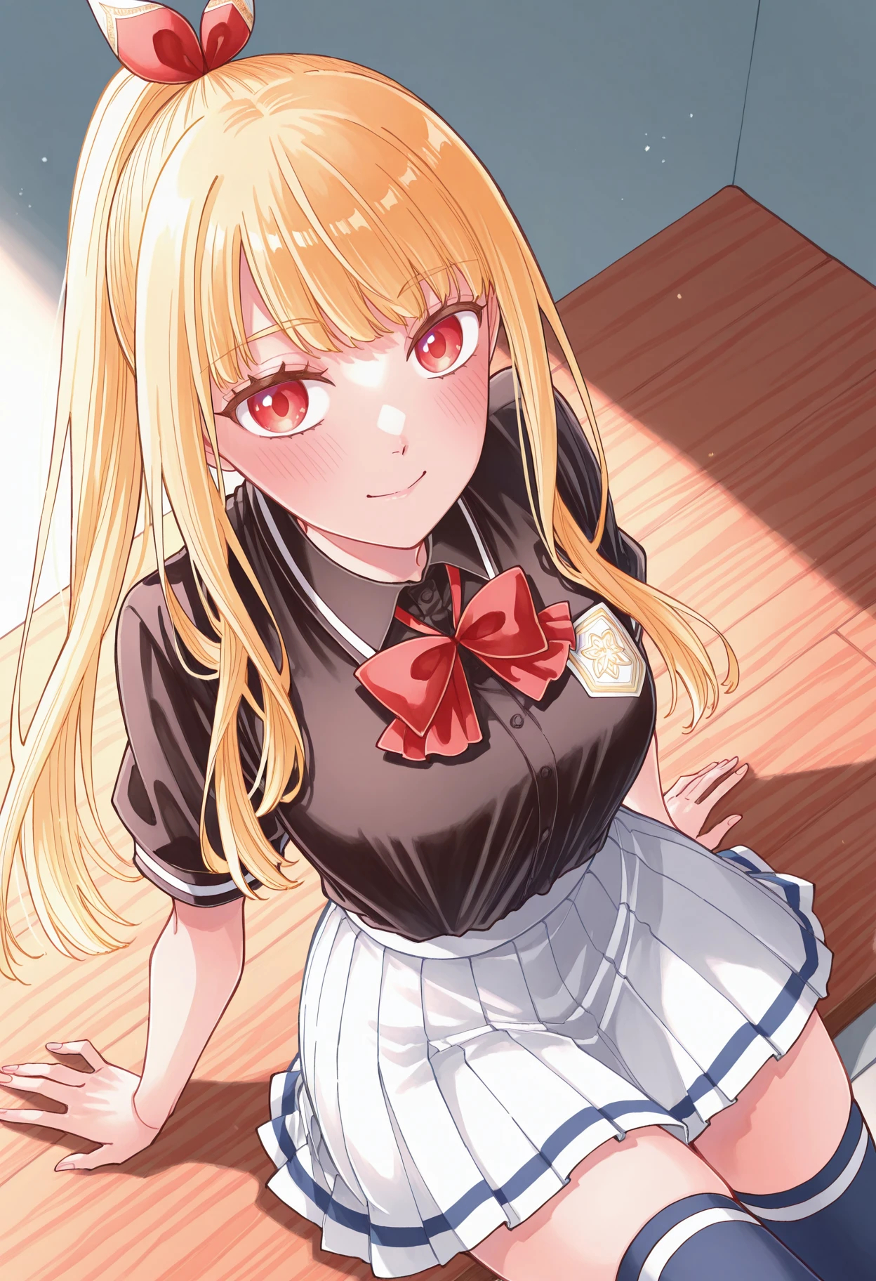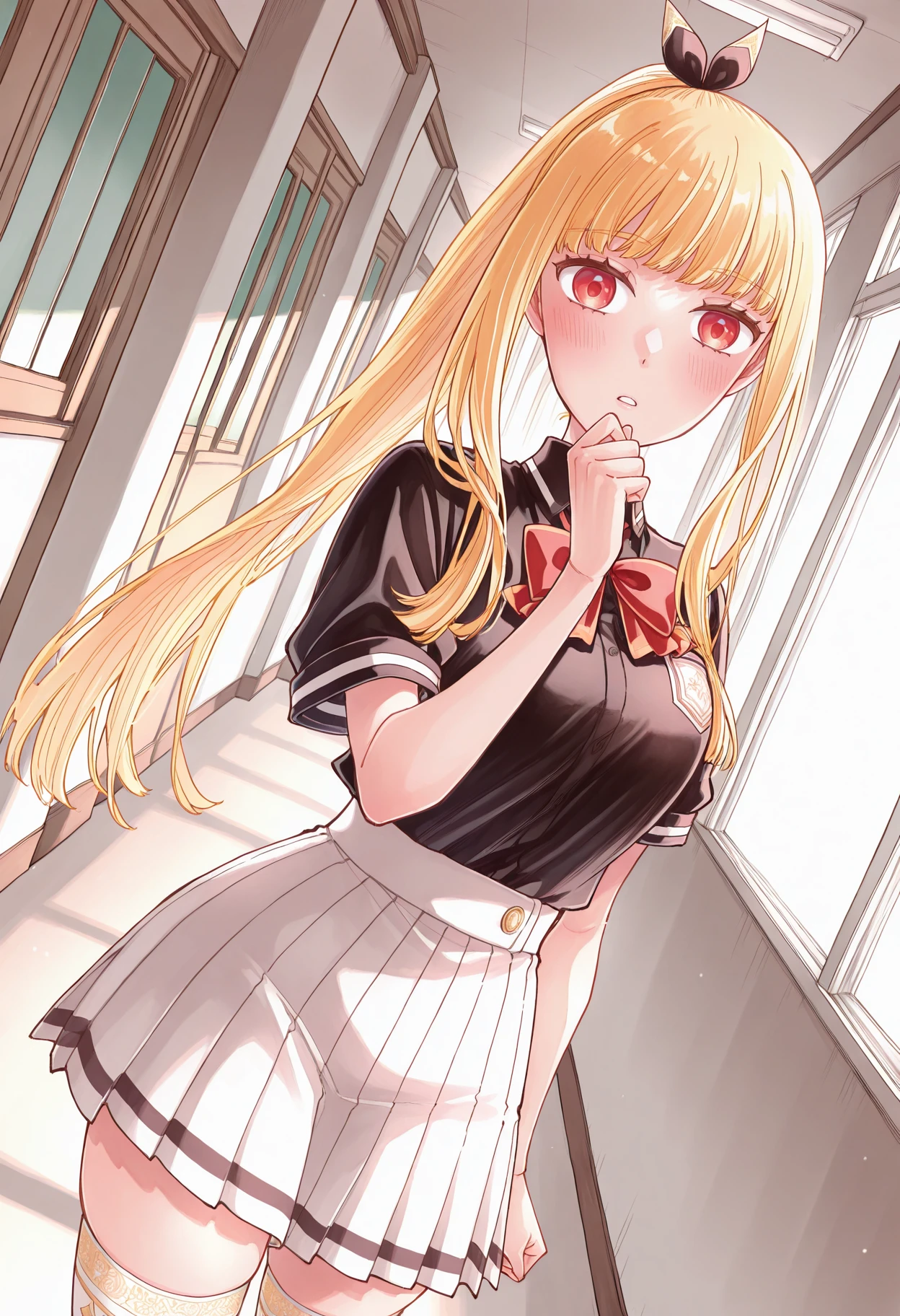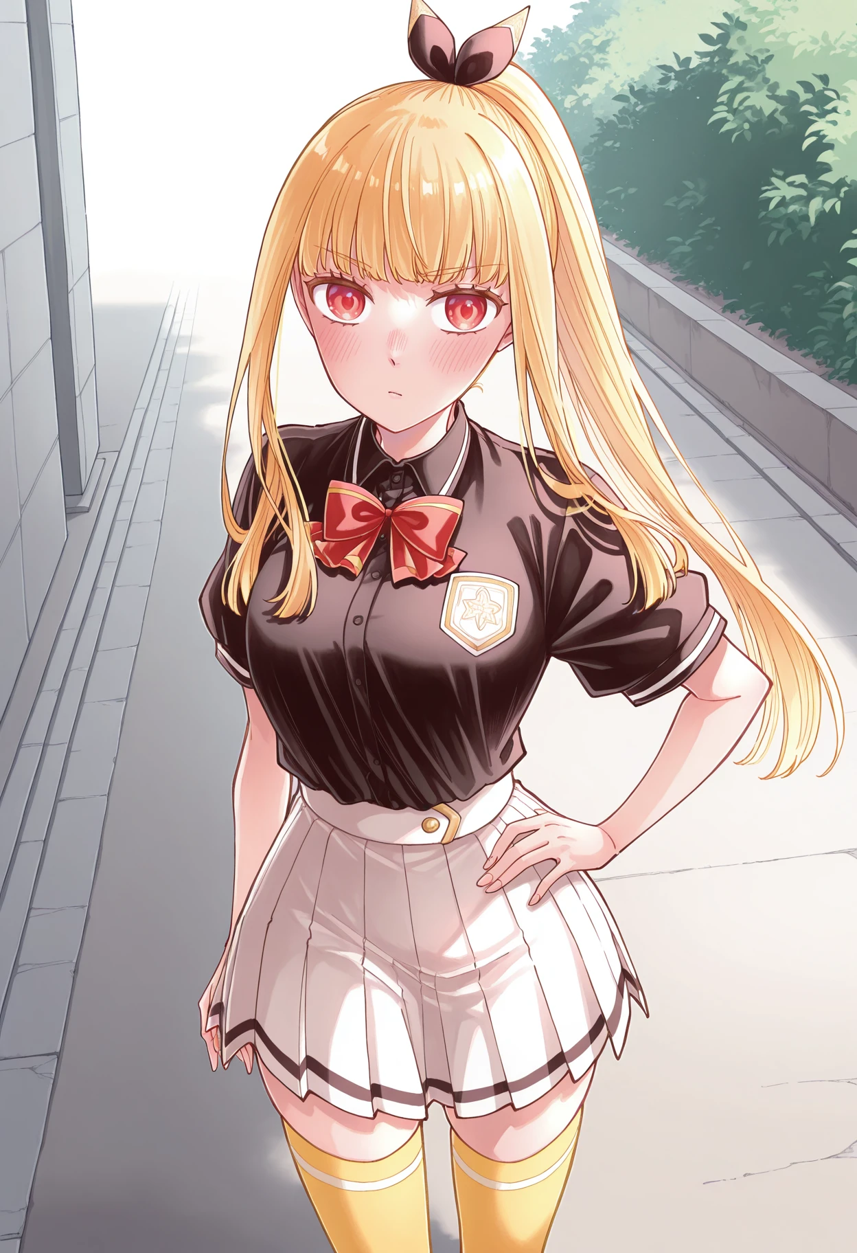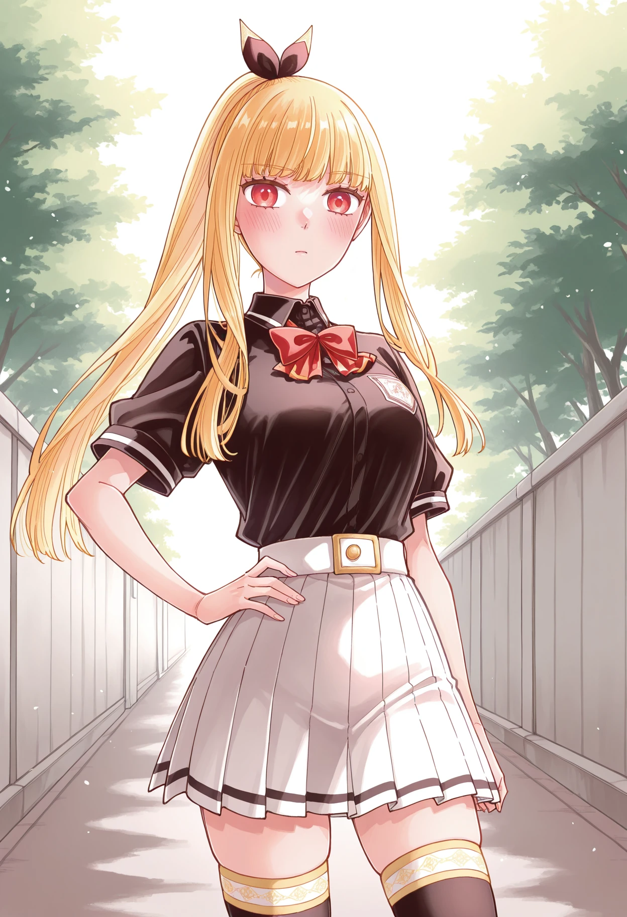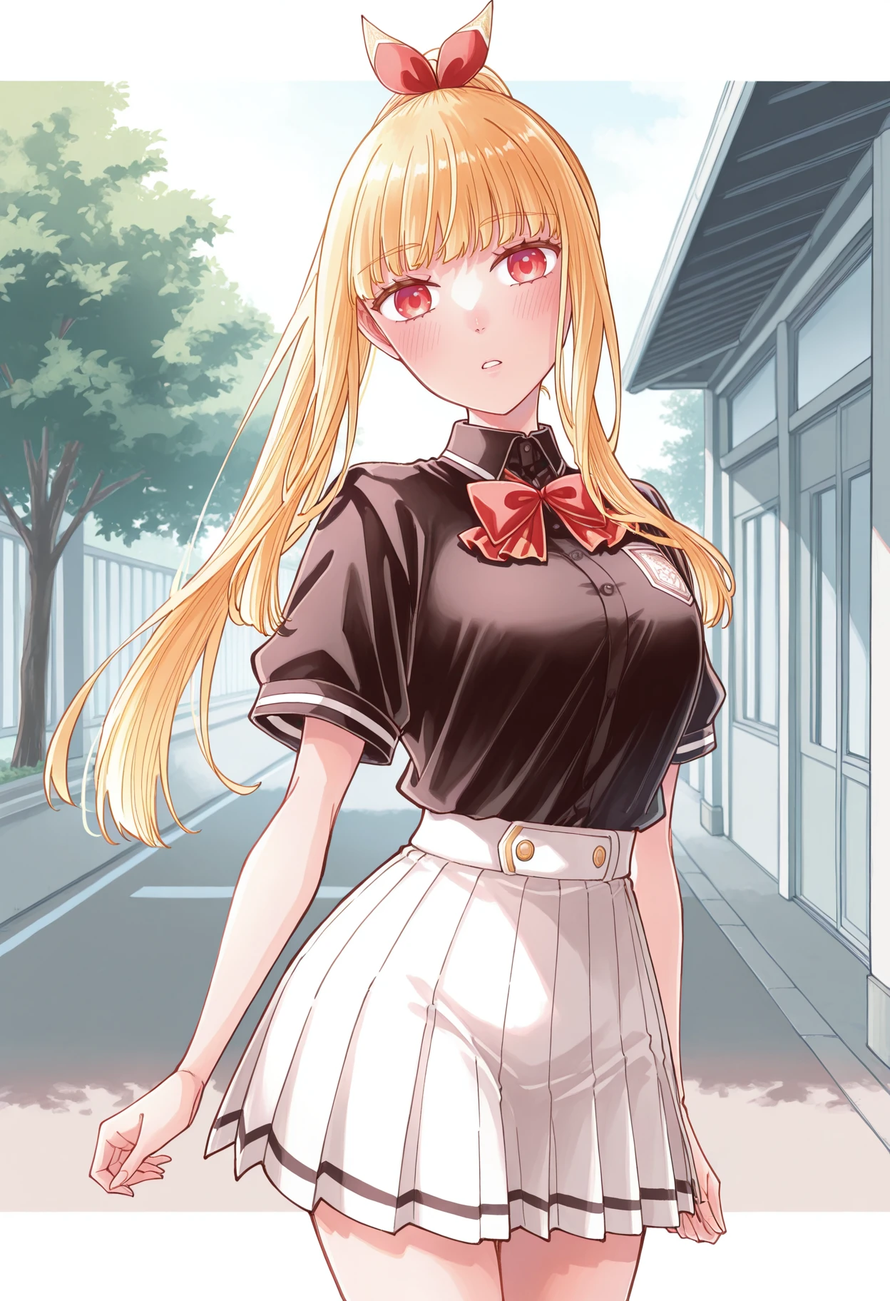 svmssak, long hair, blonde hair, red eyes, hair ribbon, ponytail,