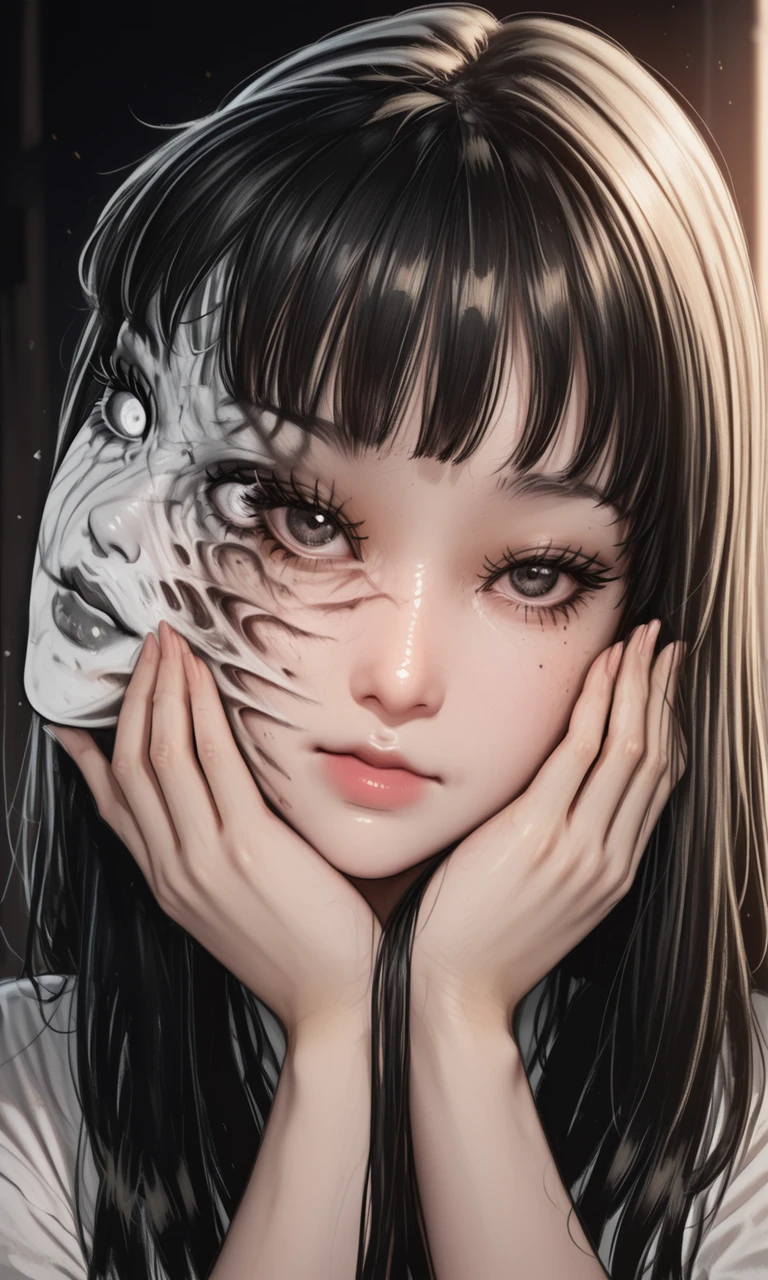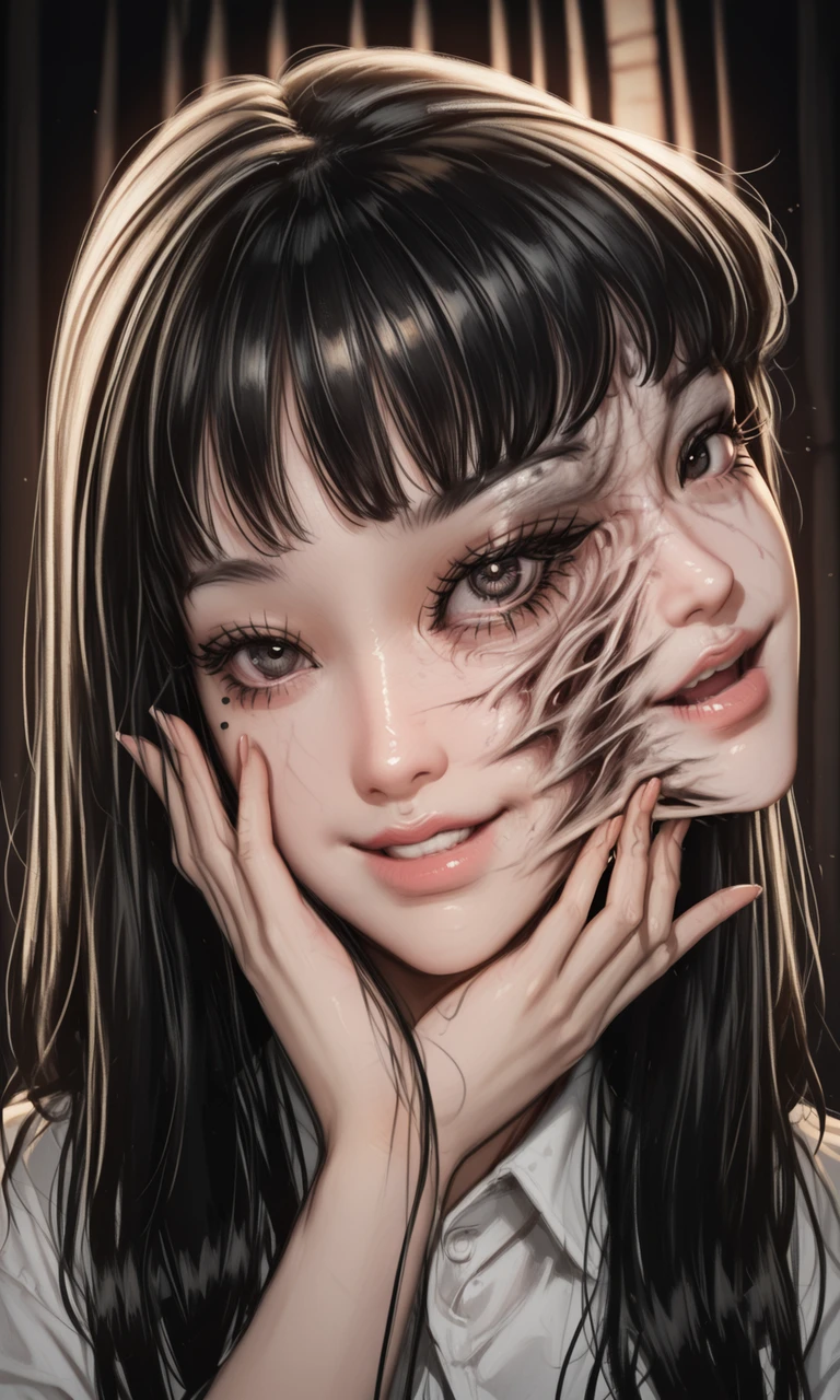 For the split face, add 'split face, mutated face', but be careful about tags like '1girl' or 'solo' especially with embeddings because it will cause her face not to mutate as the 1girl tag gets confusing with 2 faces and embeddings usually try to stop a mutated face from happening.