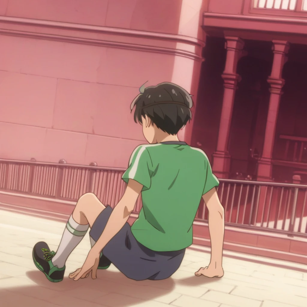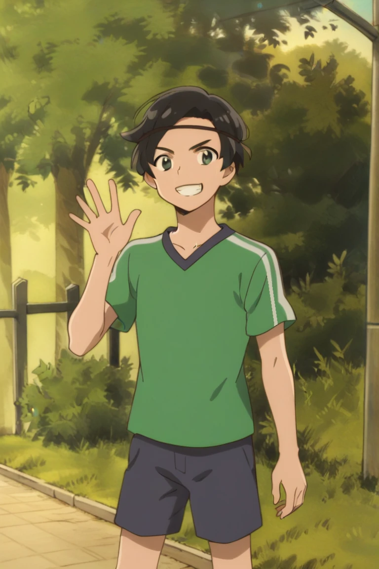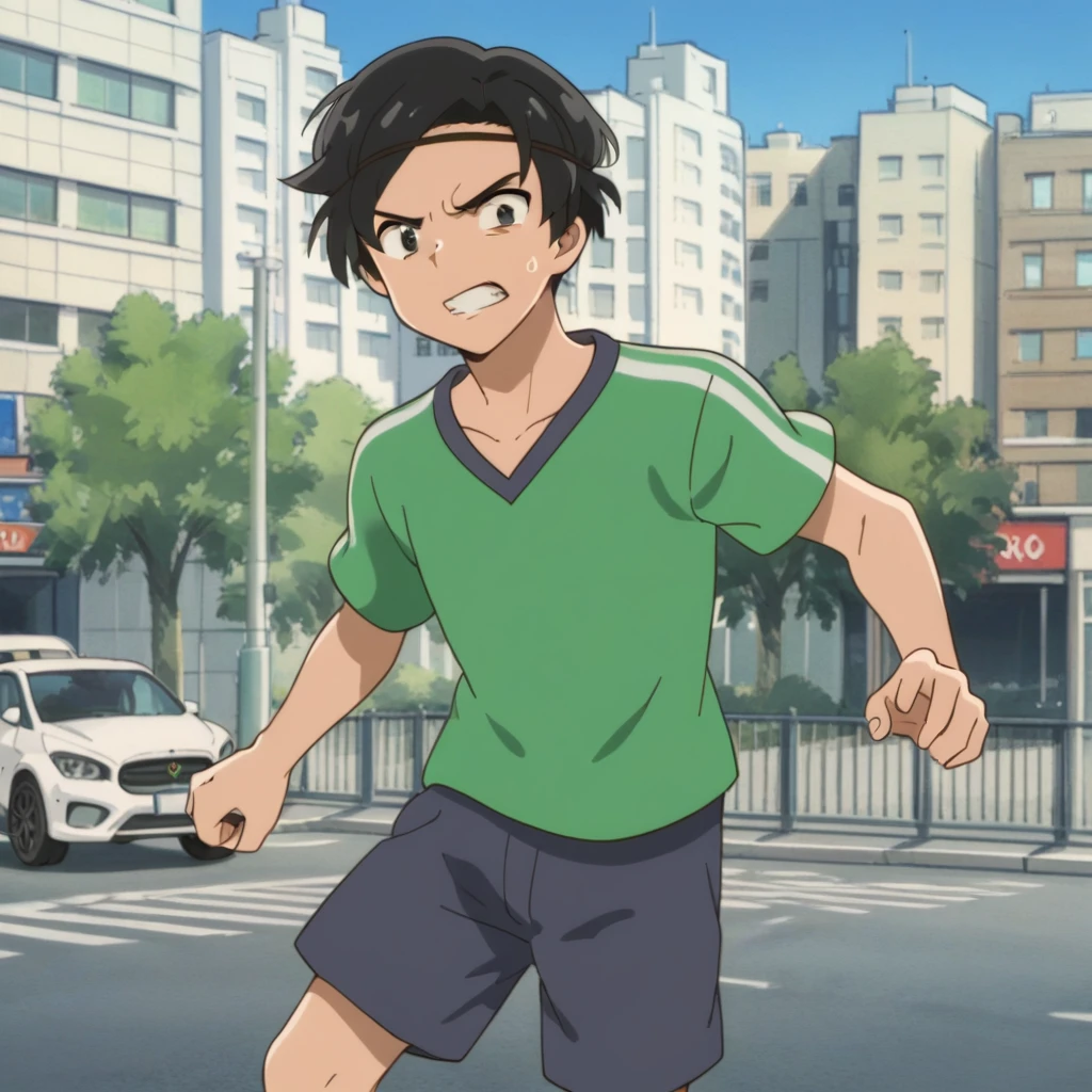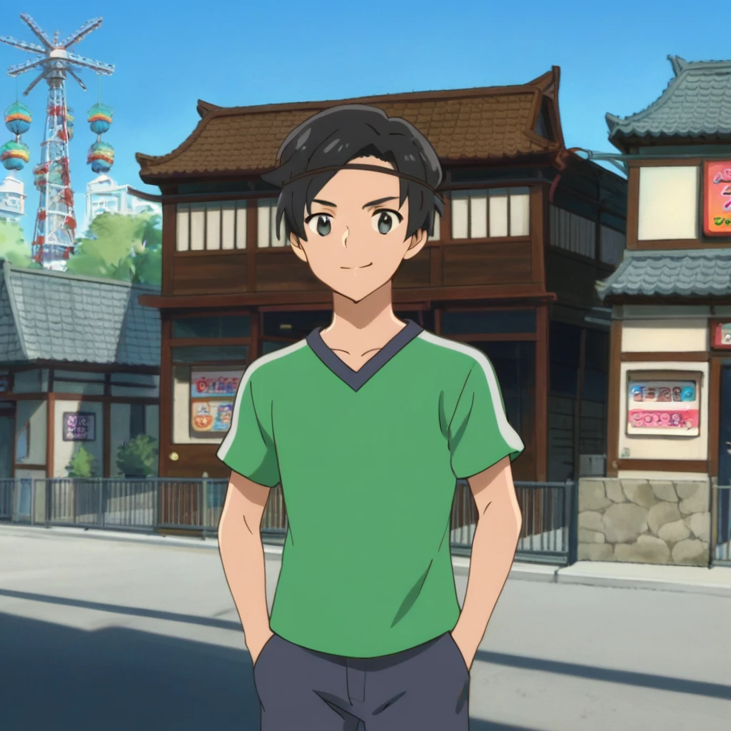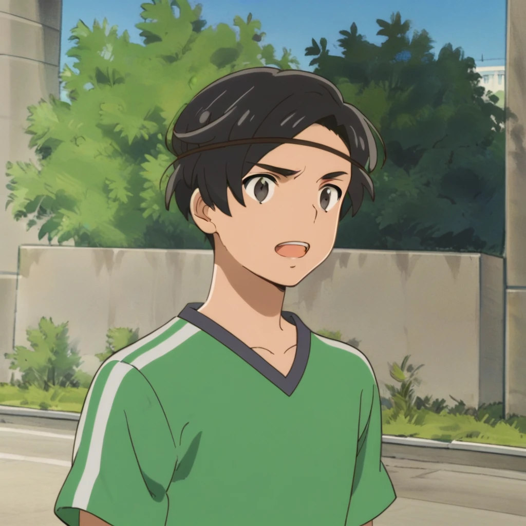 Prompts: male, black hair, headband, multicolored eyes, black eyes, soccer uniform, sportswear, green shirt, shorts, socks, shoes, outdoors (river/sky/railing/bridge/buildings in distance/trees in distance), outdoors (park/tree/bush/fence), outdoors (city/blue sky/building/sign/lamppost/tree/road/crosswalk/car), outdoors (amusement park/blue sky/east Asian architecture/entrance/sign/amusement park ride/power lines), outdoors (house/window/gate/tree/bush/grass/table/chair)