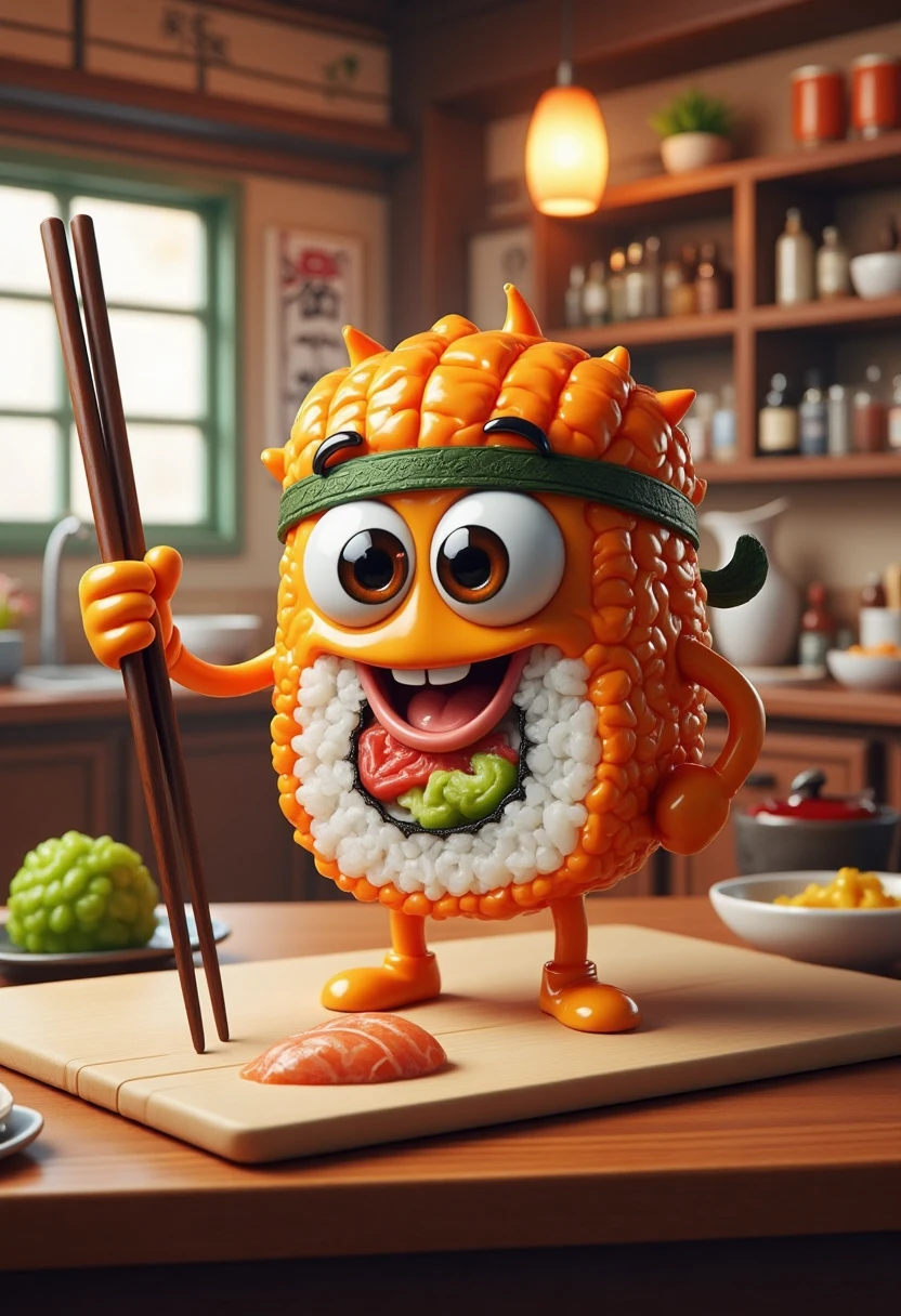 Food anthropomorphism, clever sushi with a headband, holding chopsticks, teaching, in a traditional Japanese restaurant.