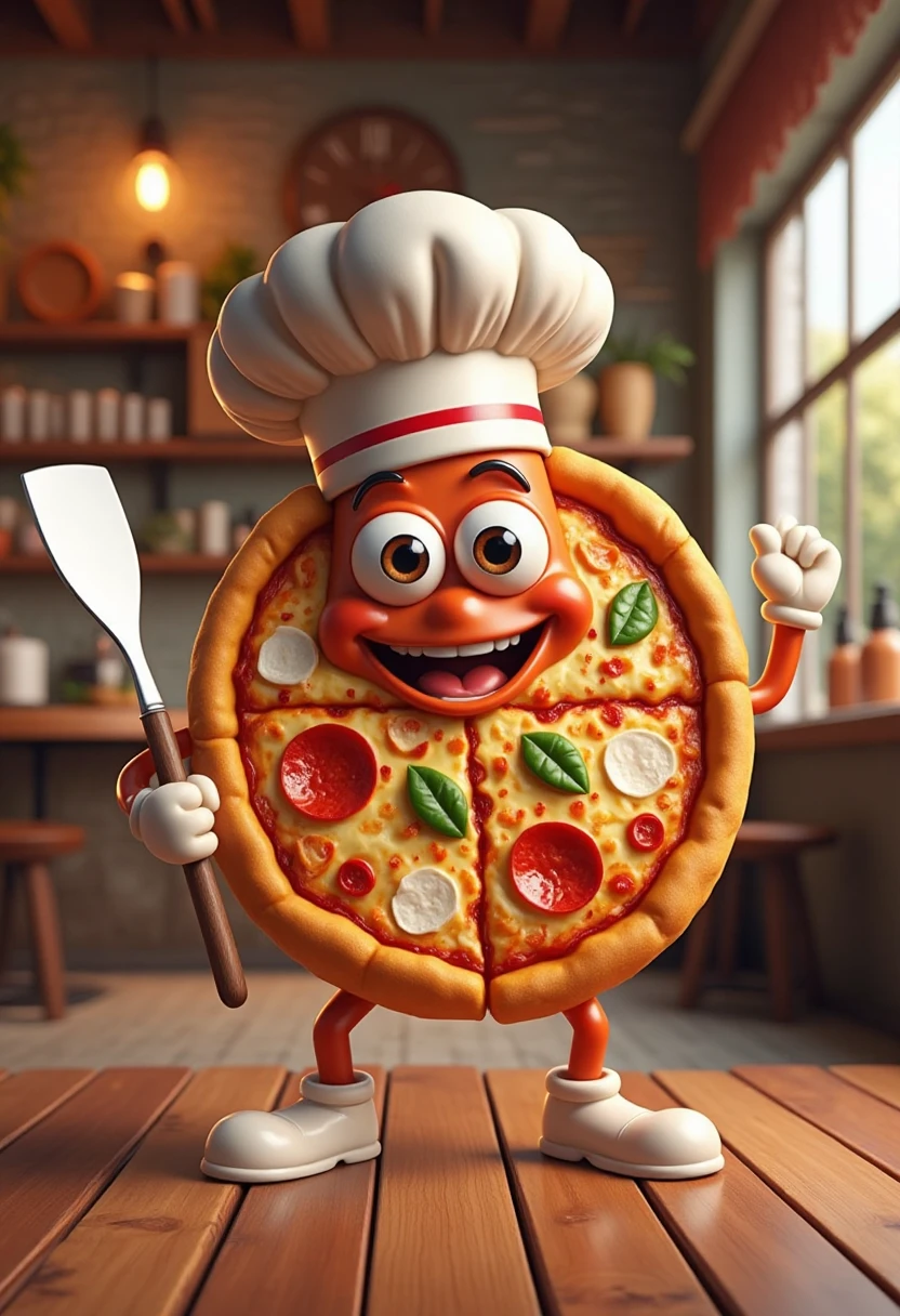 Food anthropomorphism, cute pizza with arms and legs, wearing a chef hat, holding a spatula, smiling, in a cozy pizzeria background.