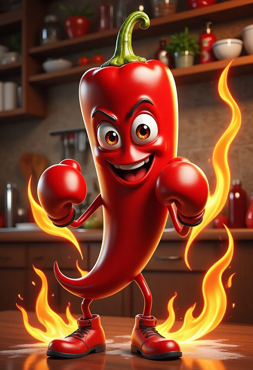 Food anthropomorphism, tough chili pepper with a fiery aura, boxing gloves, standing in a spicy kitchen, flames around.