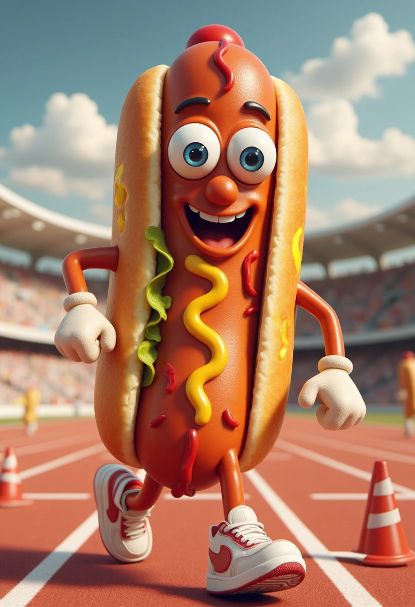 Food anthropomorphism, sporty hot dog with sneakers, running, on a track, mustard and ketchup as lane markers.