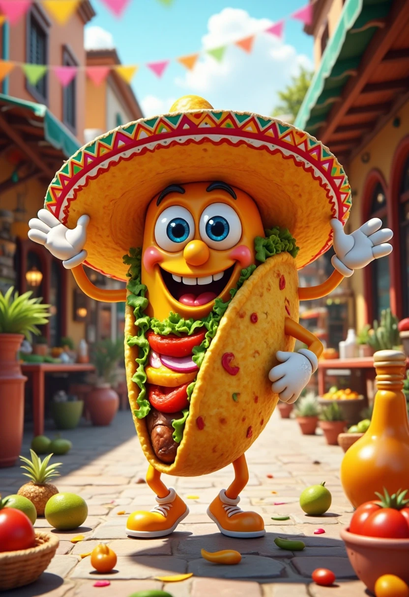 Food anthropomorphism, funny taco with a sombrero, dancing, colorful ingredients as confetti, lively Mexican market scene.
