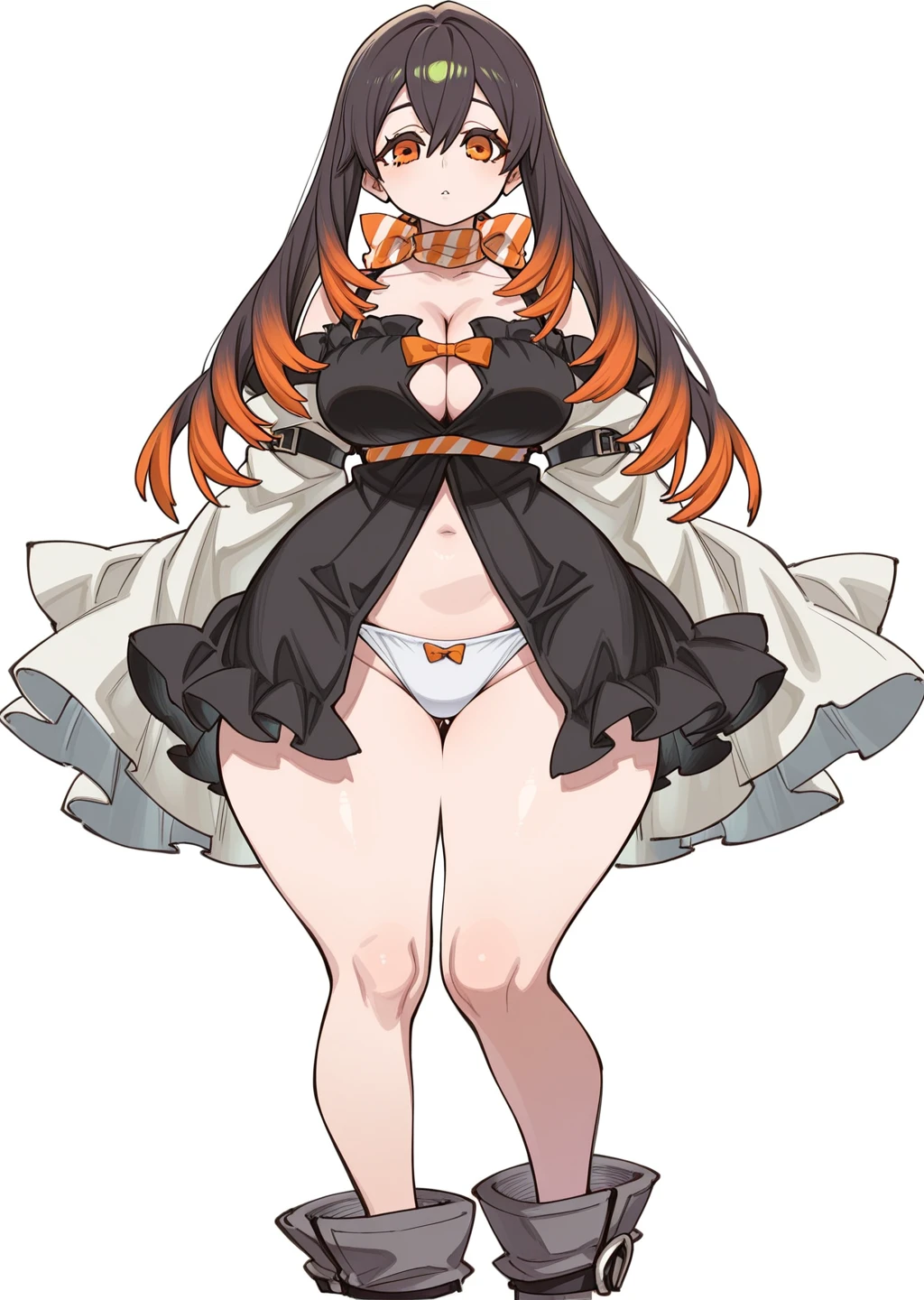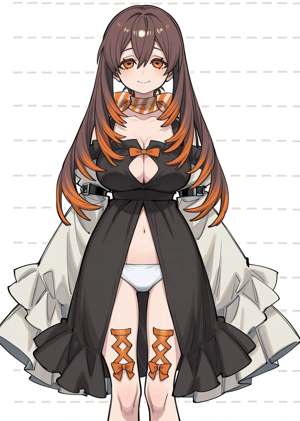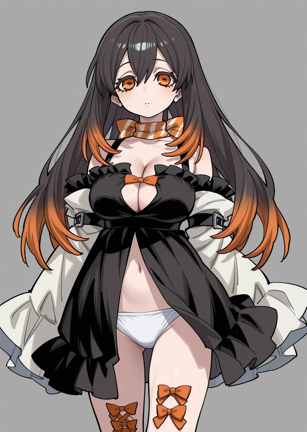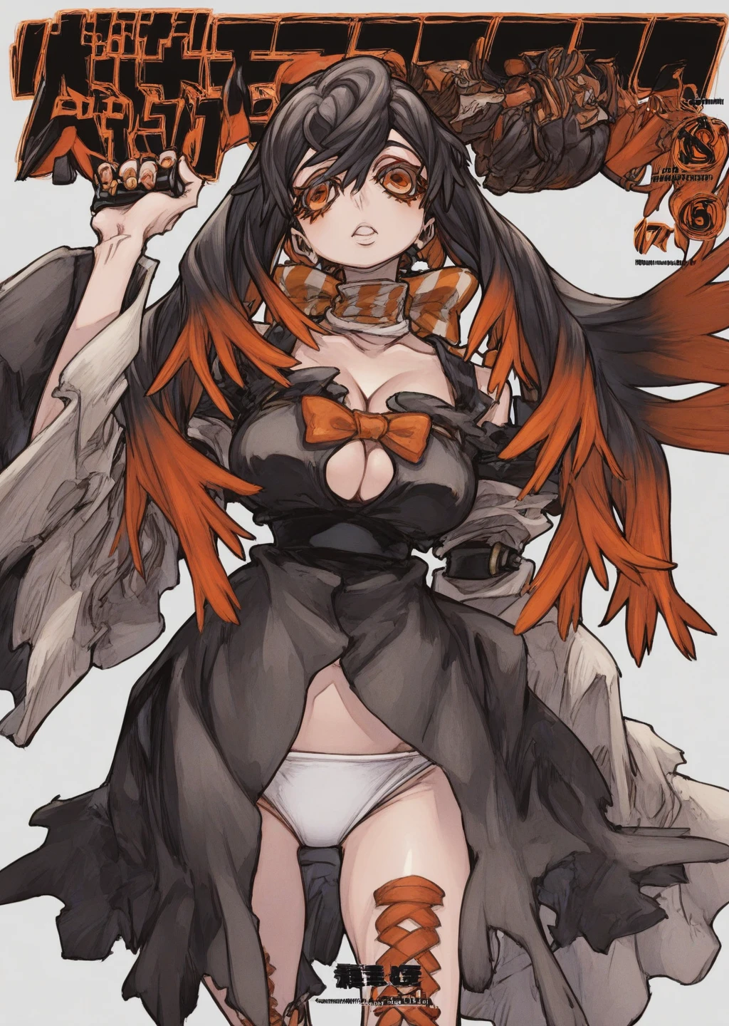 Prompt: amo, gachiakuta, brown and orange hair, gradiant hair, orange eyes, cleavage, long hair, white panties, orange bow, black dress,