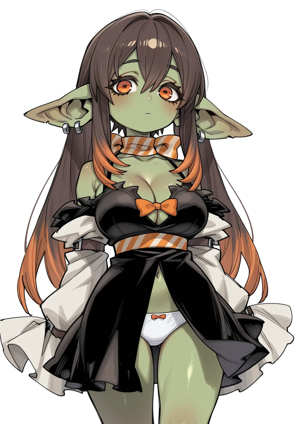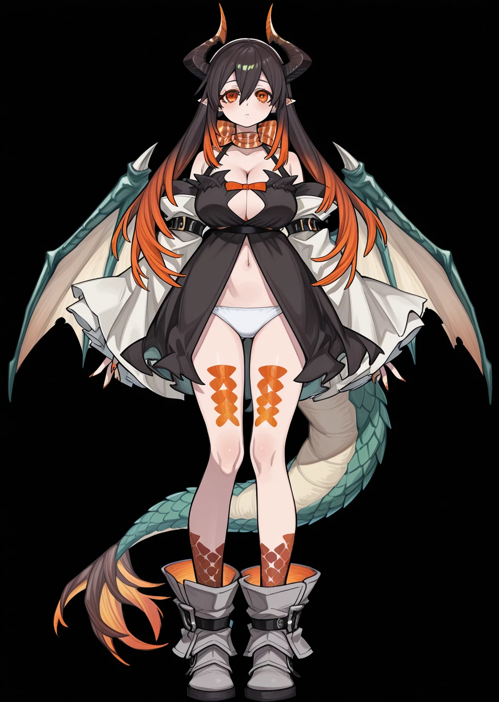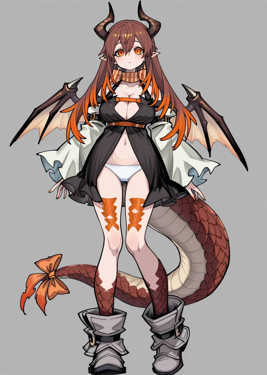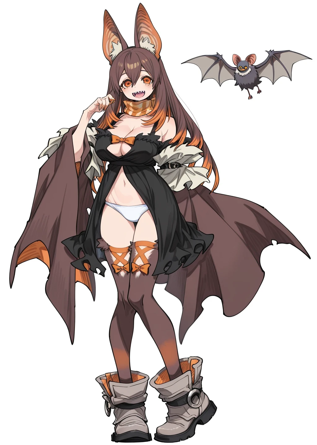 Prompt: amo, gachiakuta, brown and orange hair, gradiant hair, orange eyes, cleavage, long hair, white panties, orange bow, black dress,