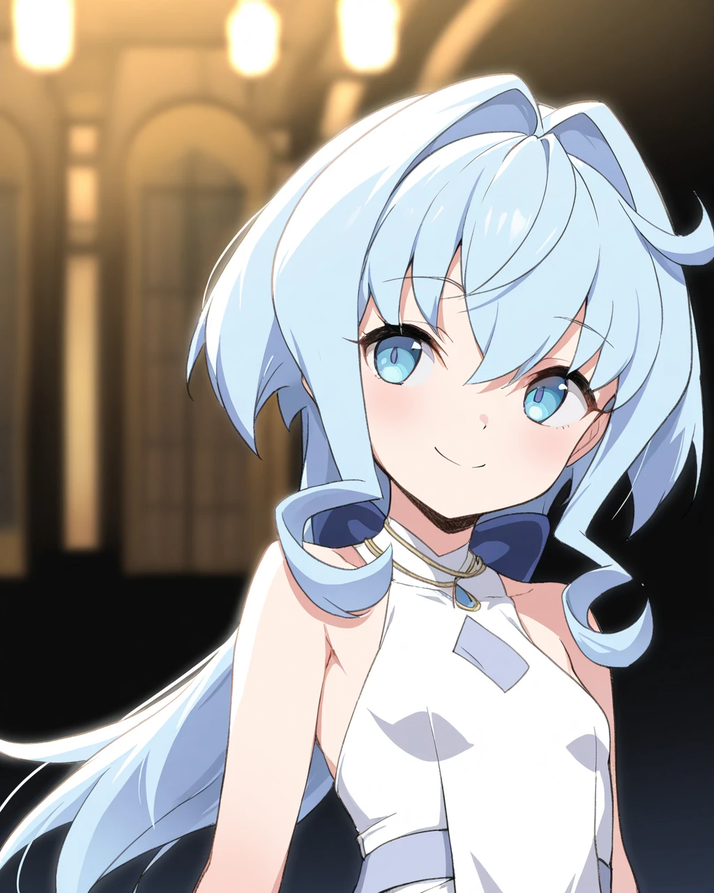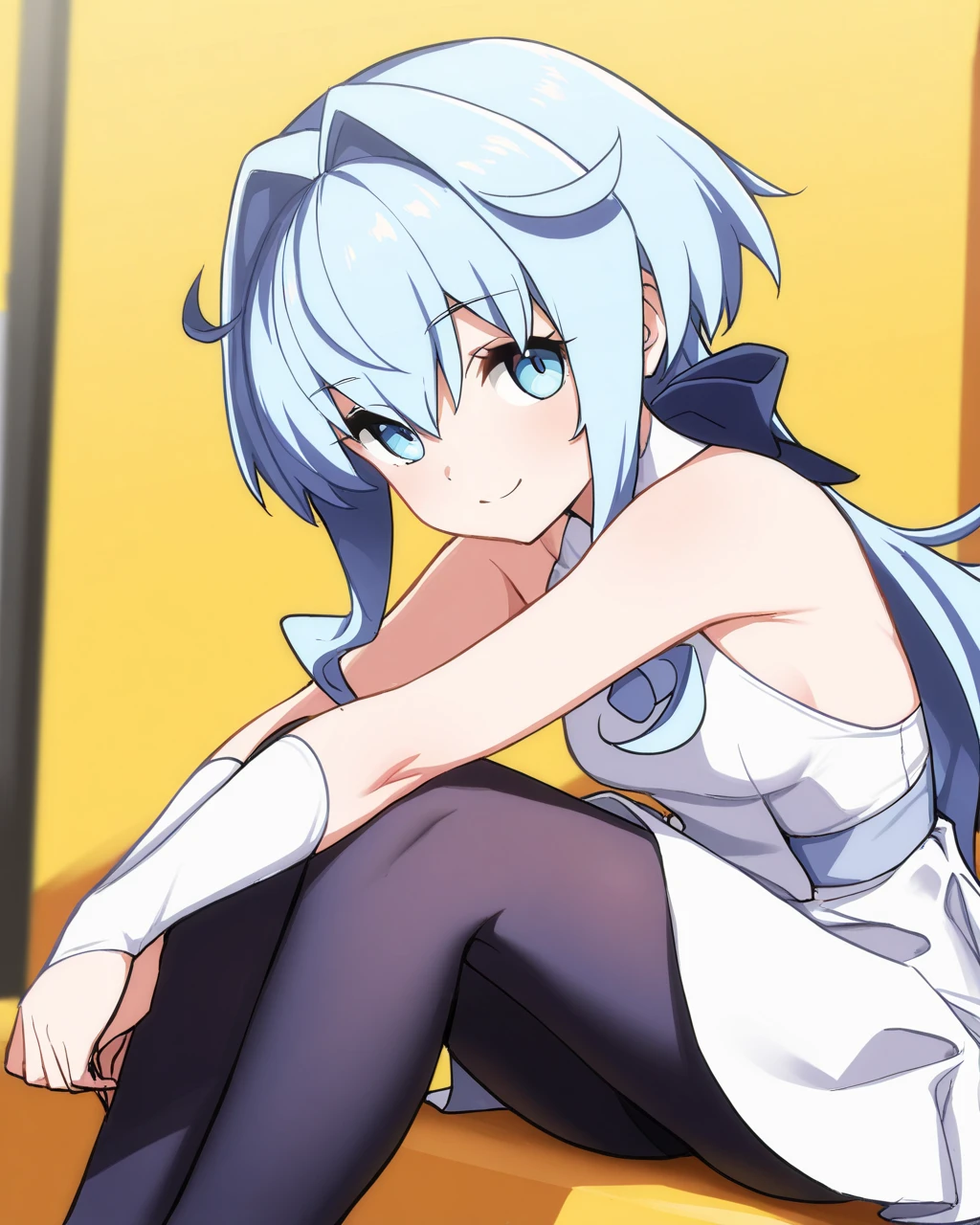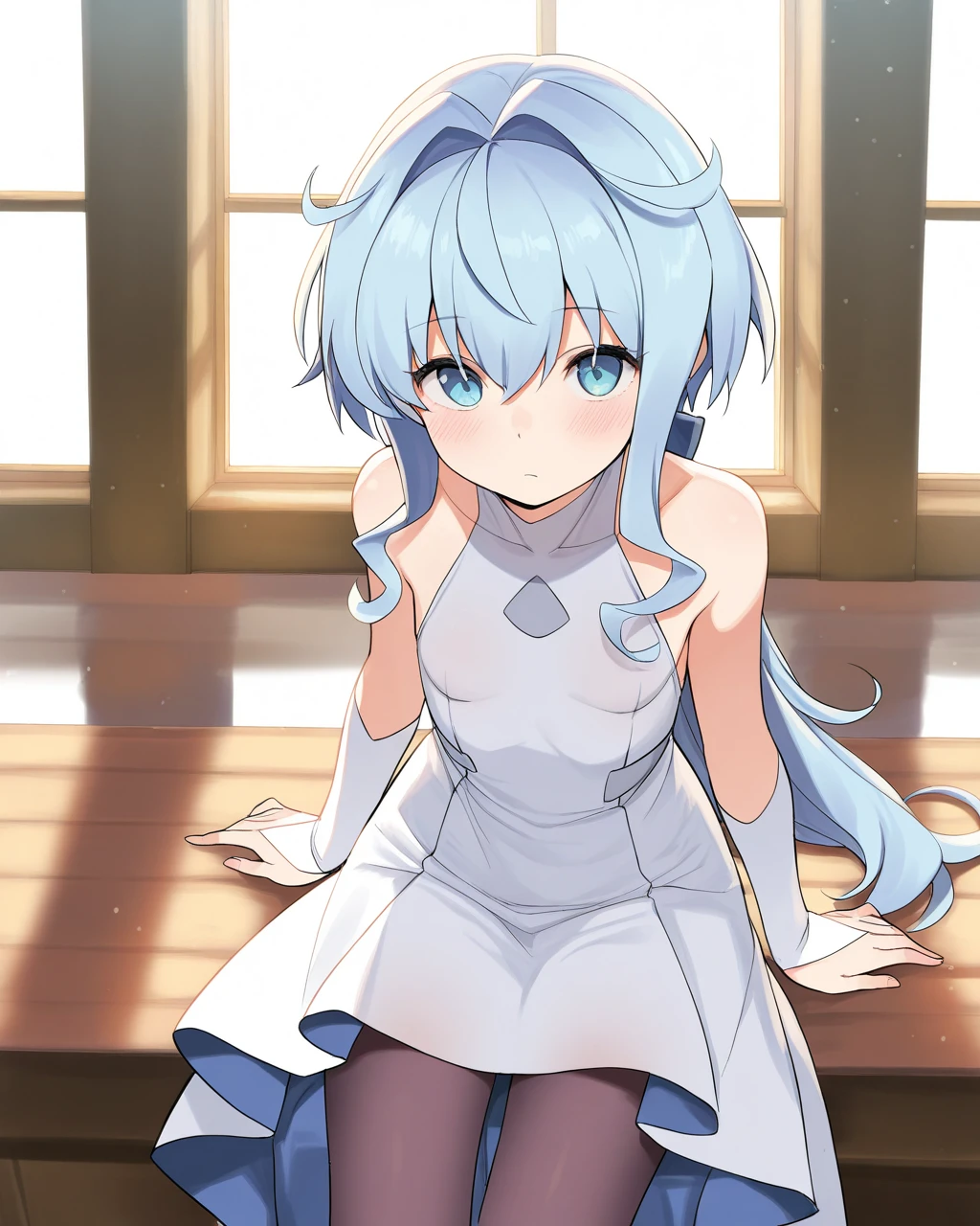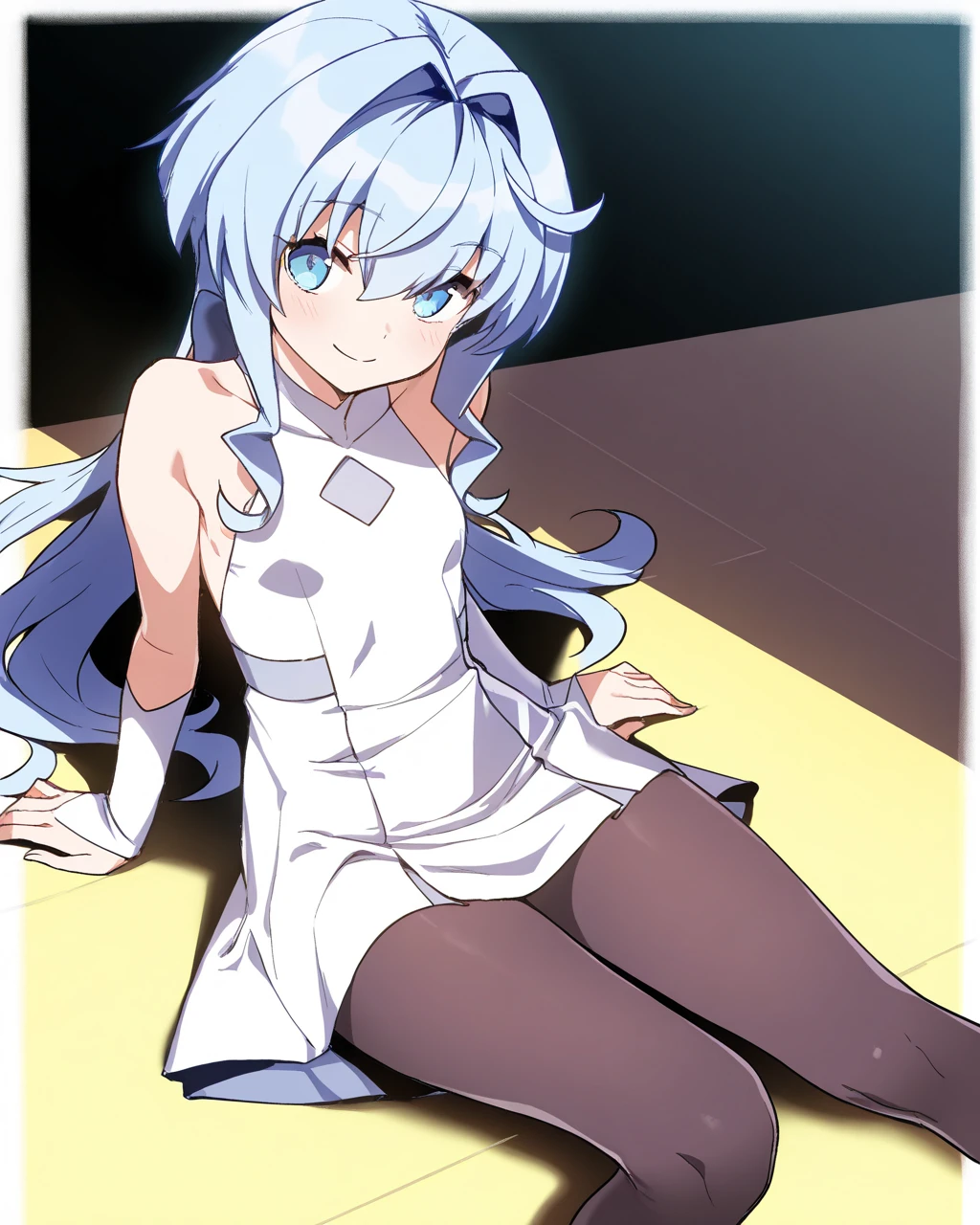 sala,1girl, solo, blue eyes, blue hair,long hair,white dress, hair intakes, sleeveless dress,pantyhose,
