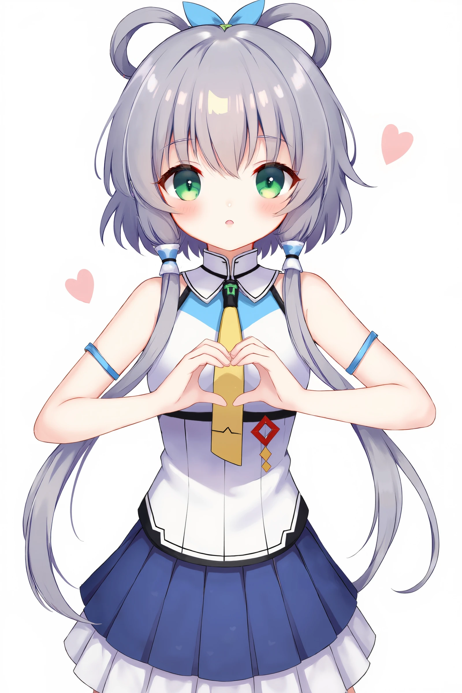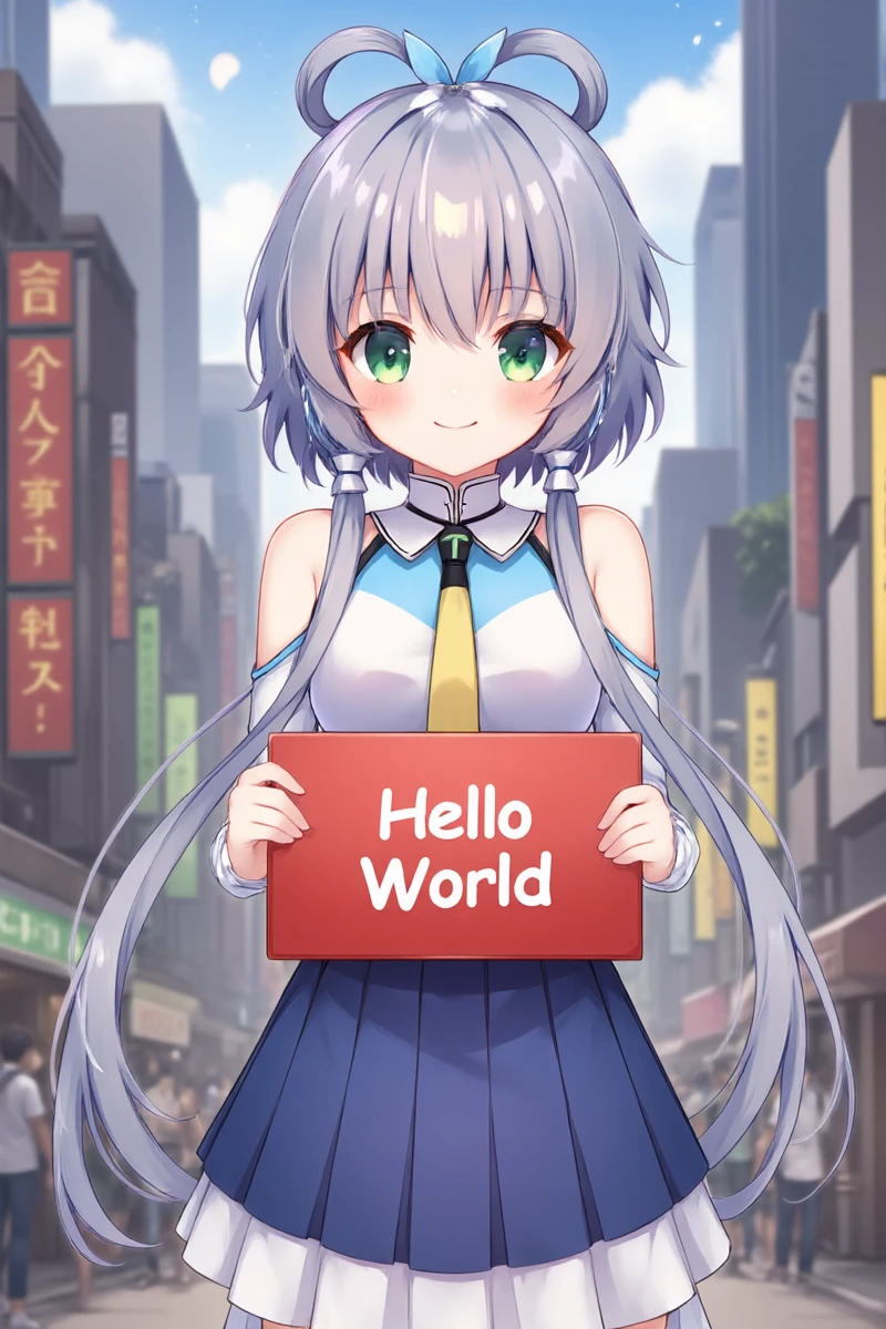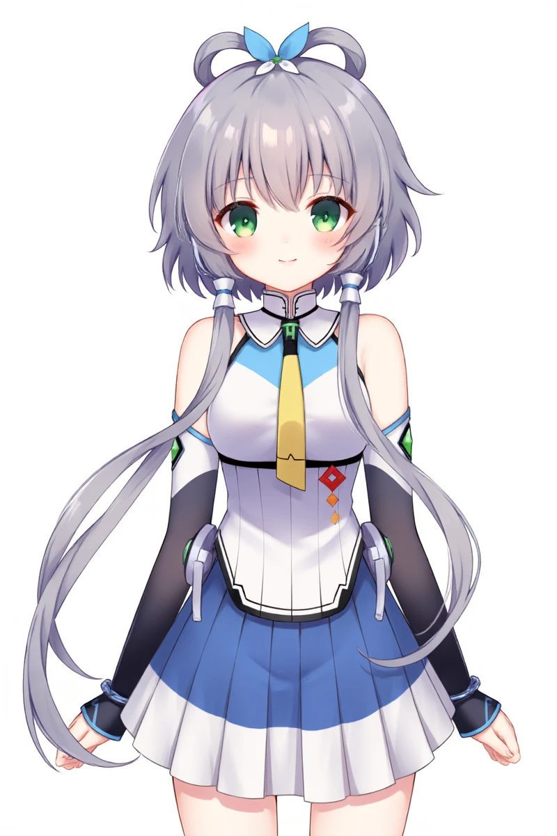luotianyi, green eyes, grey hair, hair ornament, hair rings, short hair with long locks, hair tubes, 保留头部以及衣服的建议提示词: