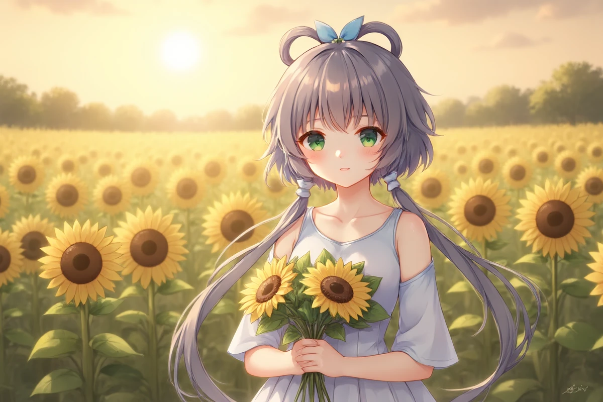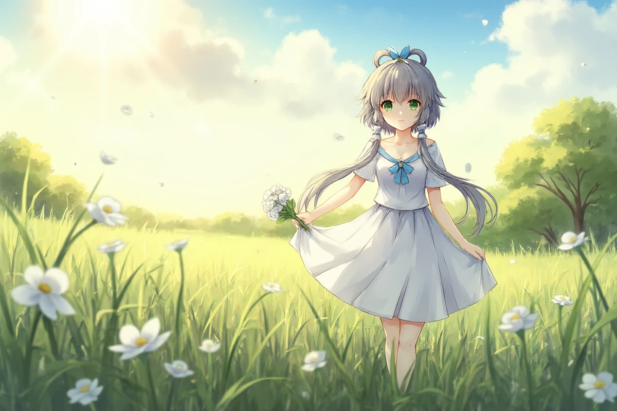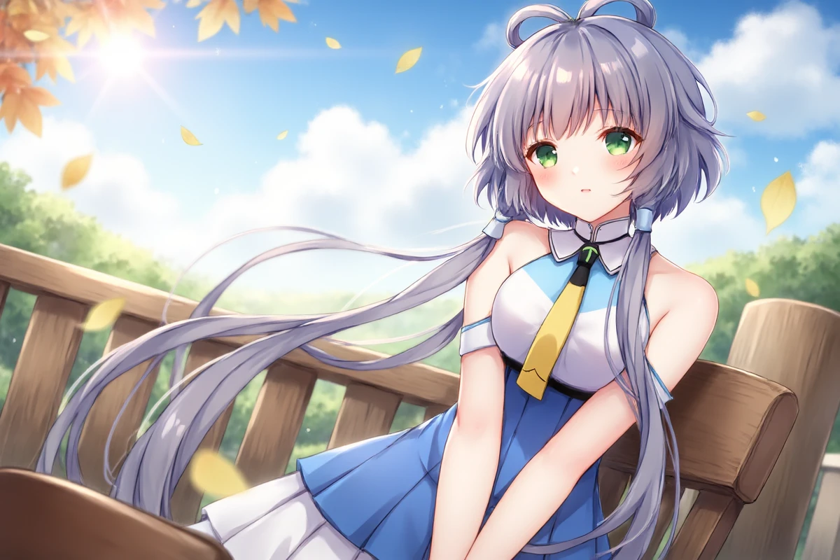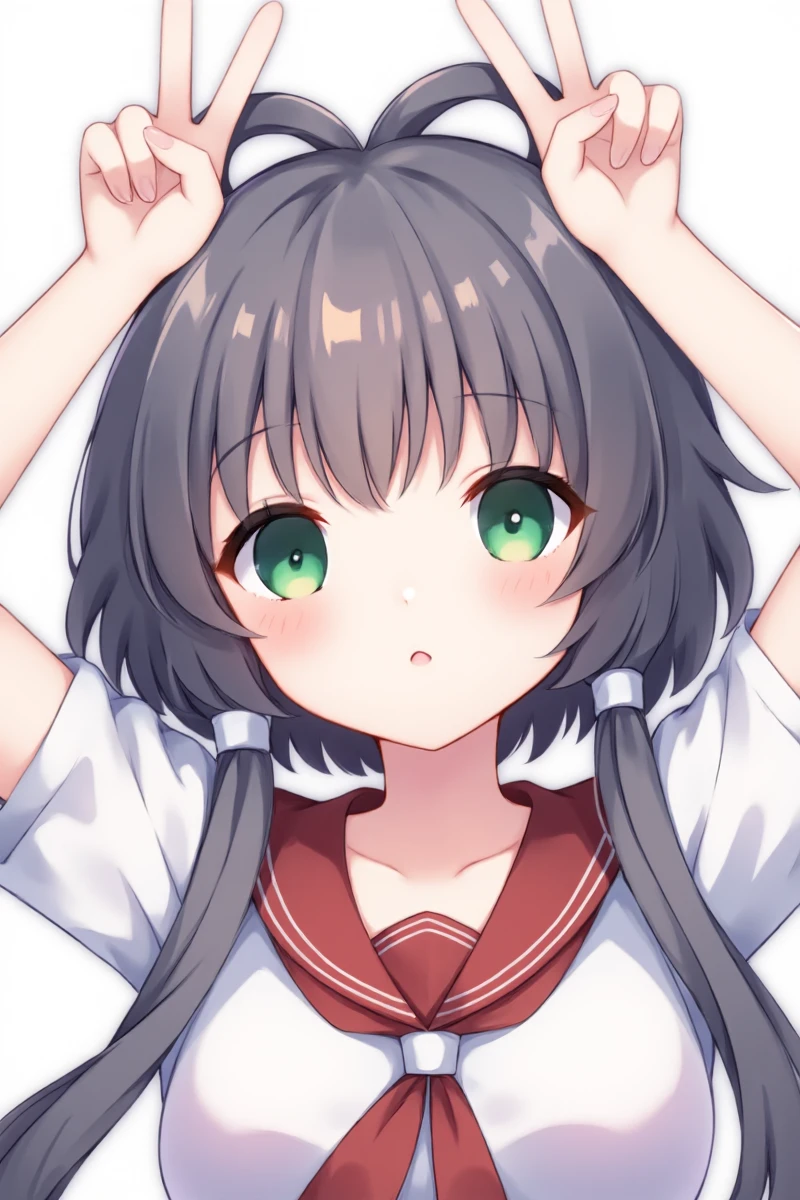 luotianyi, green eyes, grey hair, hair ornament, hair rings, short hair with long locks, hair tubes, 保留头部以及衣服的建议提示词: