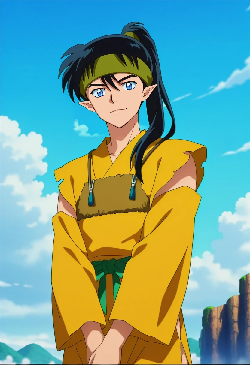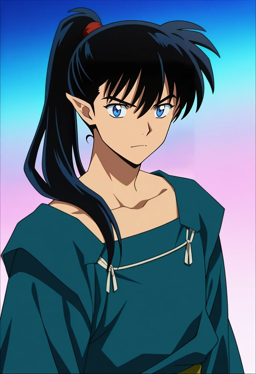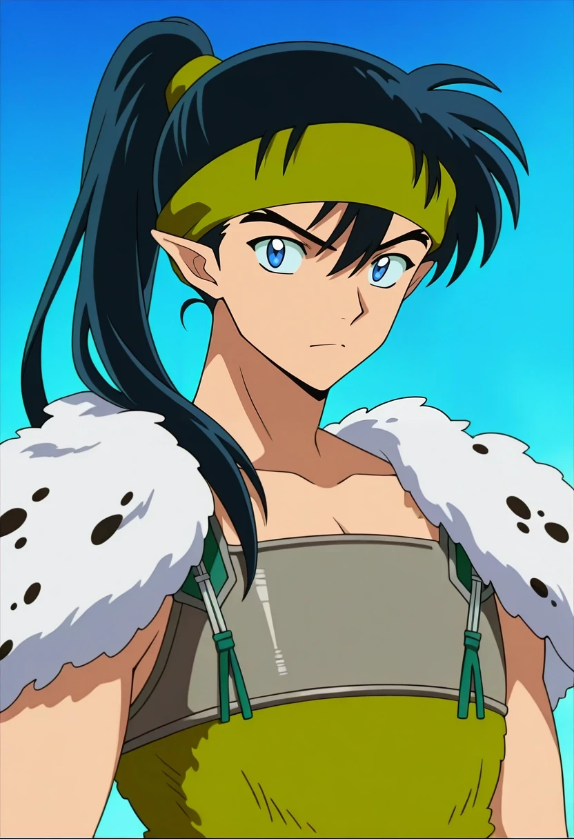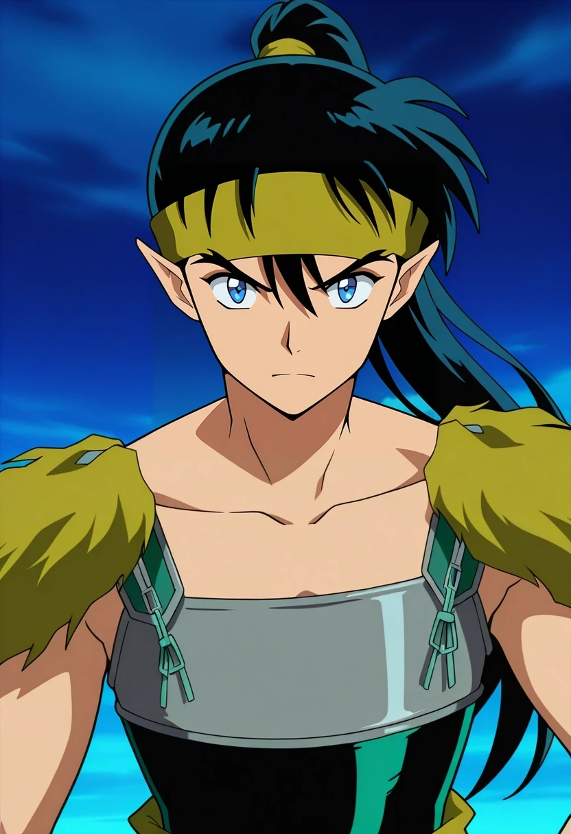 kouga_inuyasha, black hair, blue eyes, long hair, ponytail, pointy ears